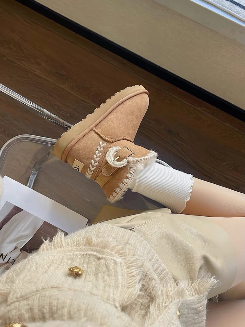 2025年冬新作 ファー一体型編み込みバックル付き厚底ウールブーツ ショートコットンシューズ 保温スノーブーツ レディース