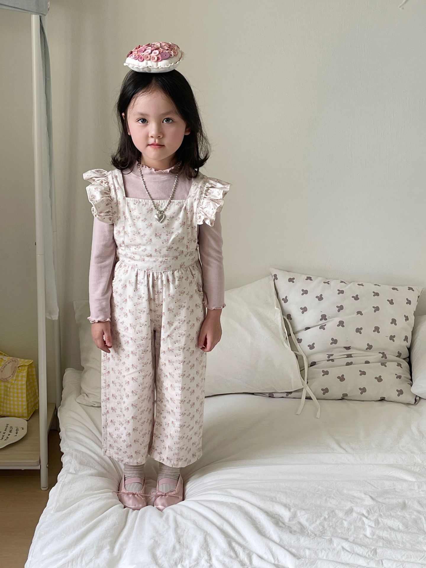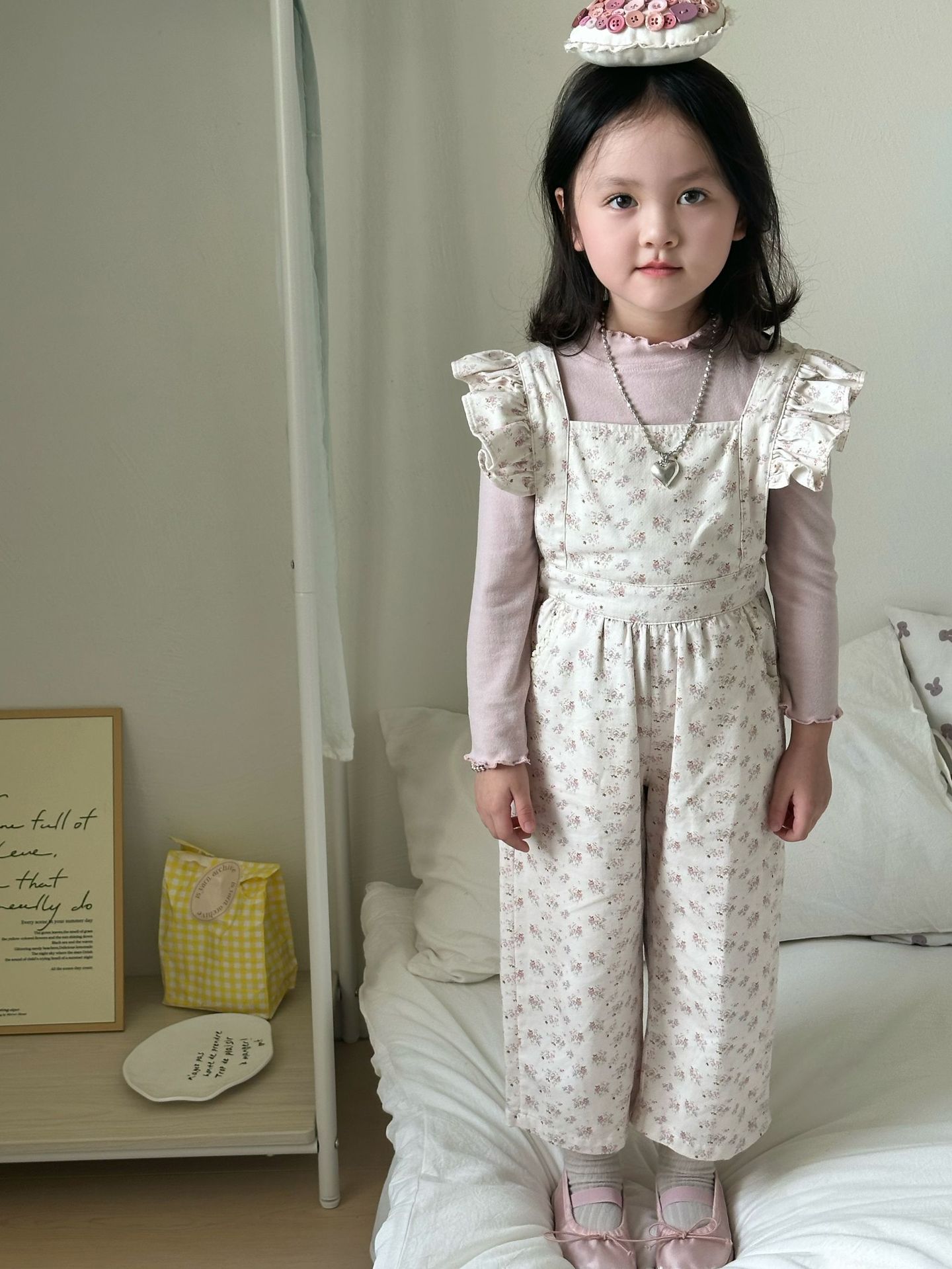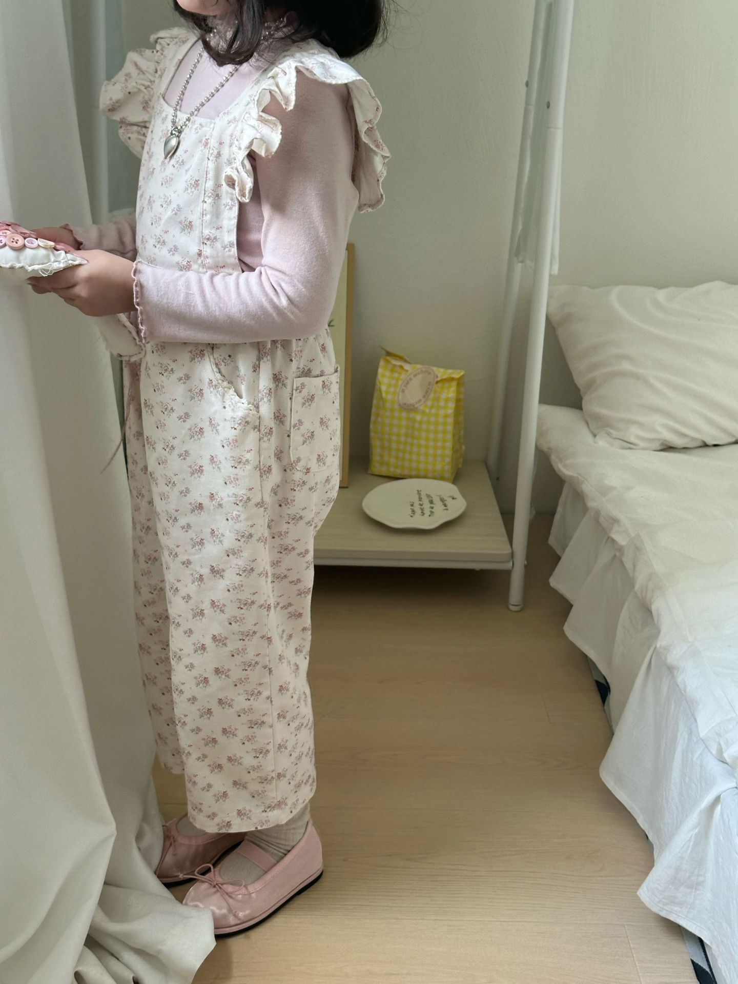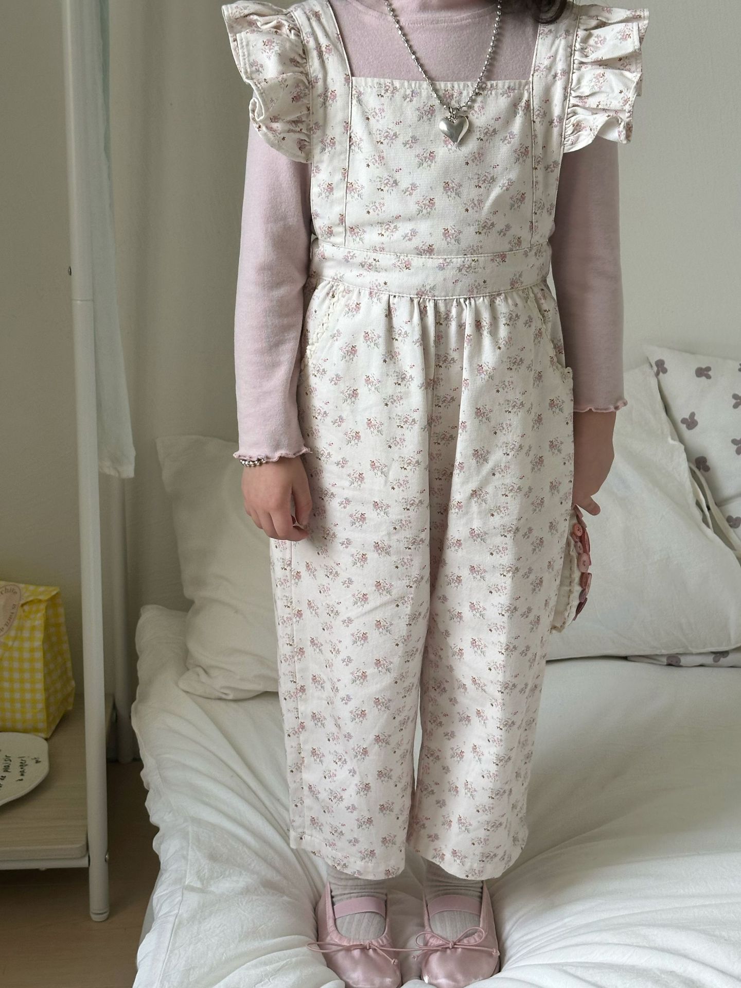 ピンクの花柄オーバーオール