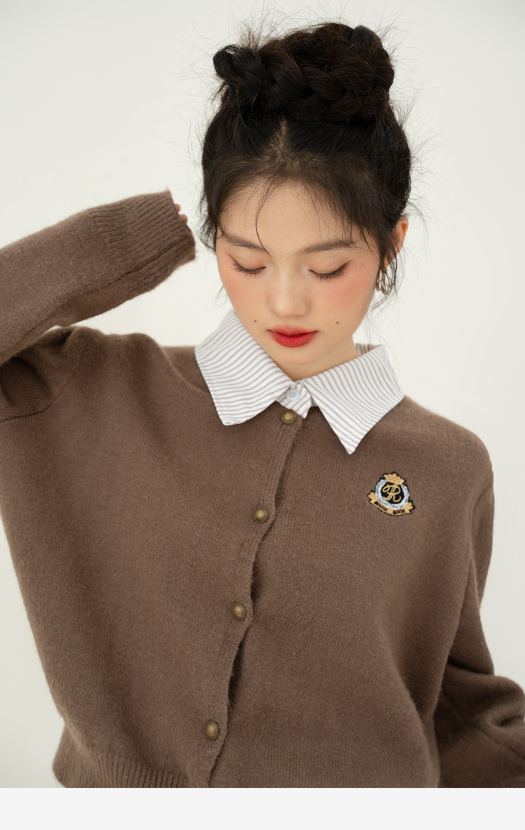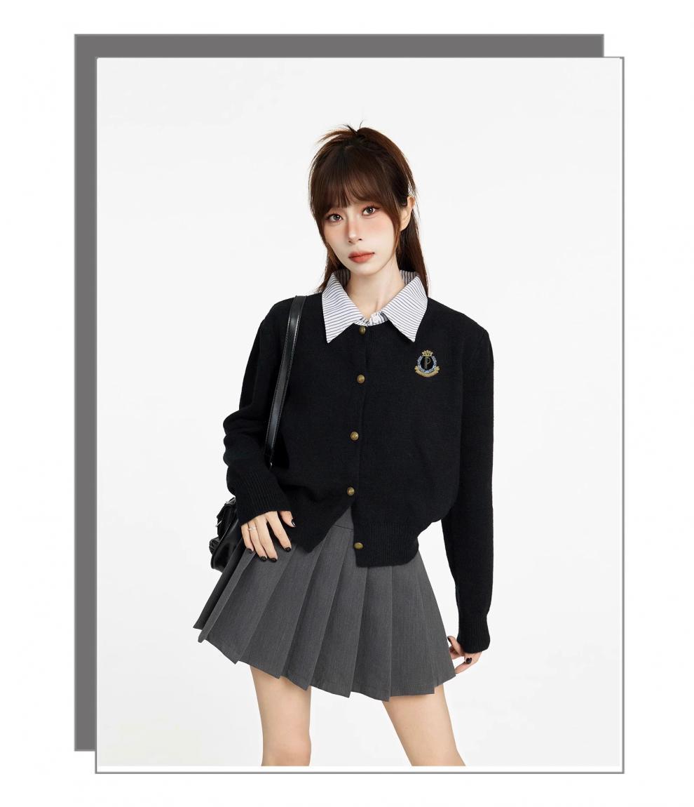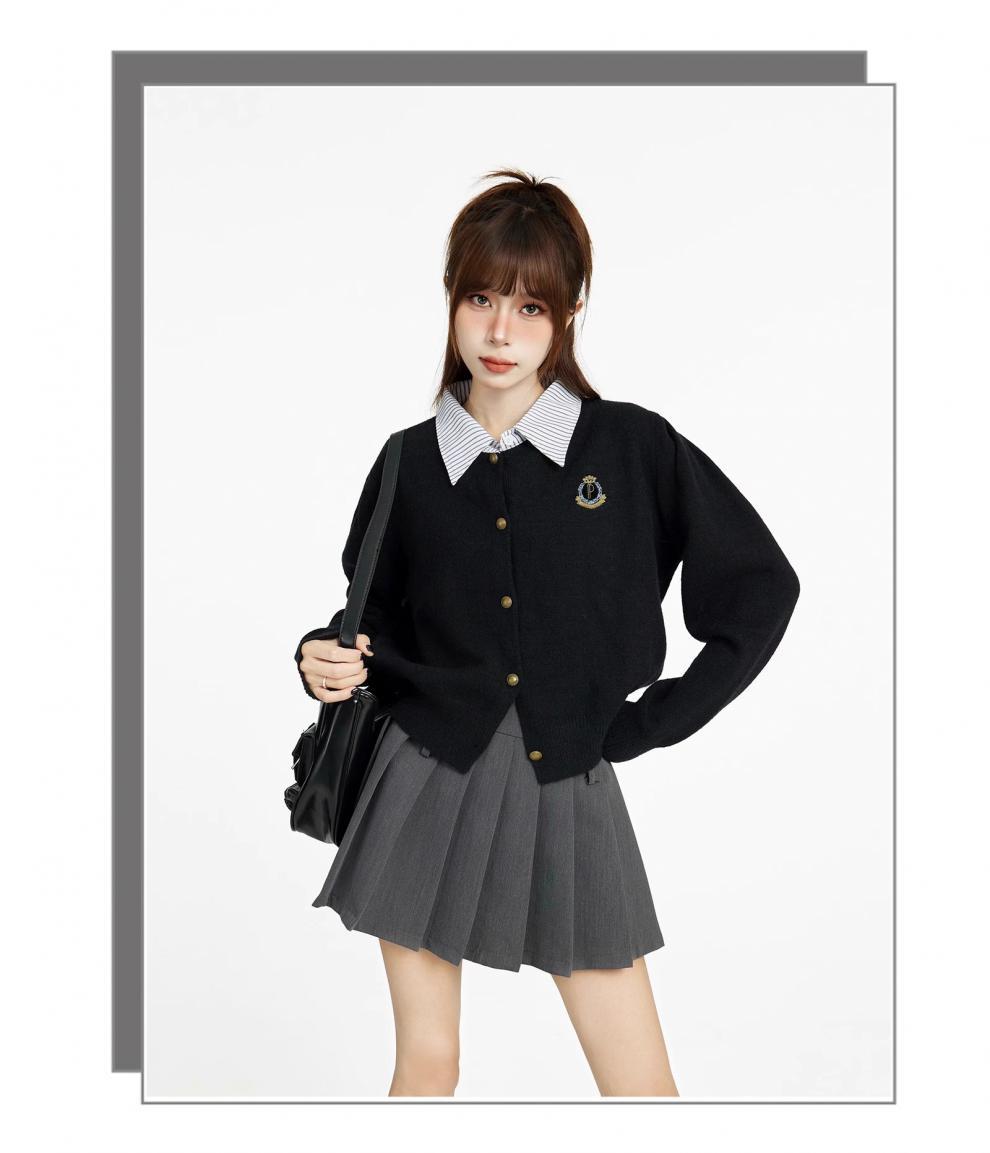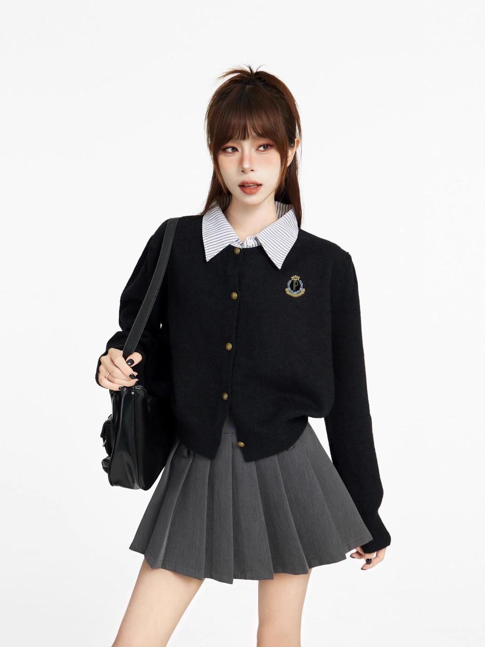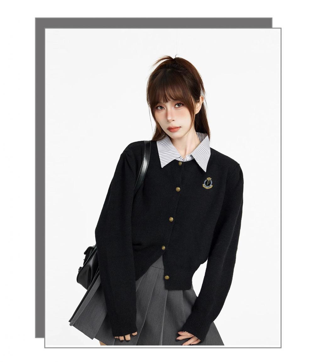 偽の2枚の学院風polo襟のカーディガンのセーターの女性秋冬のデザイン感の小さい人たちはニットのカーディガンを着ます。