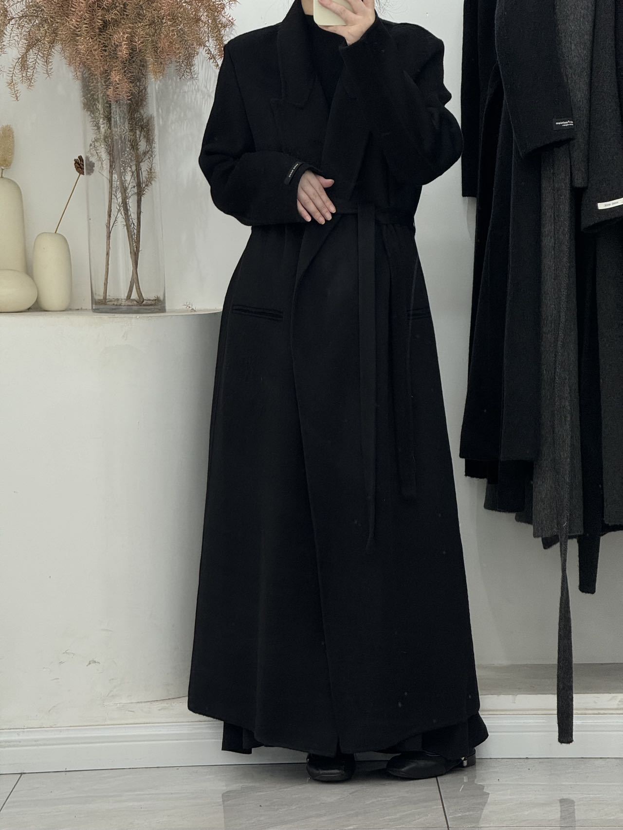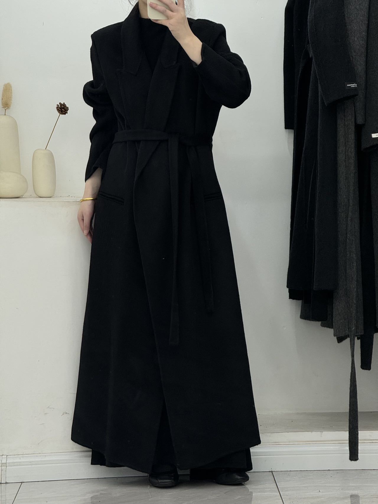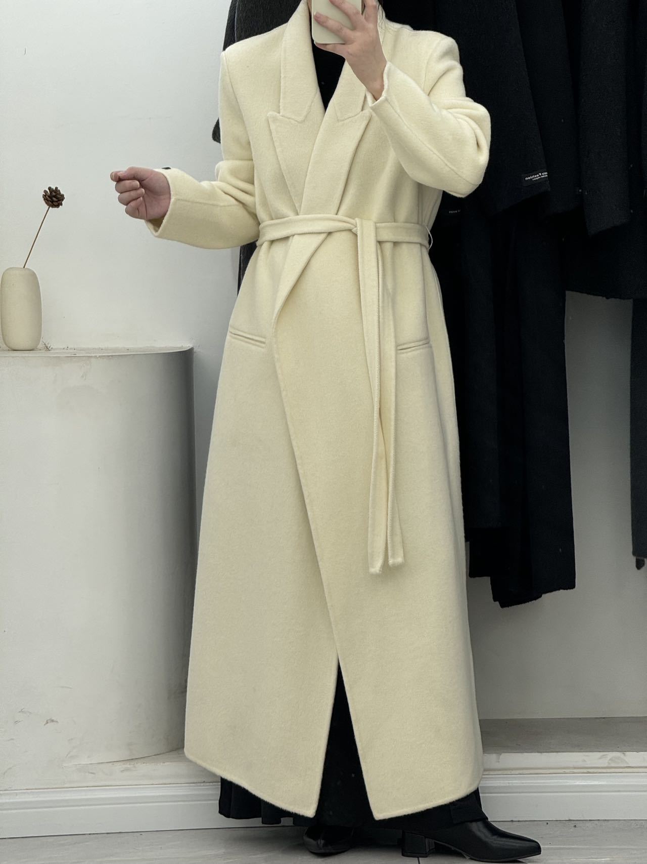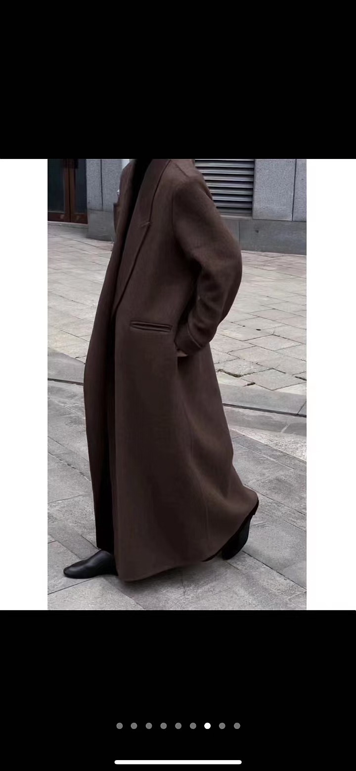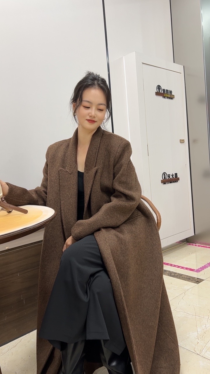 2025年秋冬新作、肩が自然な位置にあるゆったりとした両面ウールコート、女性らしいエレガントなロング丈、膝丈以上、高級感のある韓国風アウター