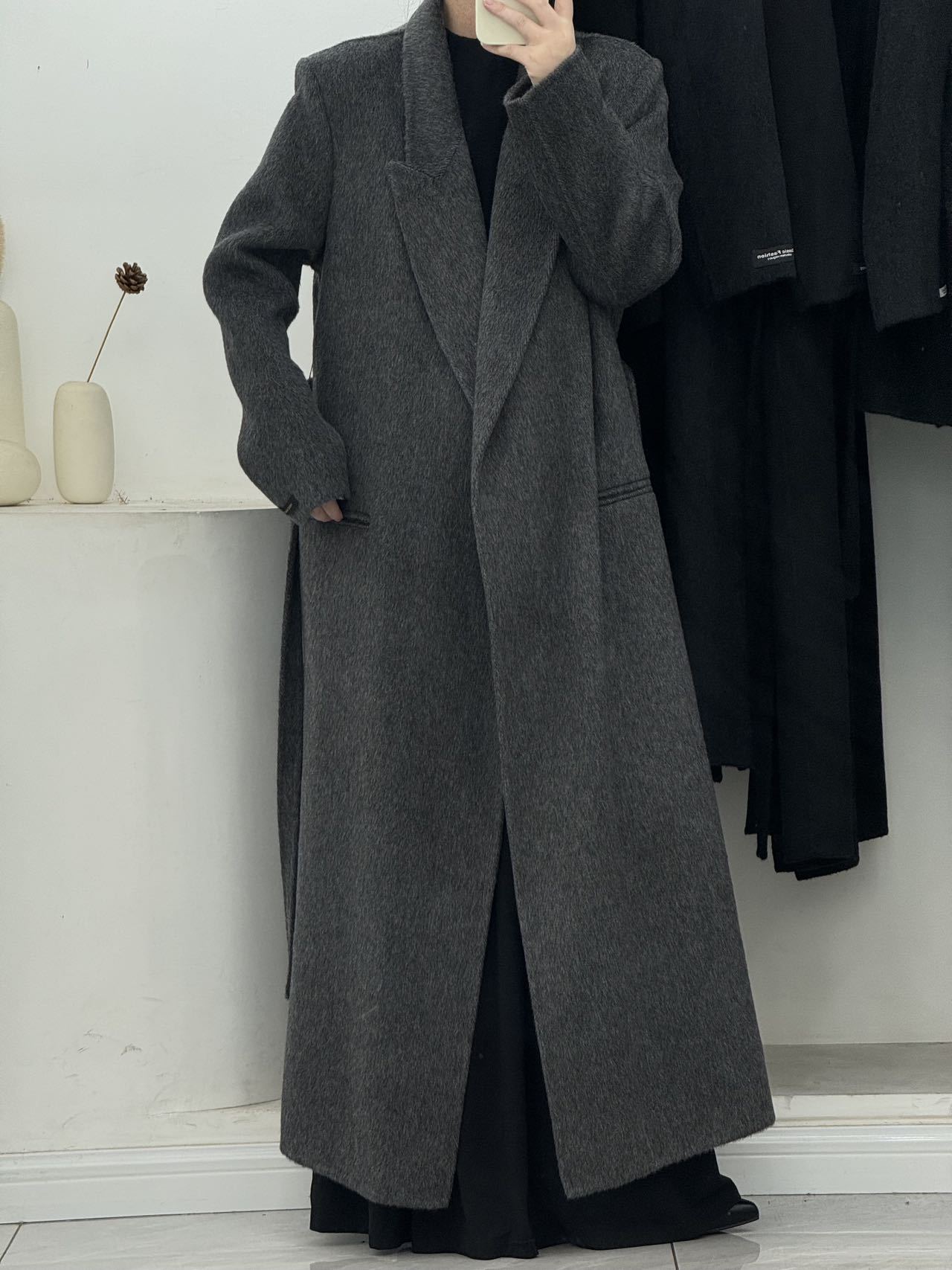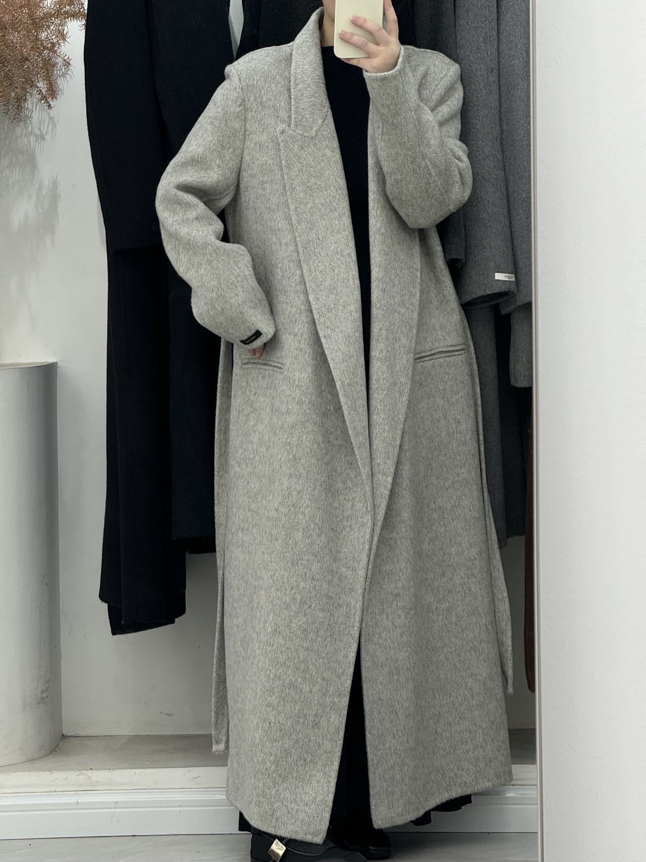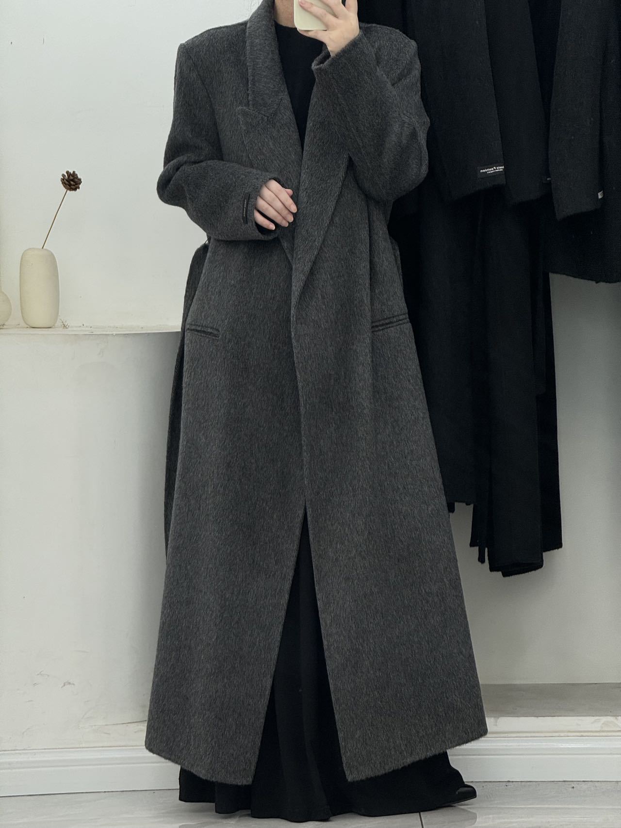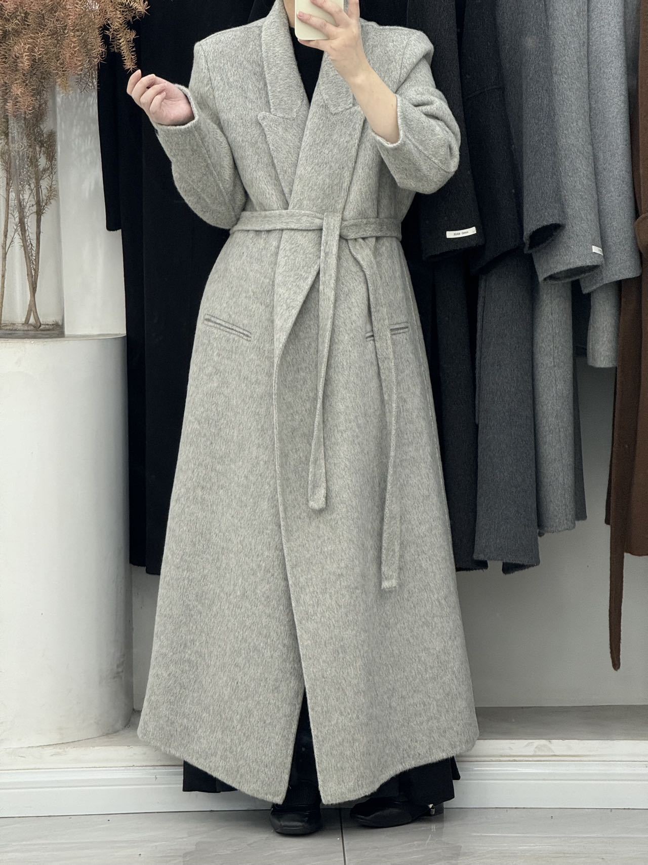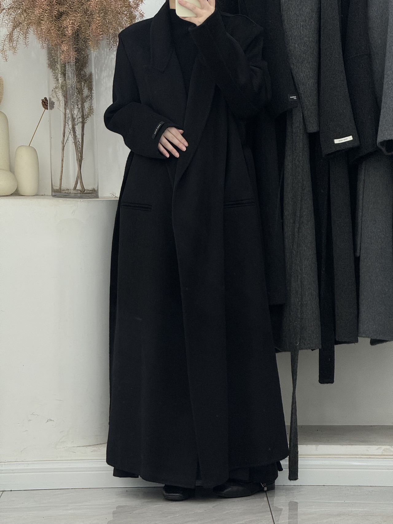2025年秋冬新作、肩が自然な位置にあるゆったりとした両面ウールコート、女性らしいエレガントなロング丈、膝丈以上、高級感のある韓国風アウター