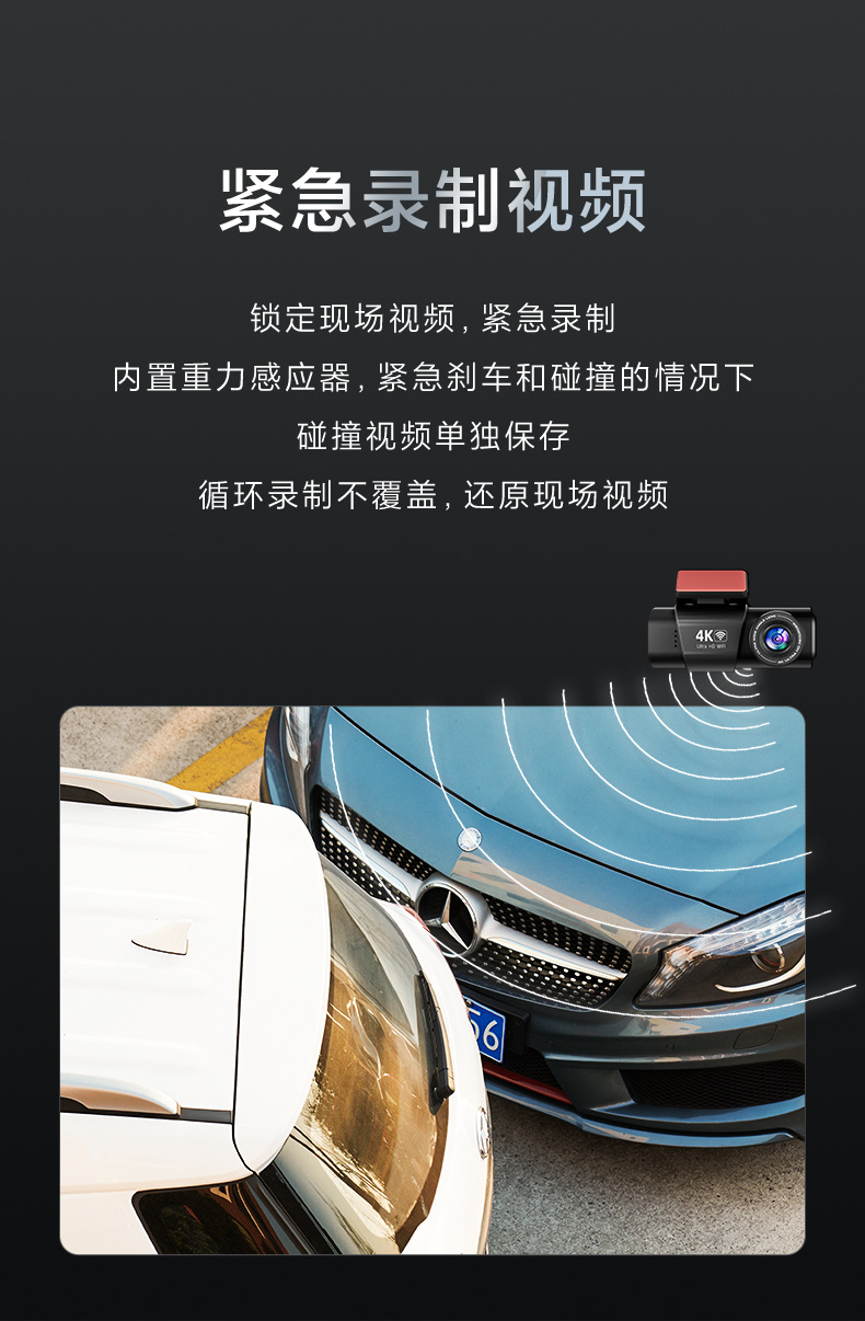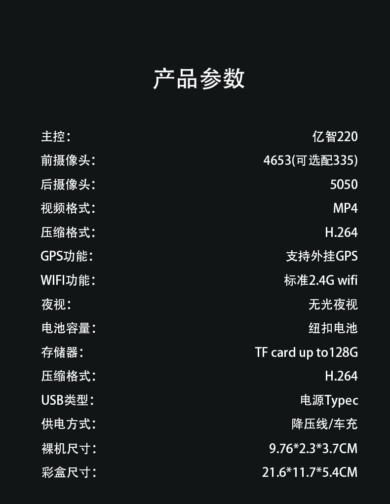 功能:标配2.4G WiFi,循环录像,前后录像等