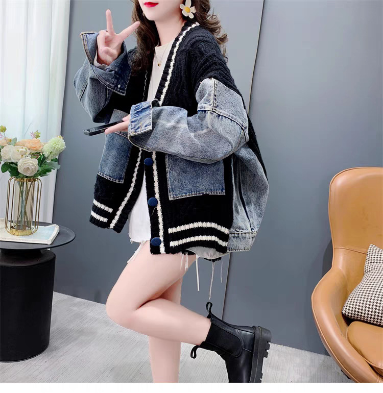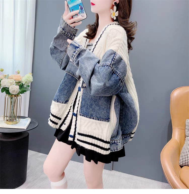 ゆったりとした怠惰な風のデニムはセーターのカーディガンの女性をつなぎ合わせます。