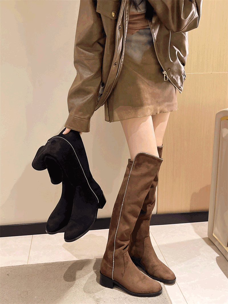 2024年秋冬 レトロ風チャンキーヒール オーバーニー スリムストレッチロングブーツ レディース 羊毛混紡ハイブーツ