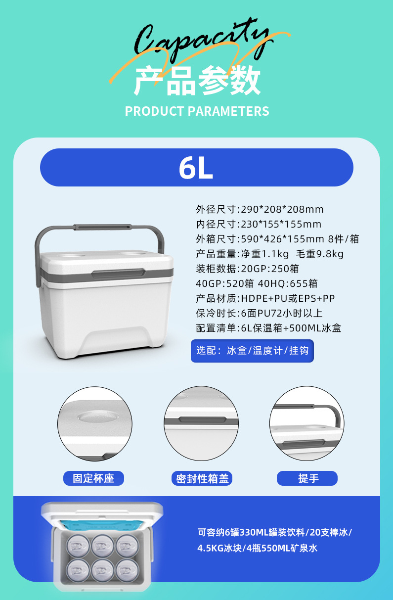 【新商品登場】6L ホワイト - ポータブルポータブル [フルPU保冷72時間] スポーツ - 軽量 - 無料アイスバッグ
