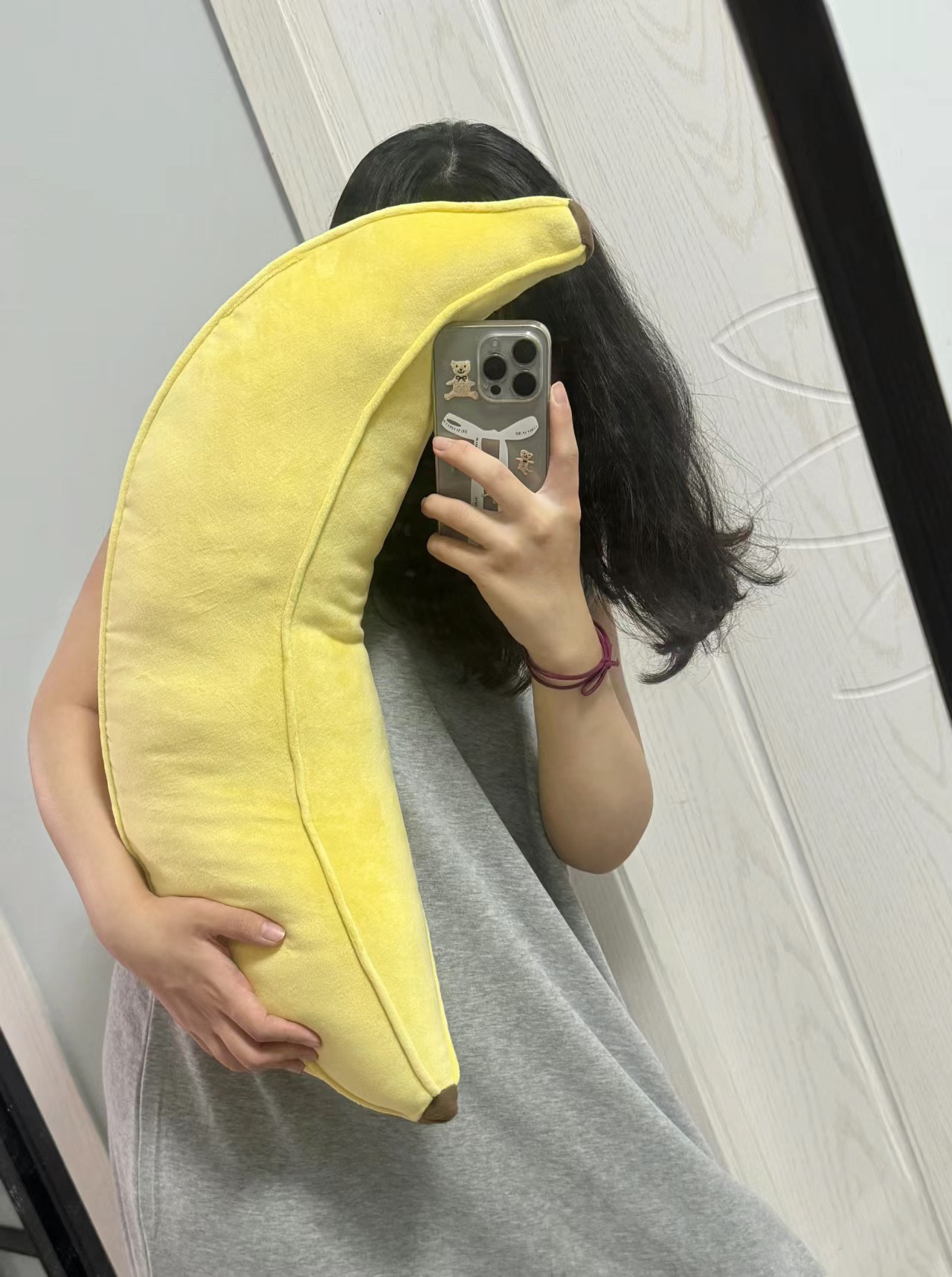 Ins風上海ニトリは同じバナナのぬいぐるみが枕を抱いています。
