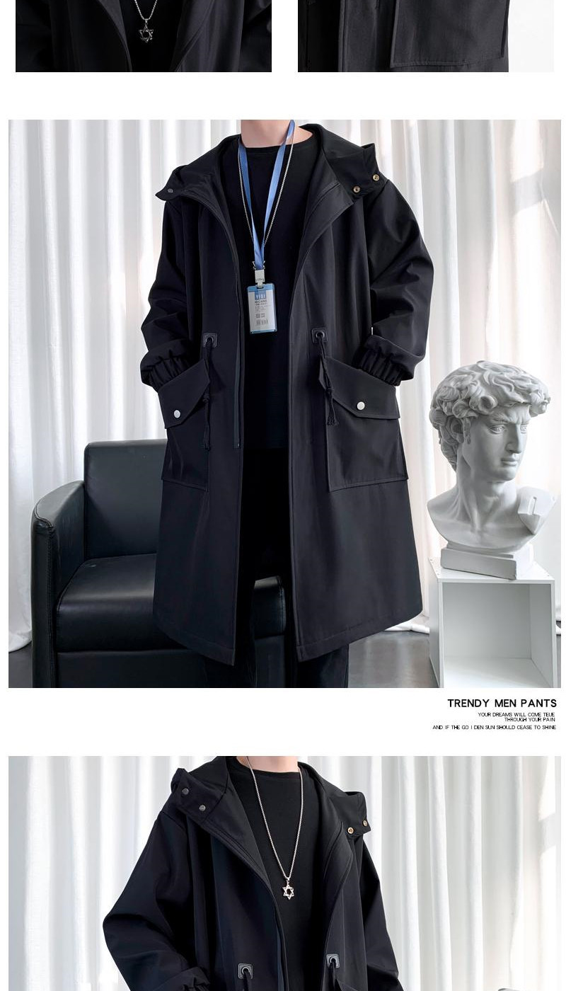 デザイン感のあるトレンチコート男性の中長コート春秋カジュアル英倫風男性防風フード付きマント上着