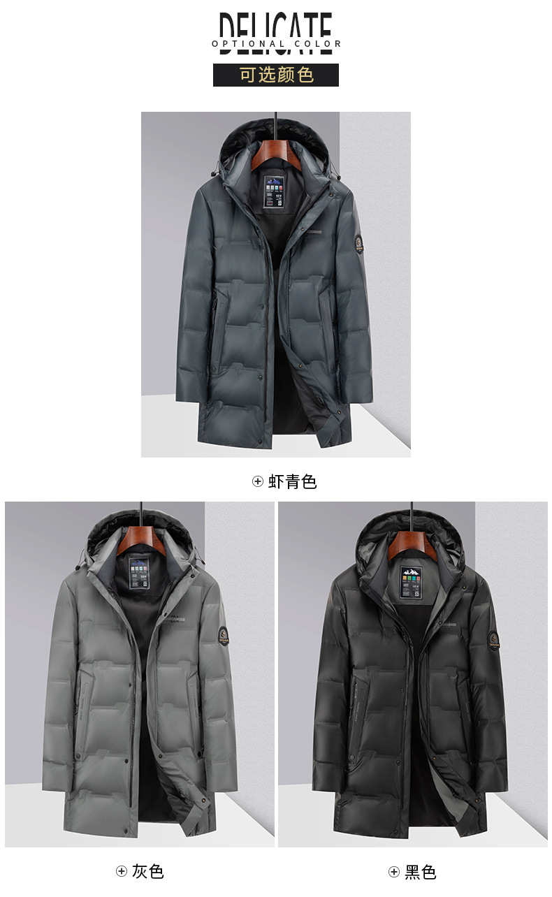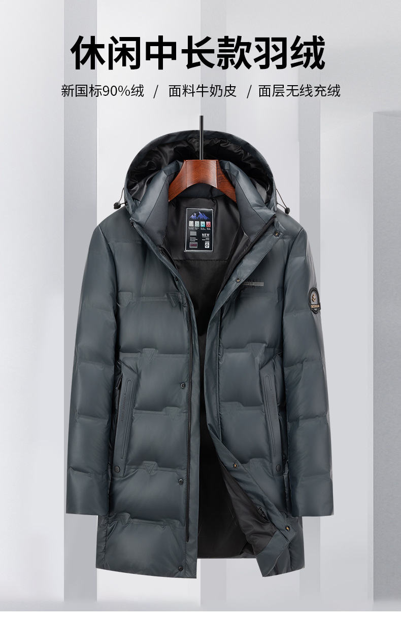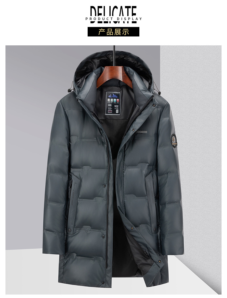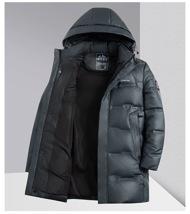 新型ダウンジャケット男性ミディアムロングフード付きダウンジャケット防寒保温中青年pu皮面防水ダウンジャケット