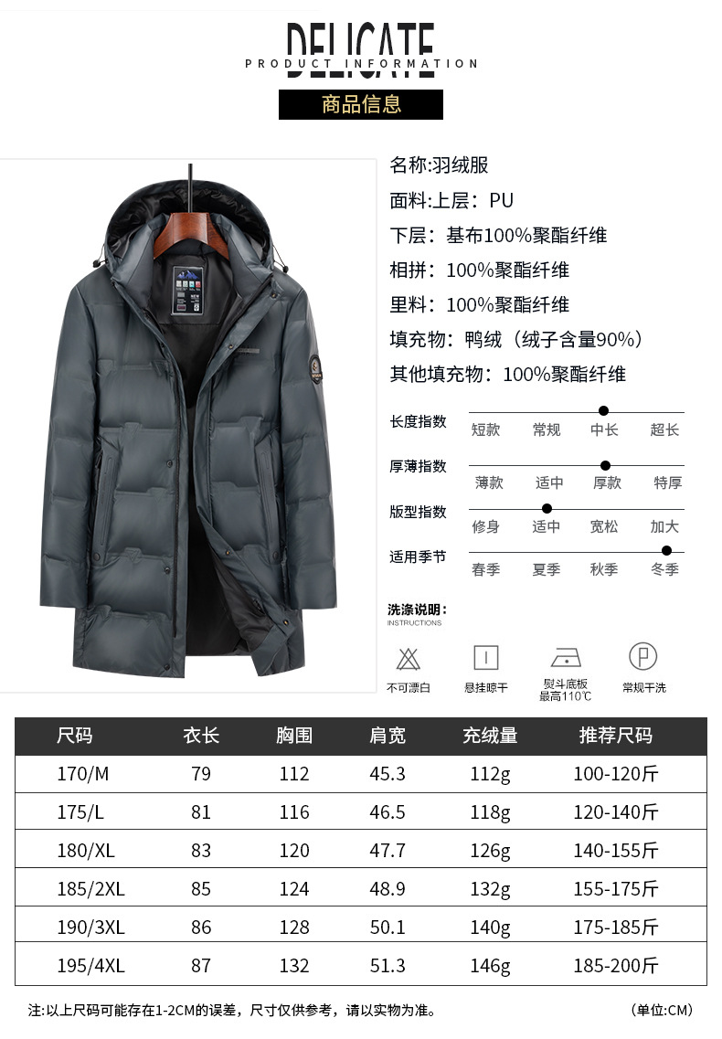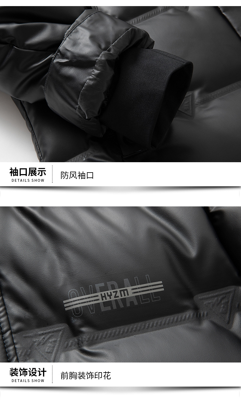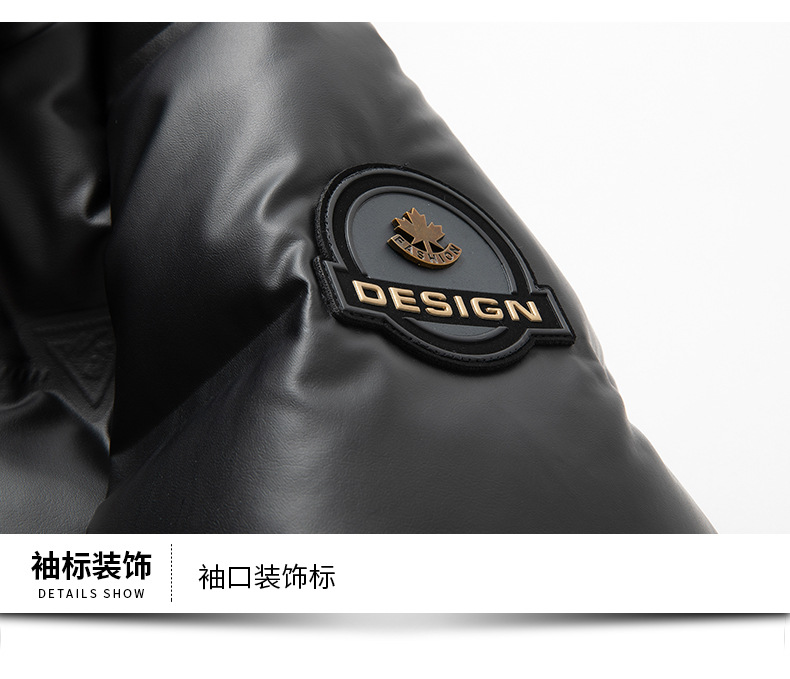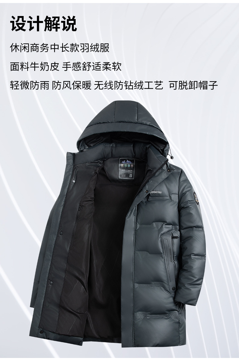 新型ダウンジャケット男性ミディアムロングフード付きダウンジャケット防寒保温中青年pu皮面防水ダウンジャケット