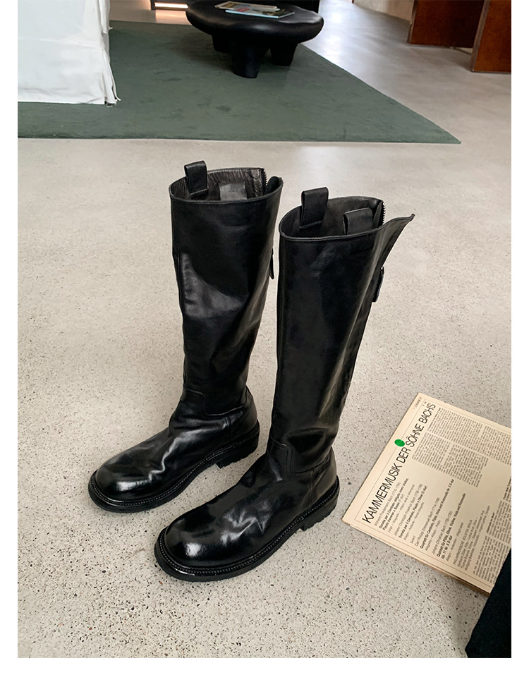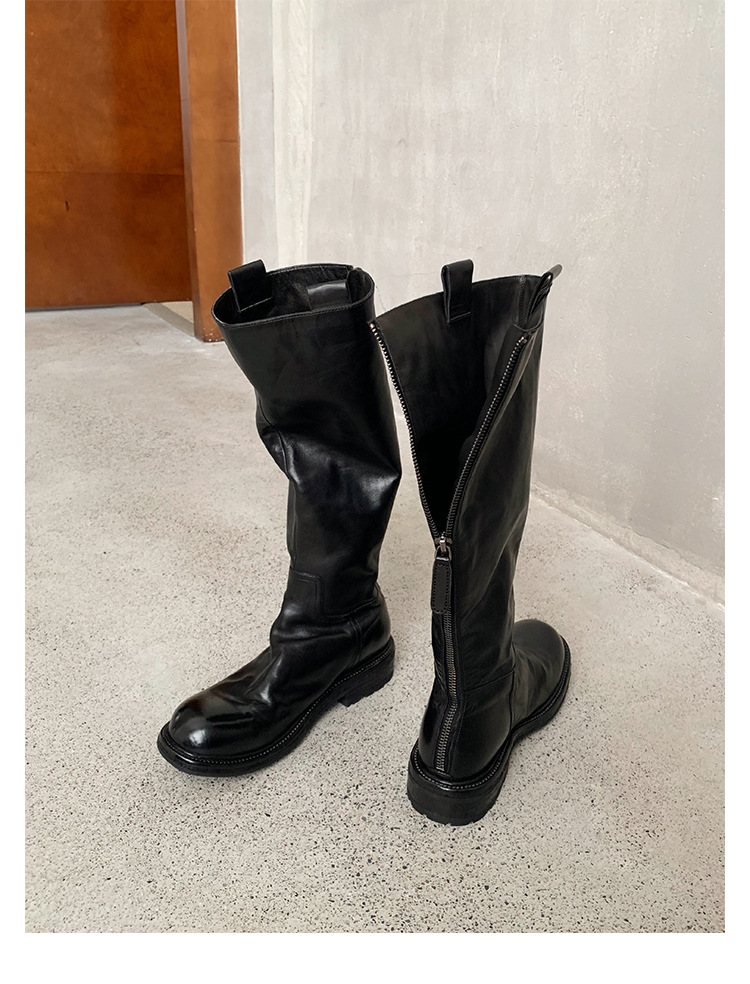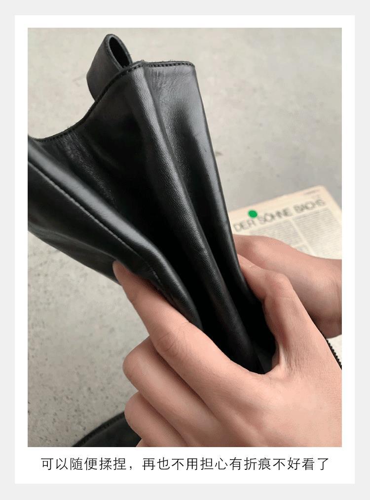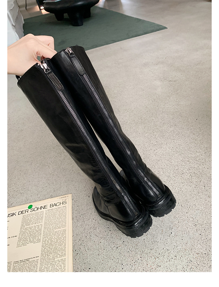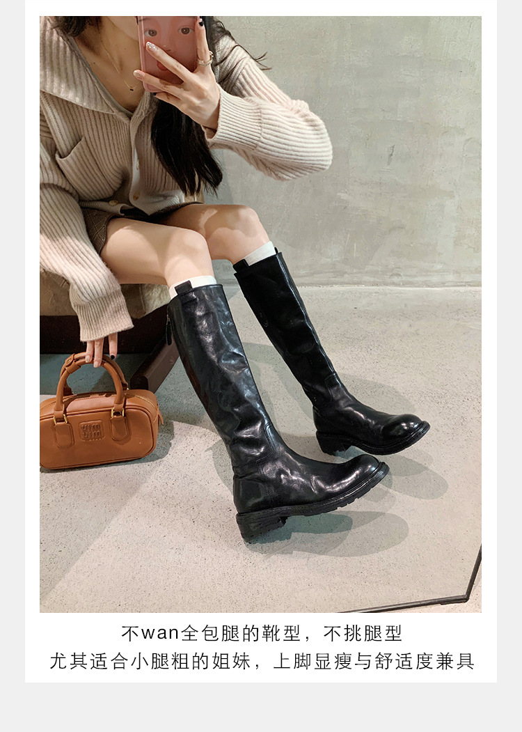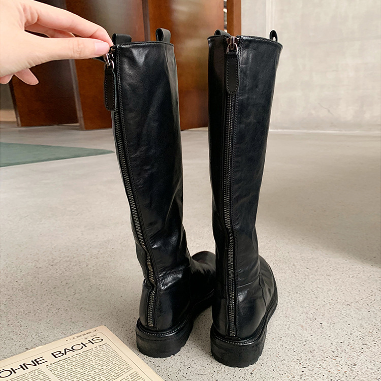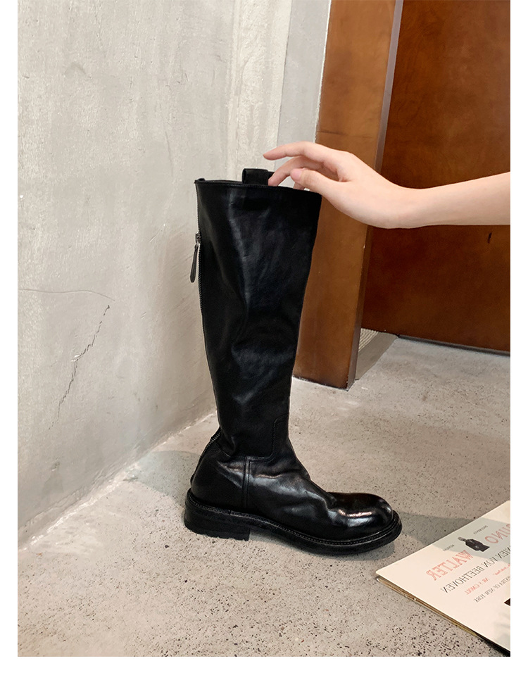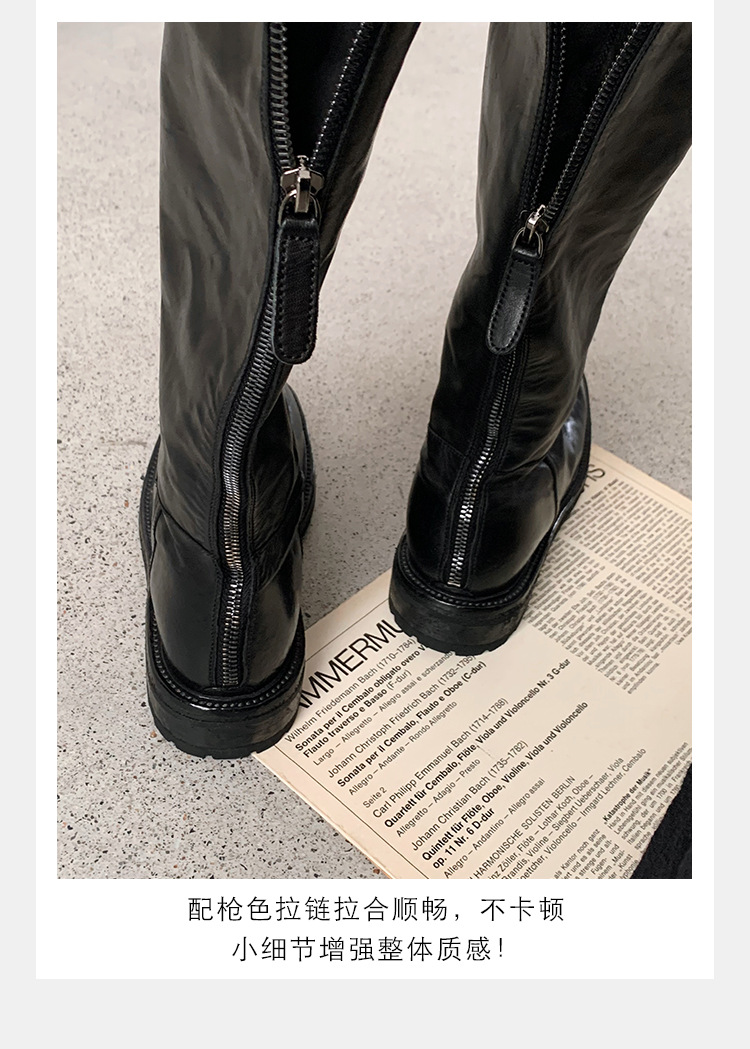 全牛革 ~ 英倫水洗い本革厚い底ブーツ女性後ファスナー太ヒールブーツ痩せ騎士ブーツ