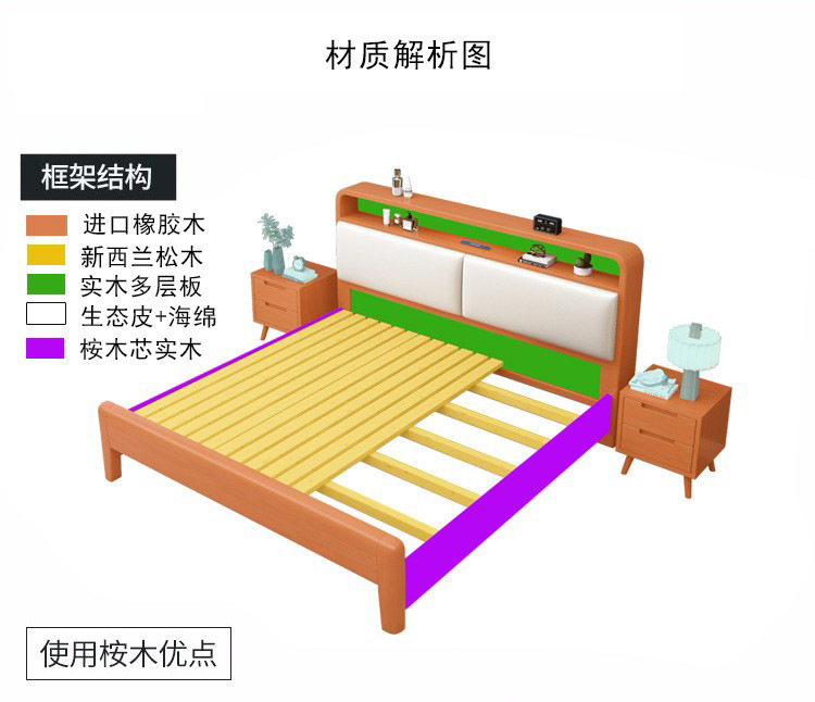 北欧実木ベッド1.8メートル主臥ツインベッド1.5mライト付きusb現代シンプルな貯蔵物民宿ソフトベッド