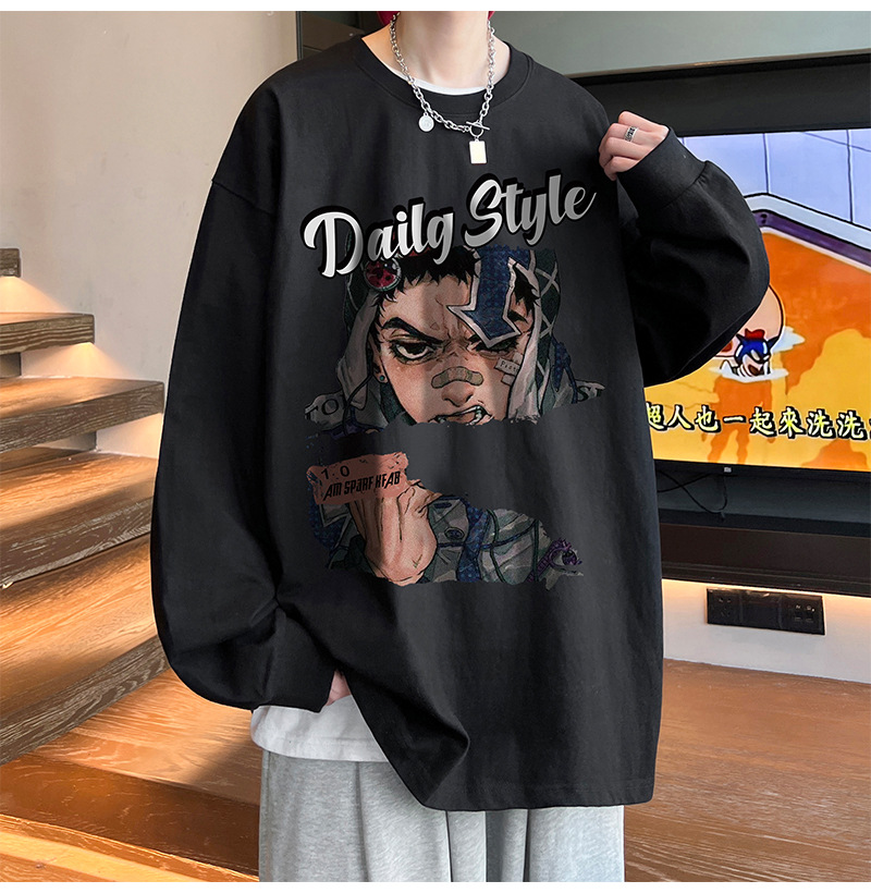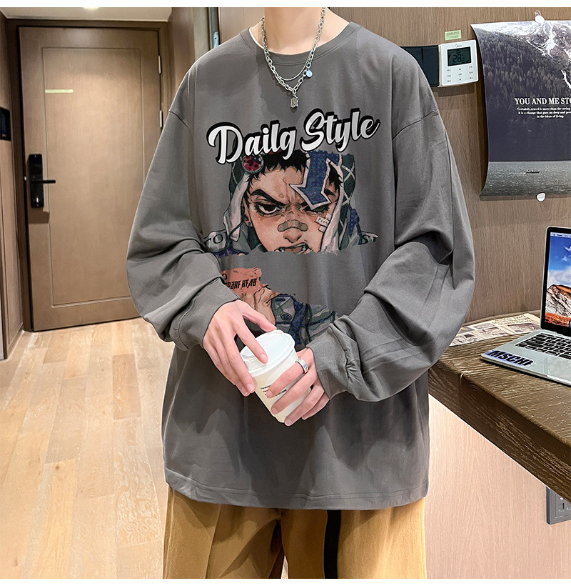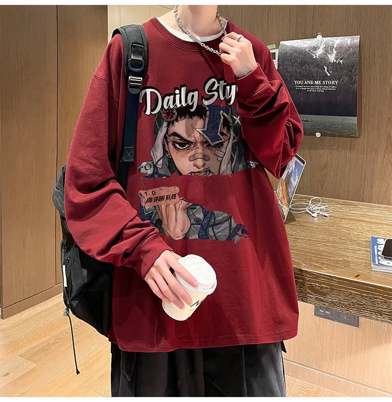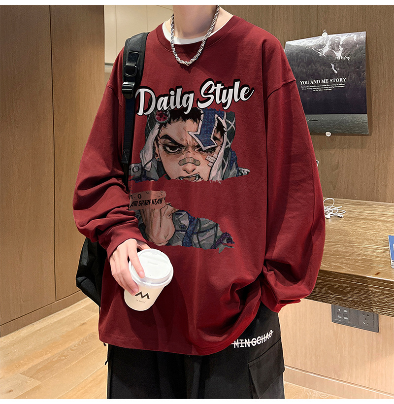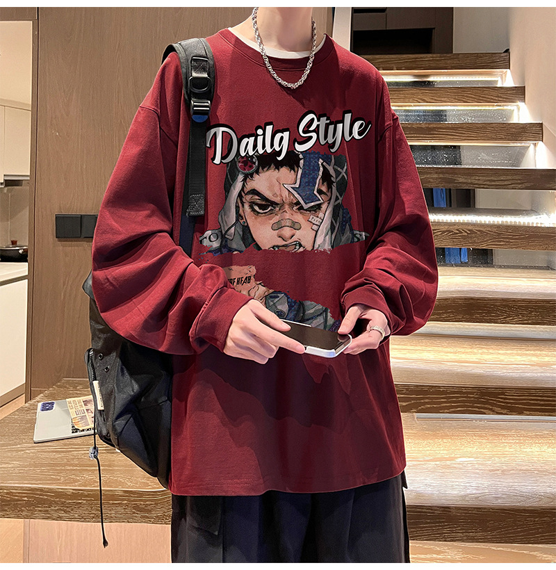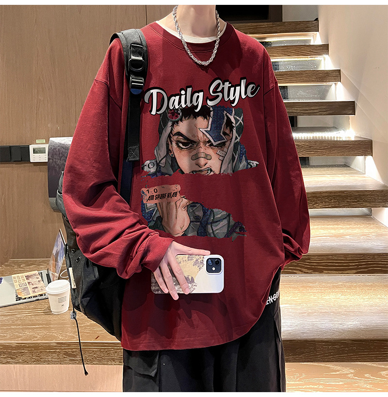 ワインレッド純綿長袖tシャツ男子秋潮牌大サイズ丸首底シャツアニメプリント重ポンド上着