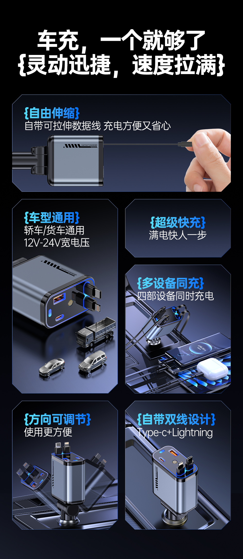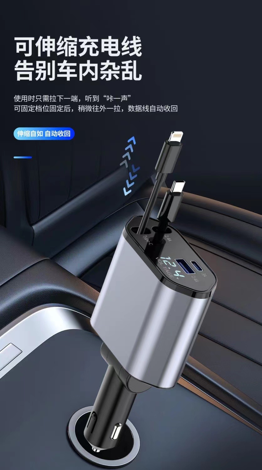 クロスボーダー甲車載携帯電話充電器超速充四合一伸縮線車充電シガレット自動車用品