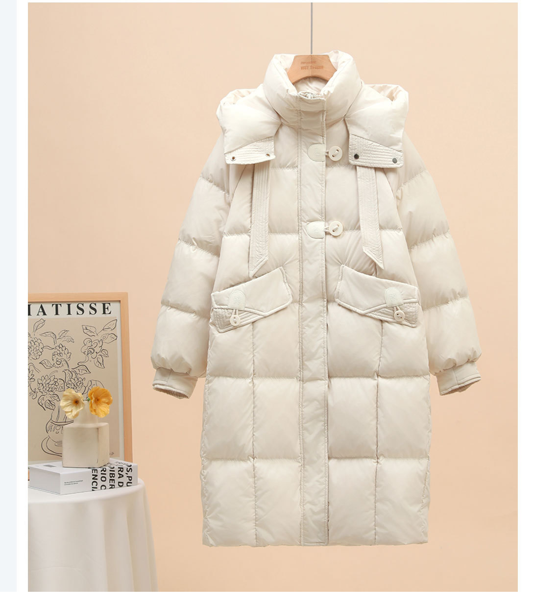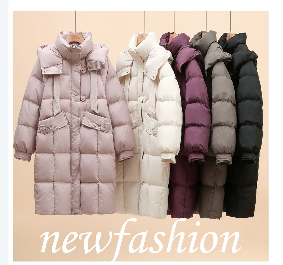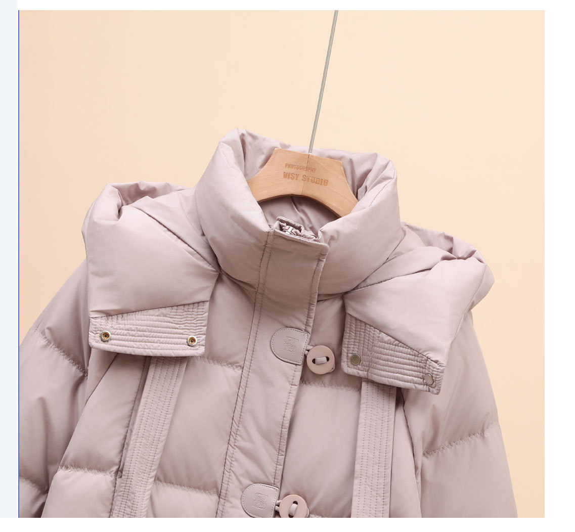 中丈の白いグースダウンジャケット レディース 2025年新作 韓国風 厚手 リボン付き フード付き ゆったり 膝丈 冬用コート