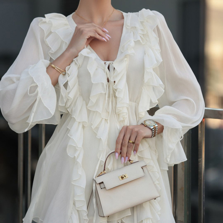 国境を越えて人気の2026年春新作、フレンチデザインのフリル付きタイアップワンピース、女性用Vネック長袖ファッションAラインドレス