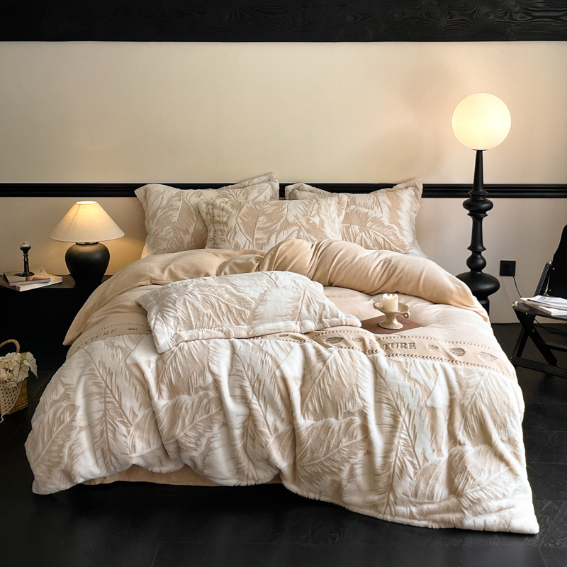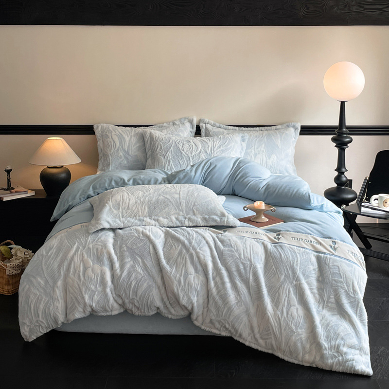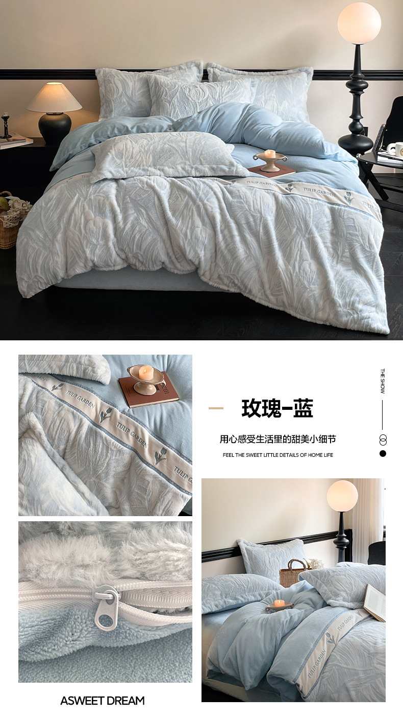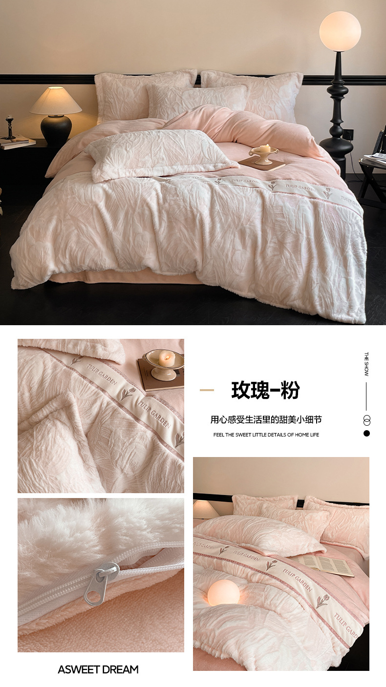 軽くて豪華なウサギのぬいぐるみのベッドの上の4つのセットの冬の保温の牛乳の絨毛のシーツの布団の両面のフランジサンゴの絨毛のベッドの用品