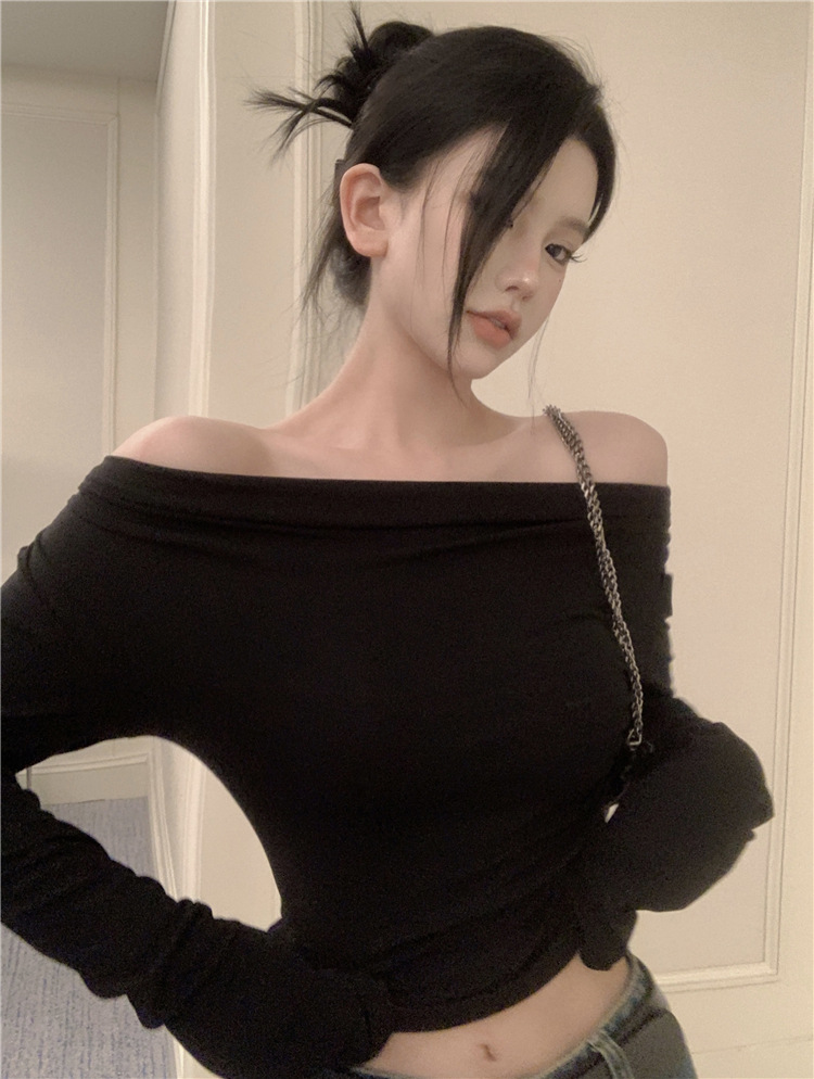 セクシーなワンショルダーデルロン長袖Tシャツ レディース 2025初秋 オフショルダー スリムフィット 不規則ショート丈インナー トップス