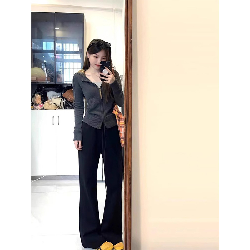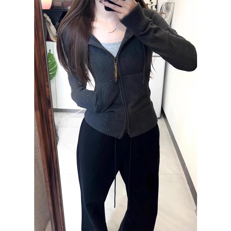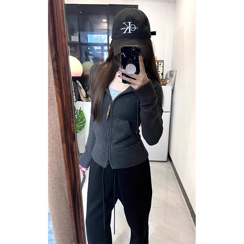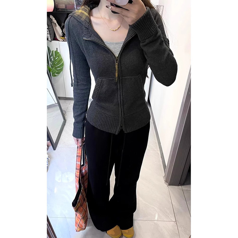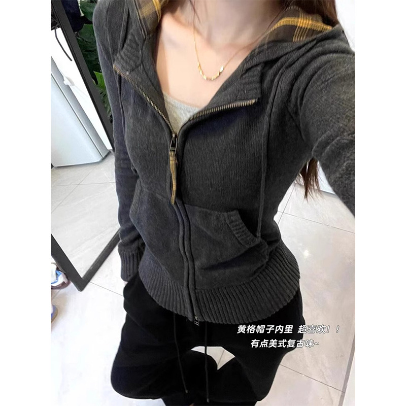 アメリカのギャルのセクシーなレトロな格子のファスナーは帽子をつないで身を修めてやせている長袖のtシャツの韓系のメリヤスのカーディガンの上着を見せます。