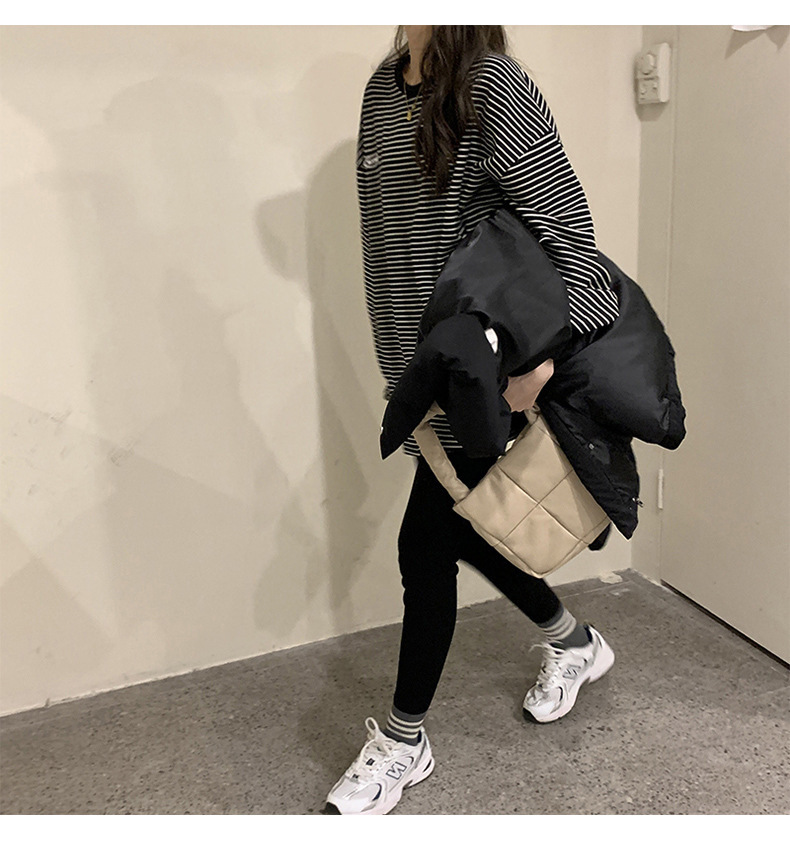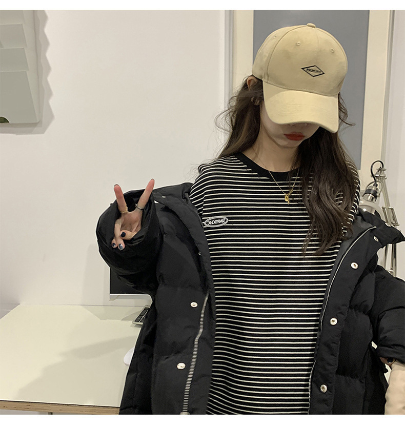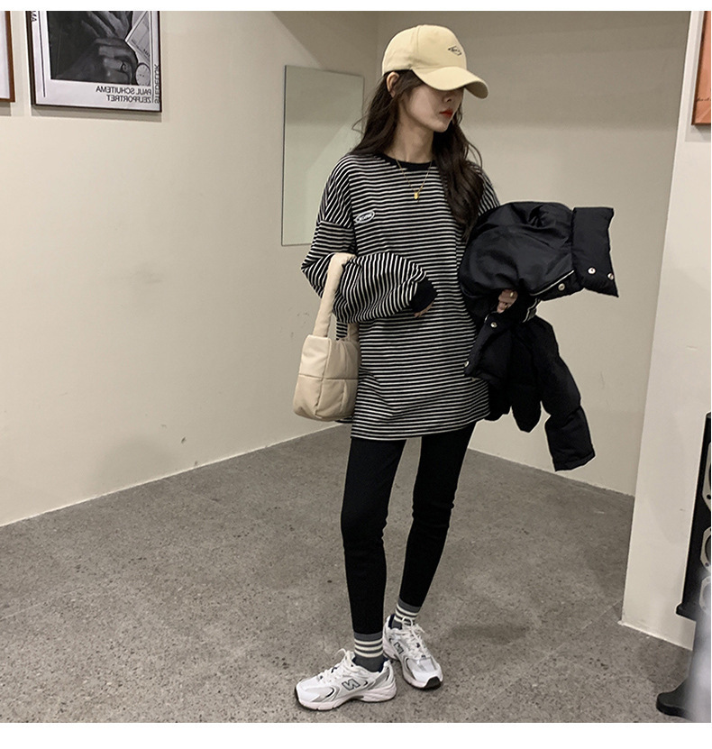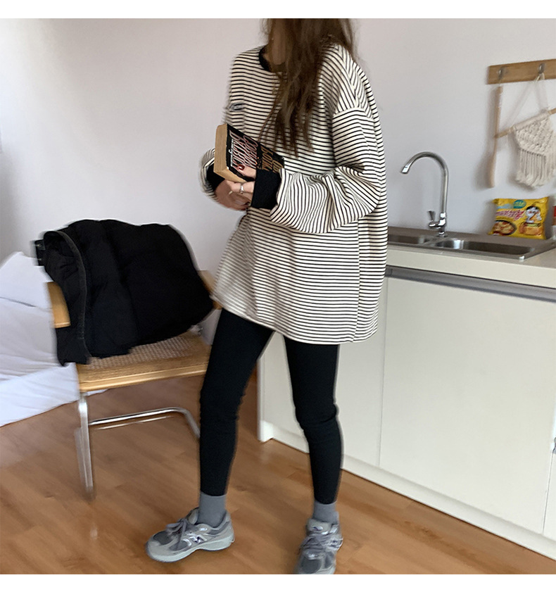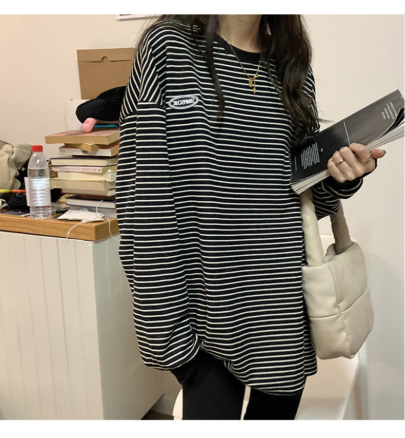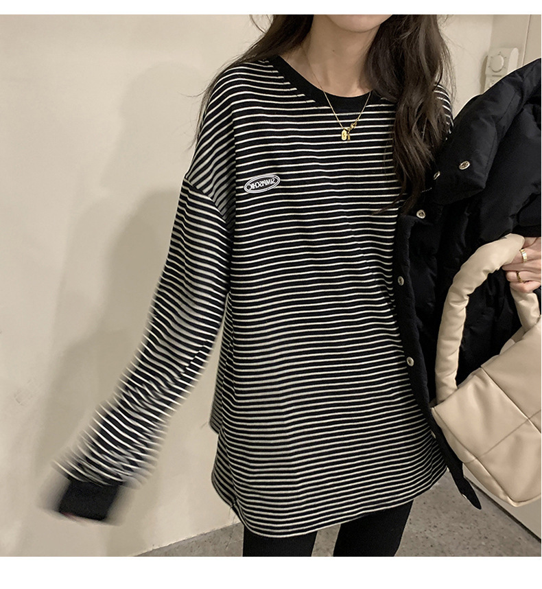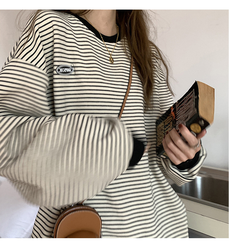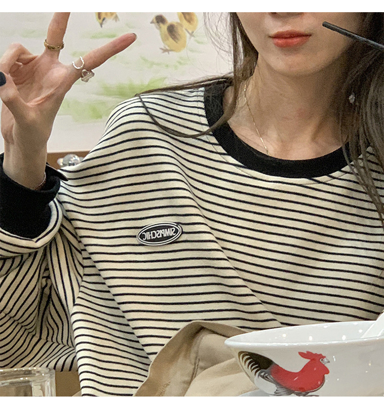 クロスボーダーの現物のストライプのtシャツの底のシャツの女性の2024秋の新型の丸首の長袖の女性の韓国版の上で服の婦人服を着ます。