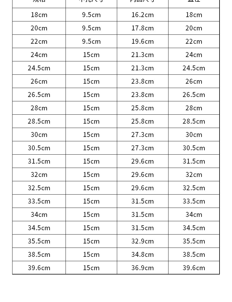 18cm,20cm,22cm,24cm,24.5cm,26cm,26.5cm,28cm,28.5cm,30cm,30.5cm,31.5cm,32cm,32.5cm,33.5cm,34cm,34.5cm,35.5cm,38.5cm,39.6cm