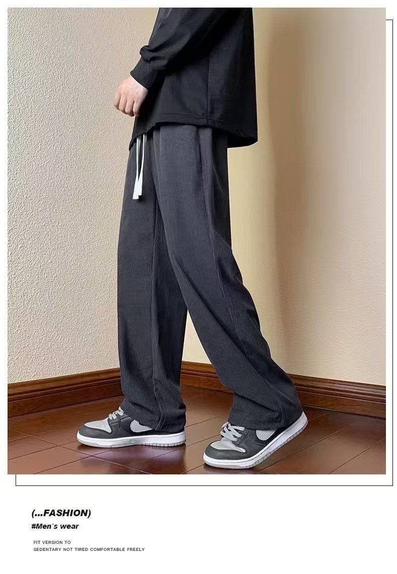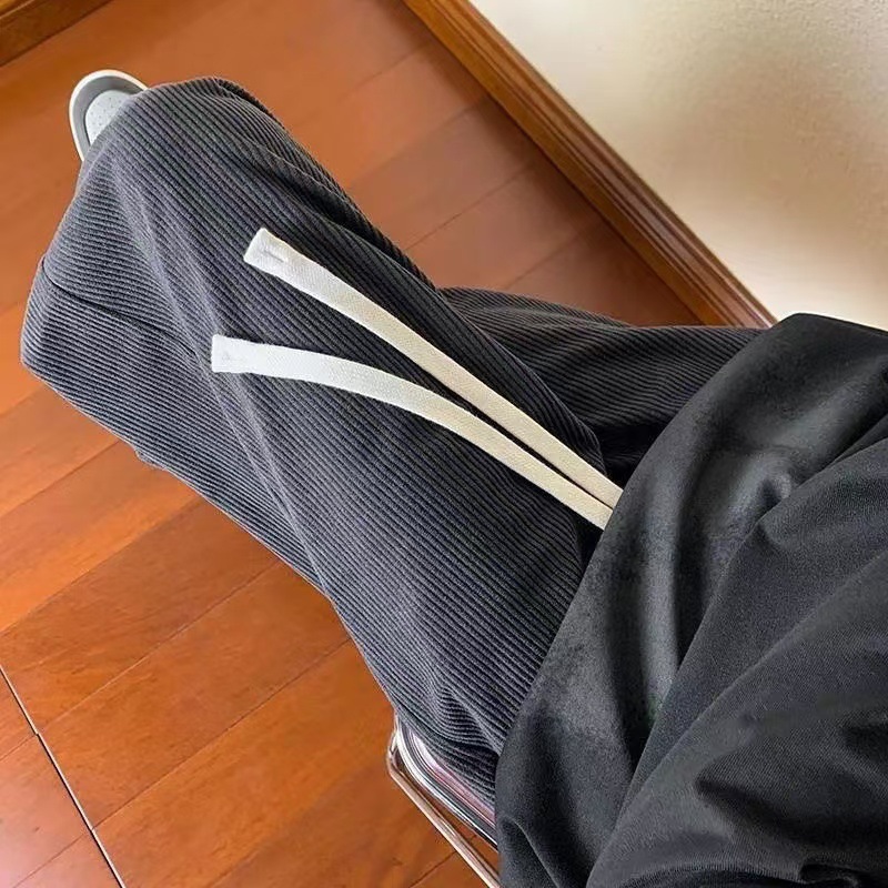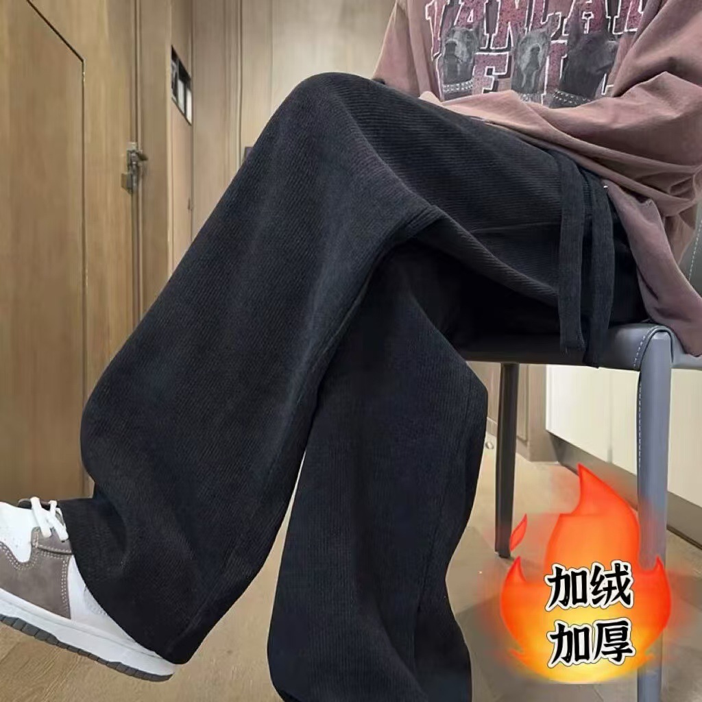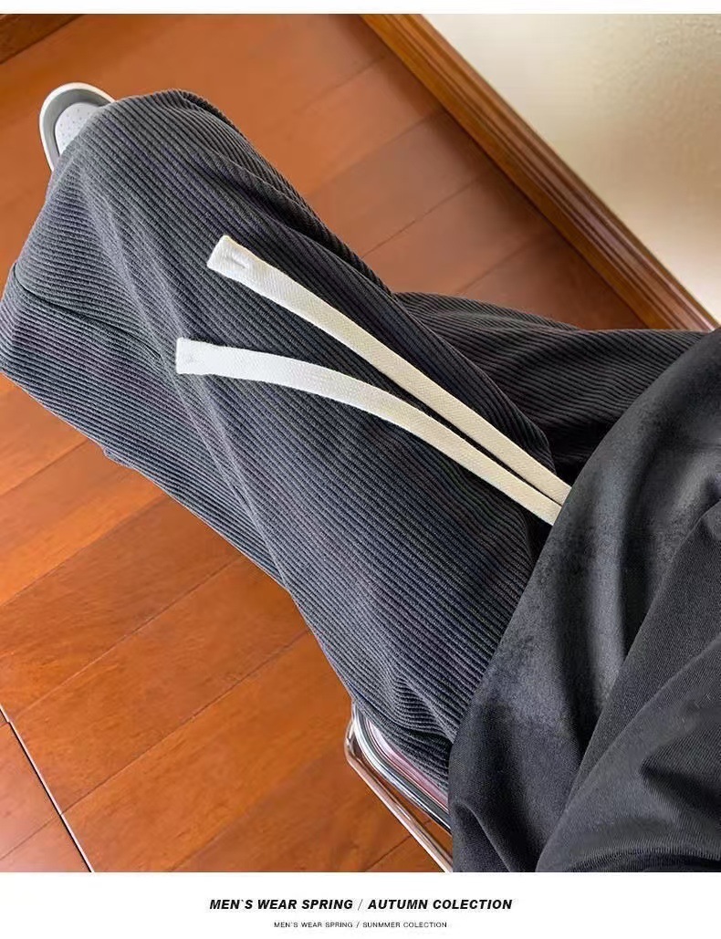 男性の秋冬のモデルには、黒いスポーツのズボンがあります。