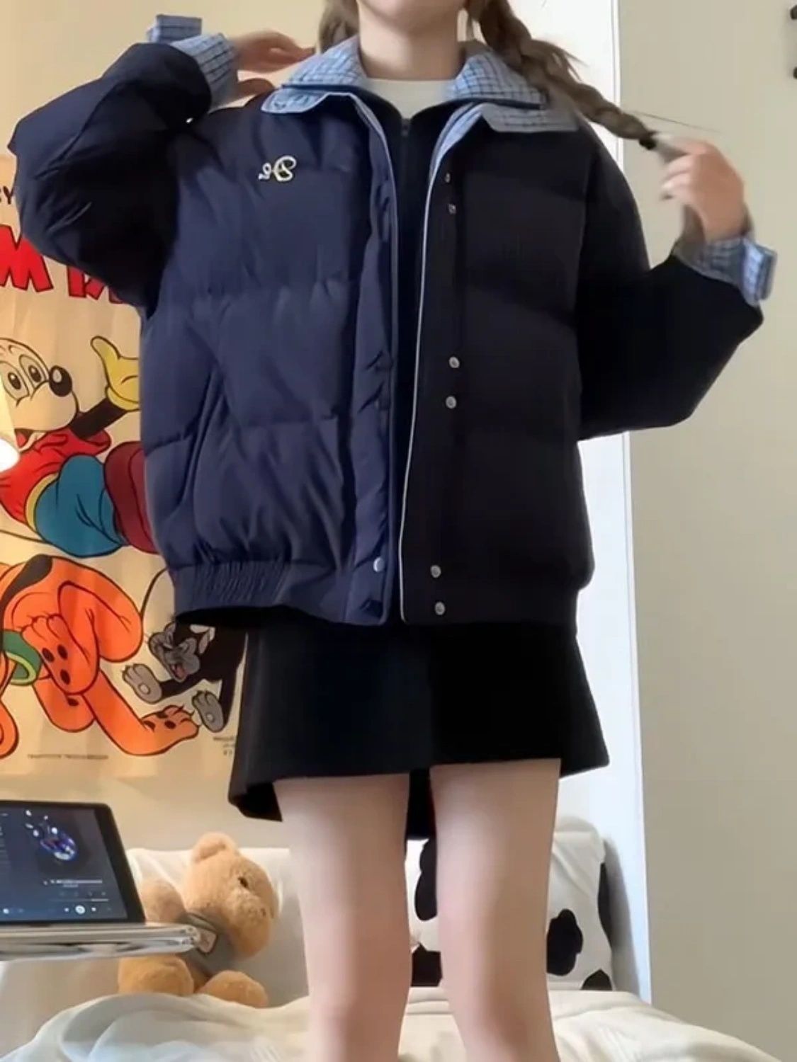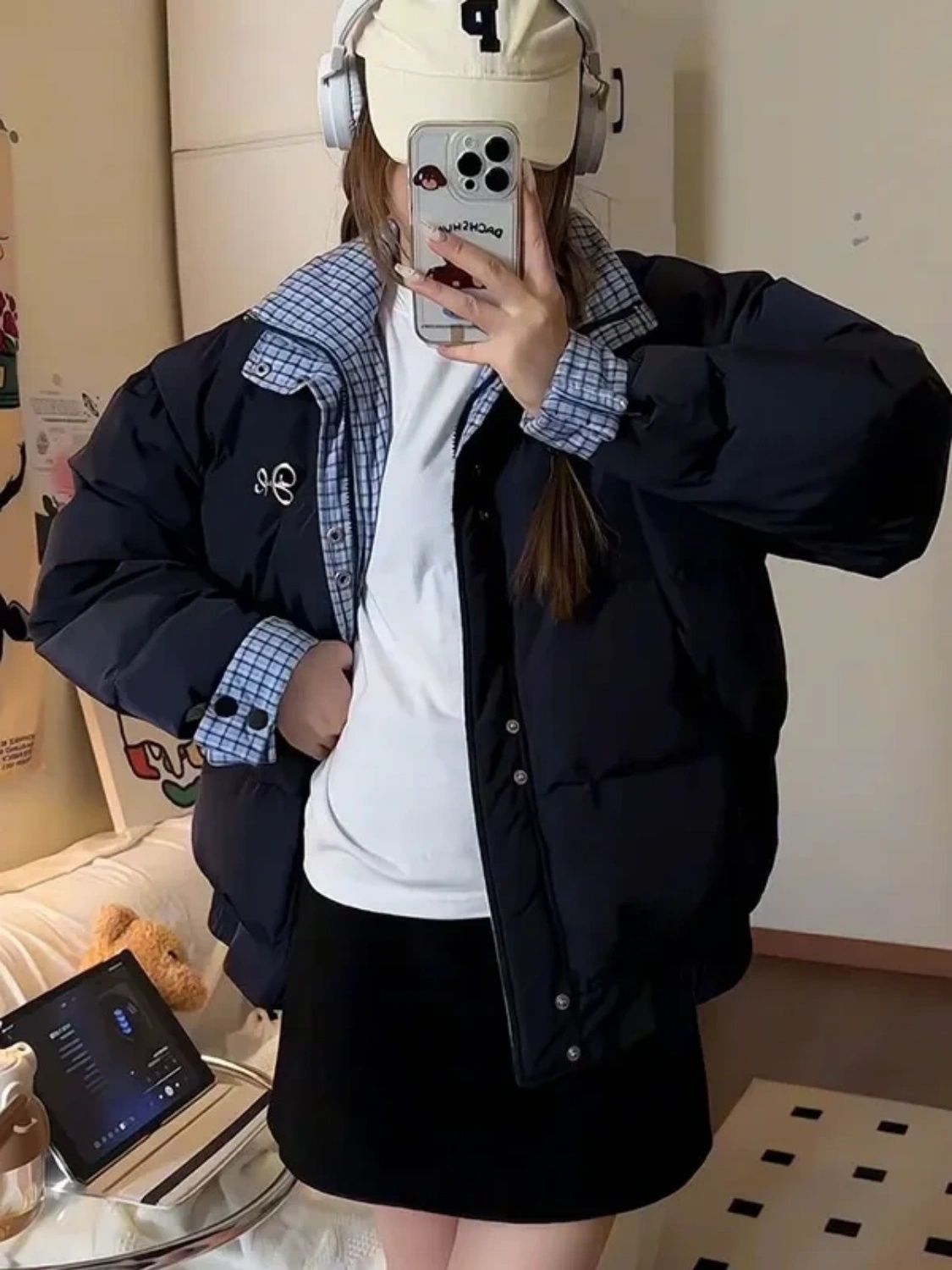 アメリカのレトロな青い格子縞は防寒コートの綿服をつなぎ合わせます。