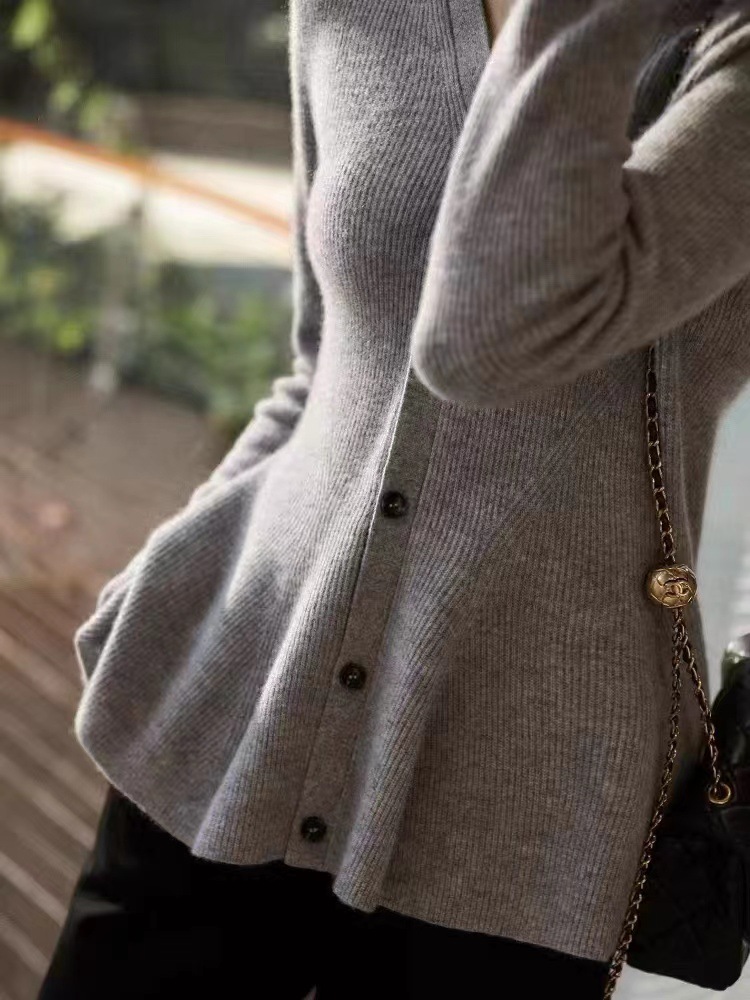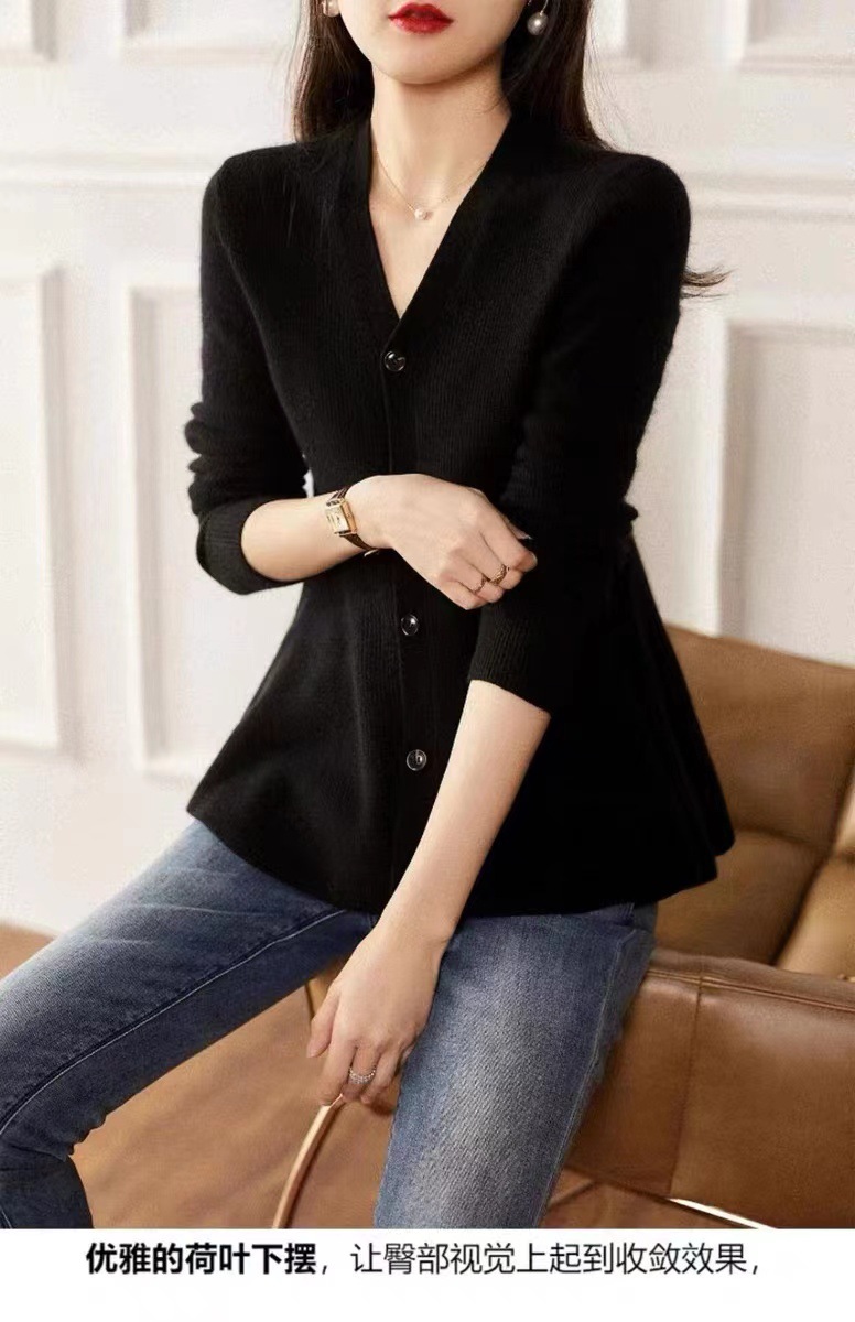 良い生地、写真あり。2025年日本楽天Vネック、着痩せ効果、ウエストシェイプ、外で着るセーター、フリル裾、長袖ニットカーディガン。