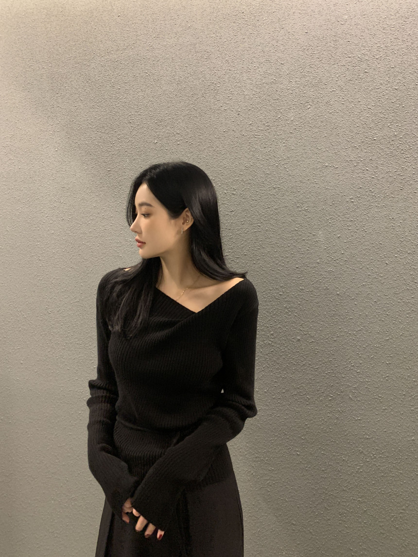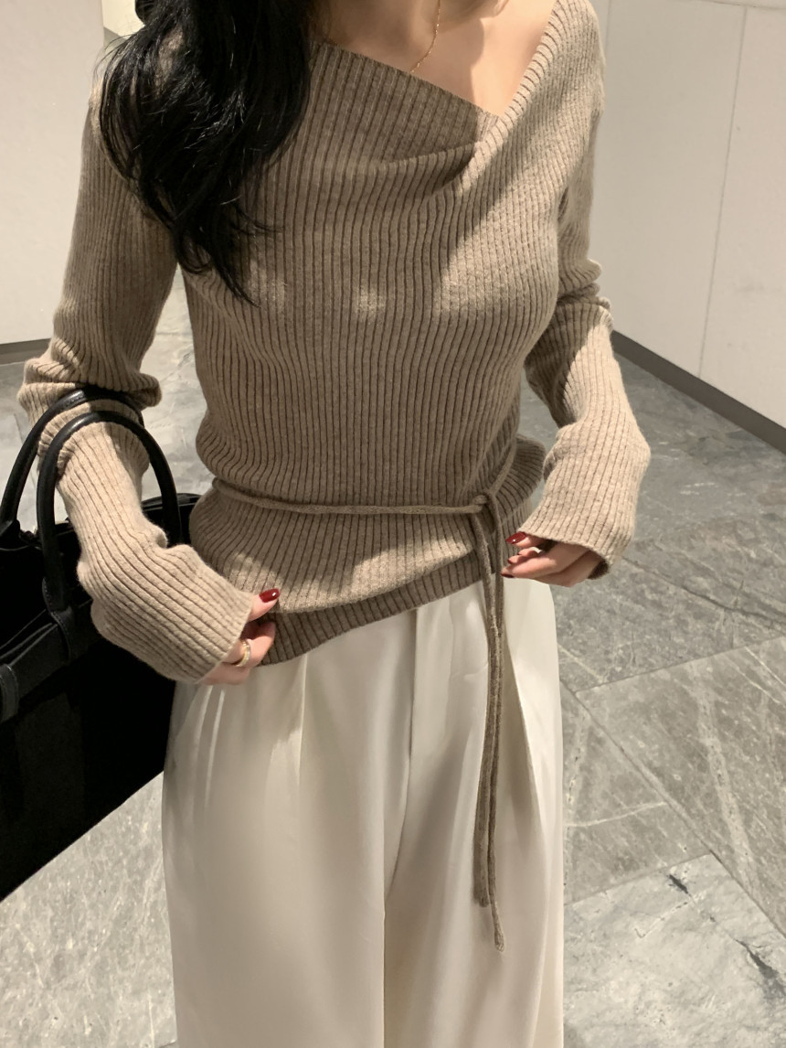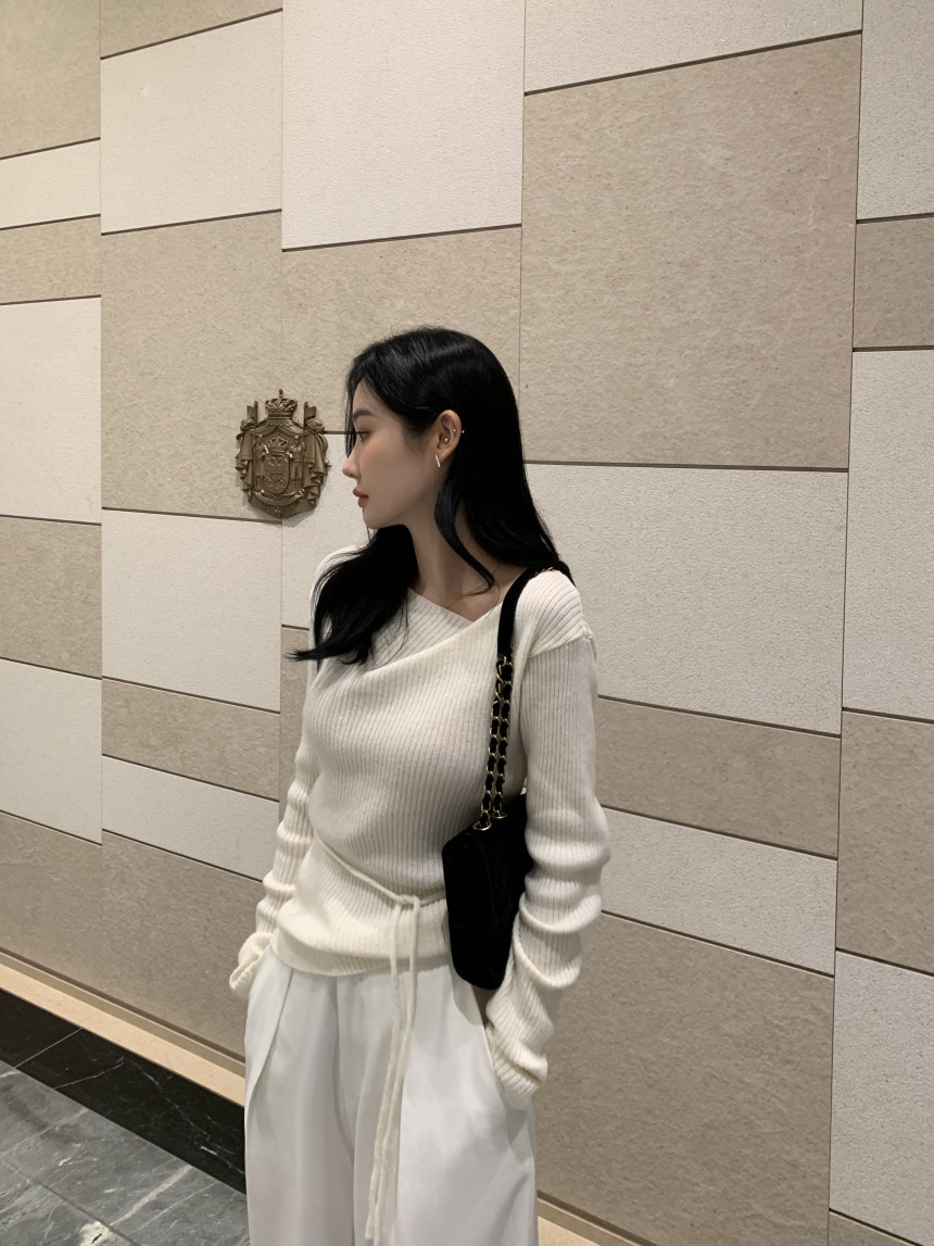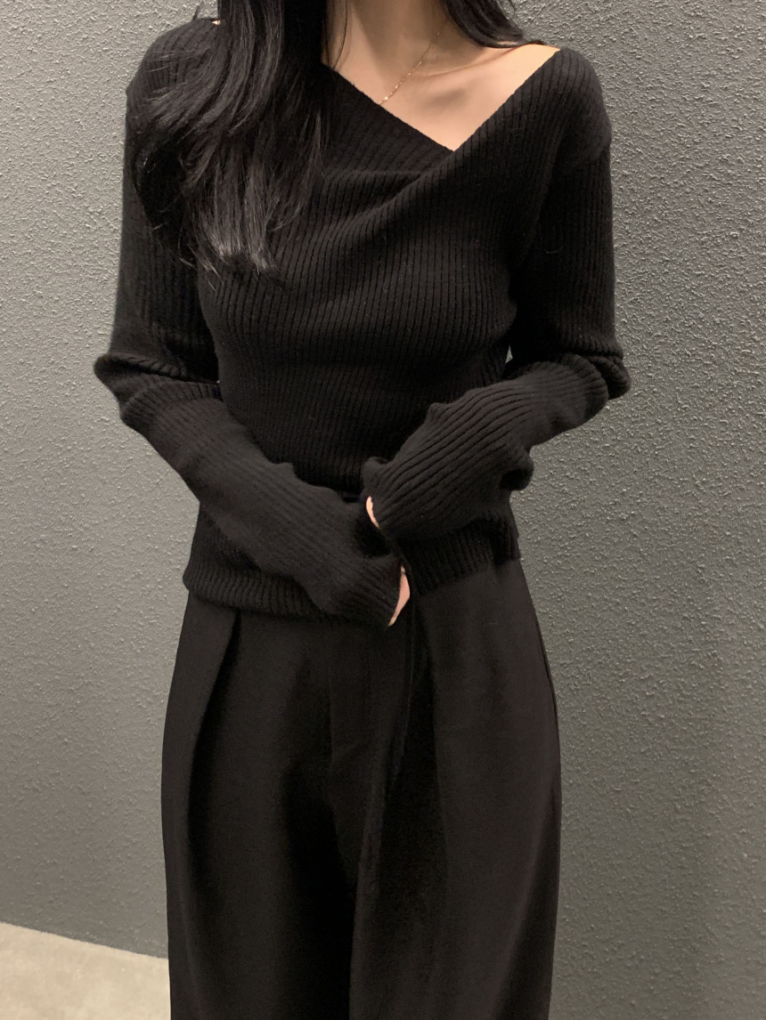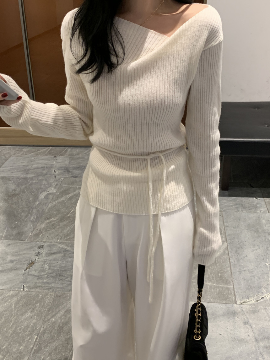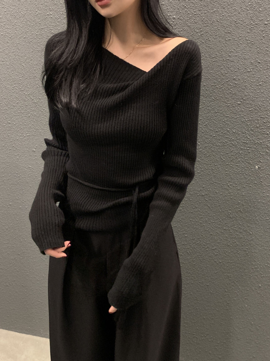 韓国の古典的な新しいデザインの三角形カットオフショルダープリーツストラップ長袖セータートップ女性用