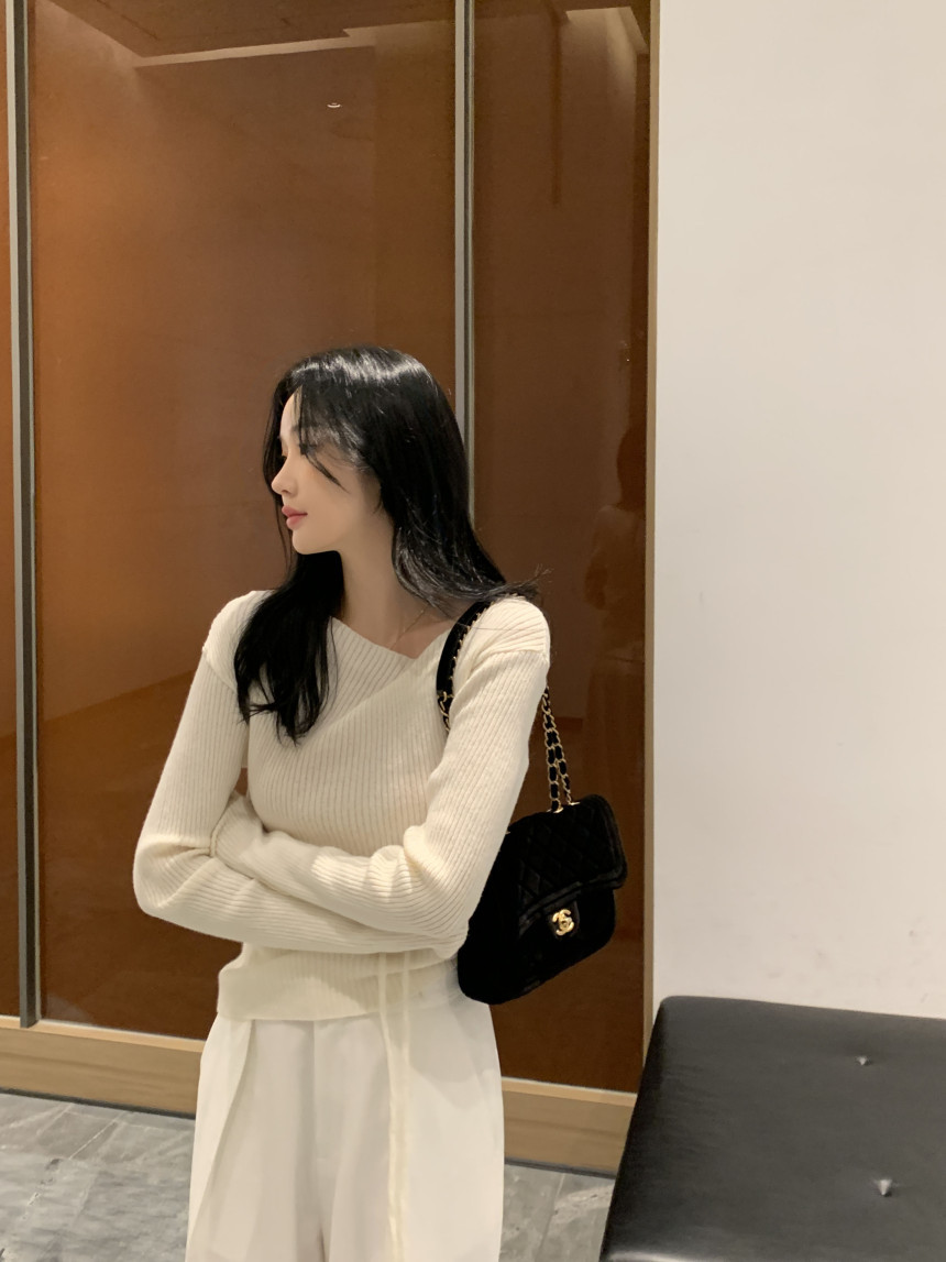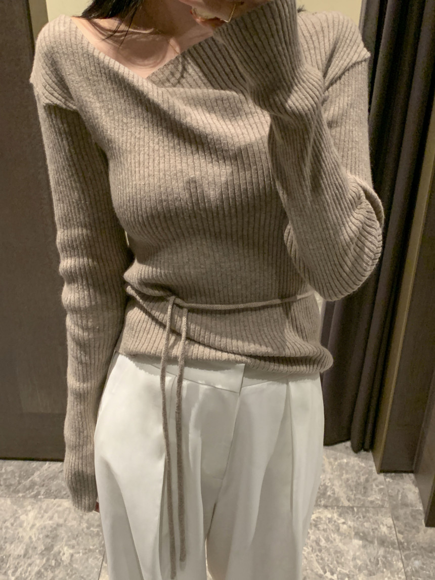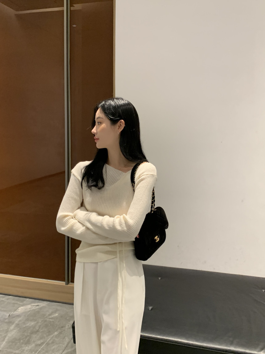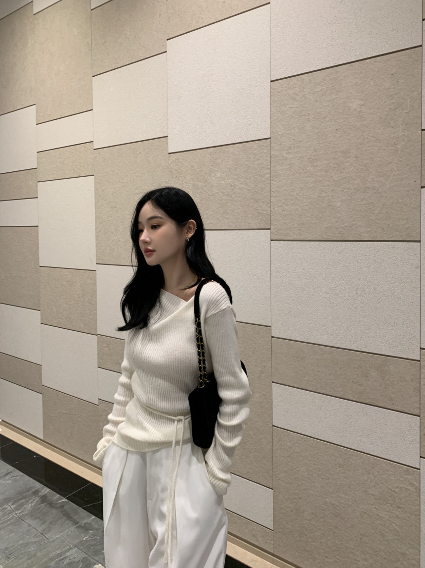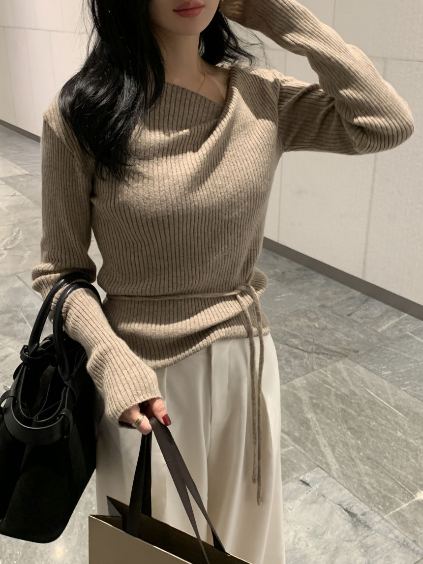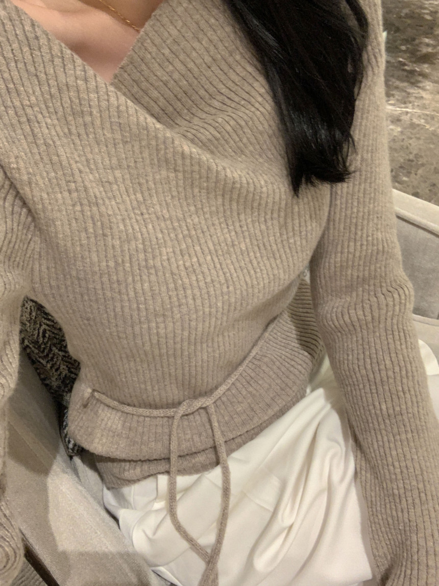 韓国の古典的な新しいデザインの三角形カットオフショルダープリーツストラップ長袖セータートップ女性用