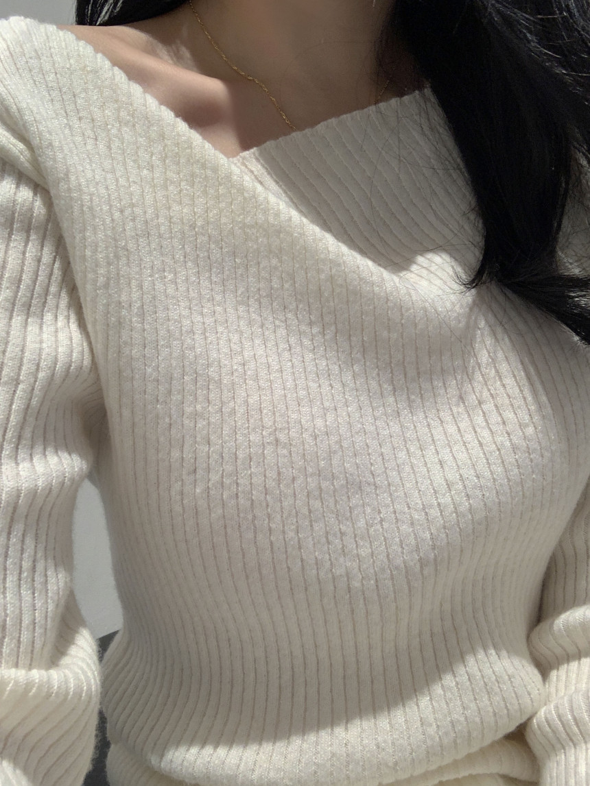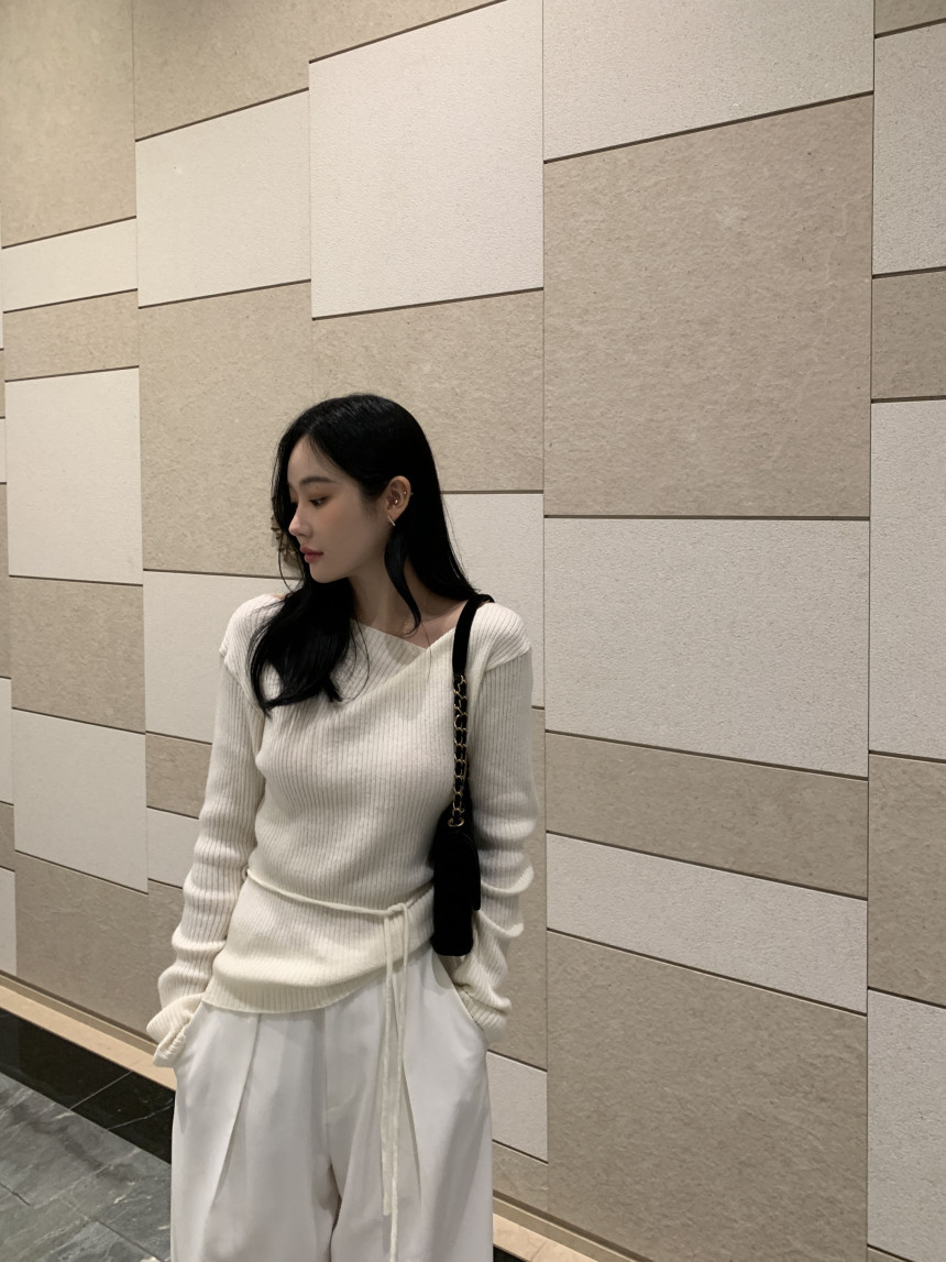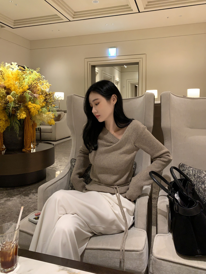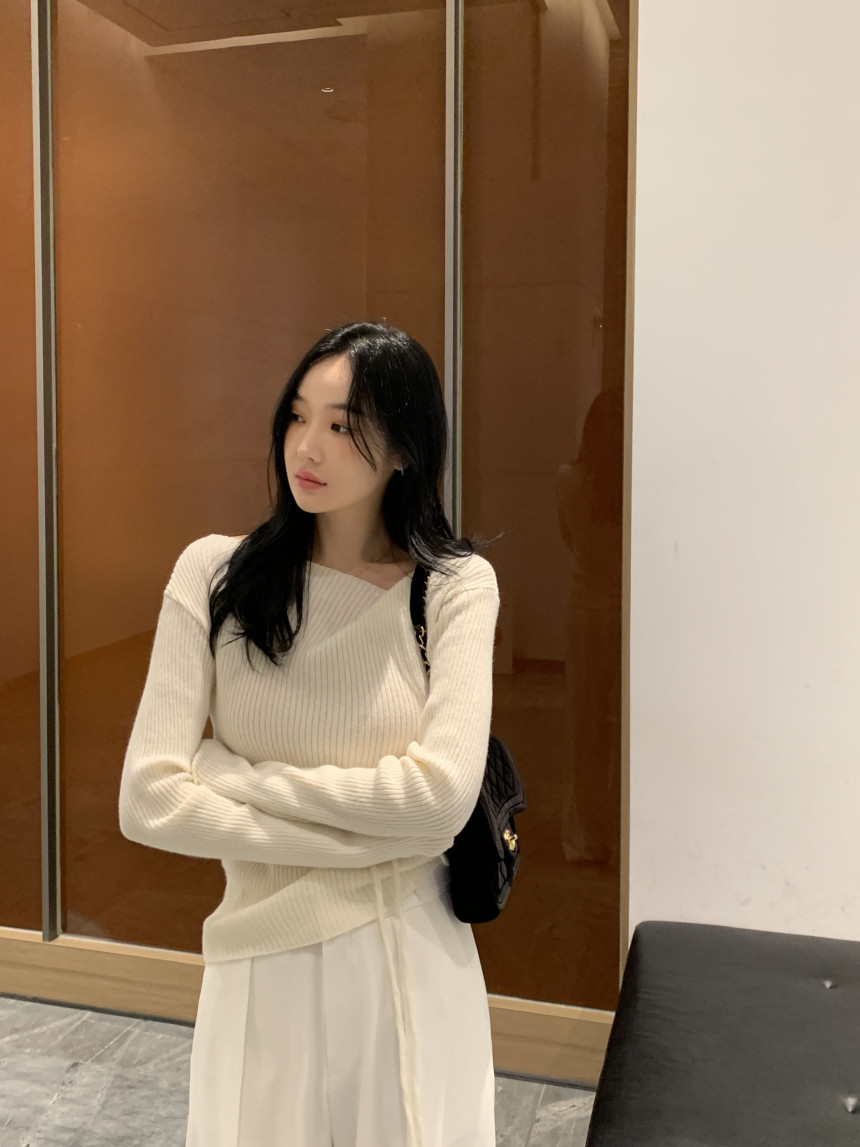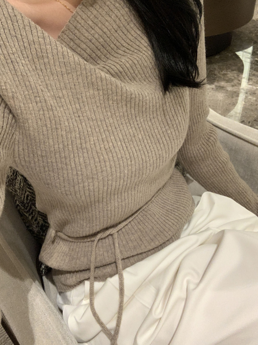 韓国の古典的な新しいデザインの三角形カットオフショルダープリーツストラップ長袖セータートップ女性用