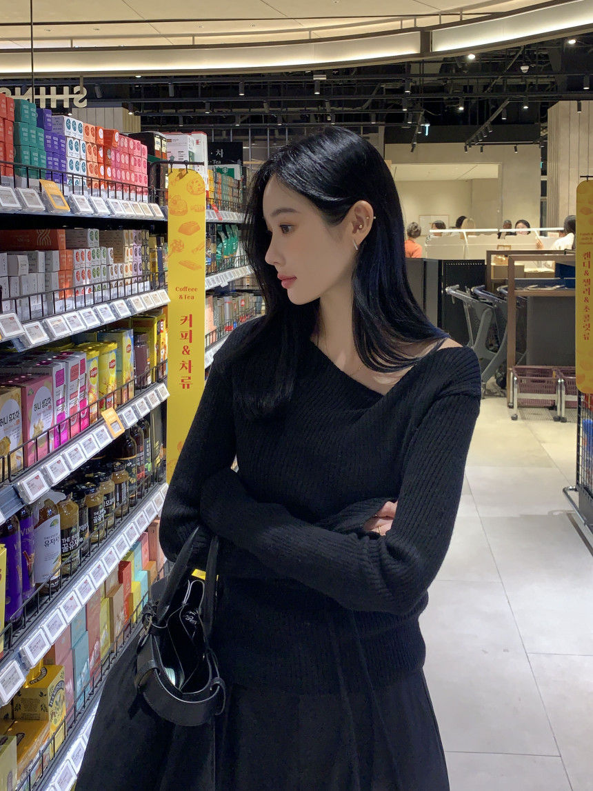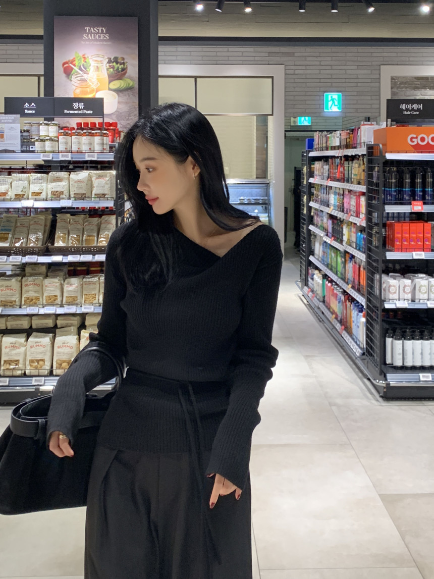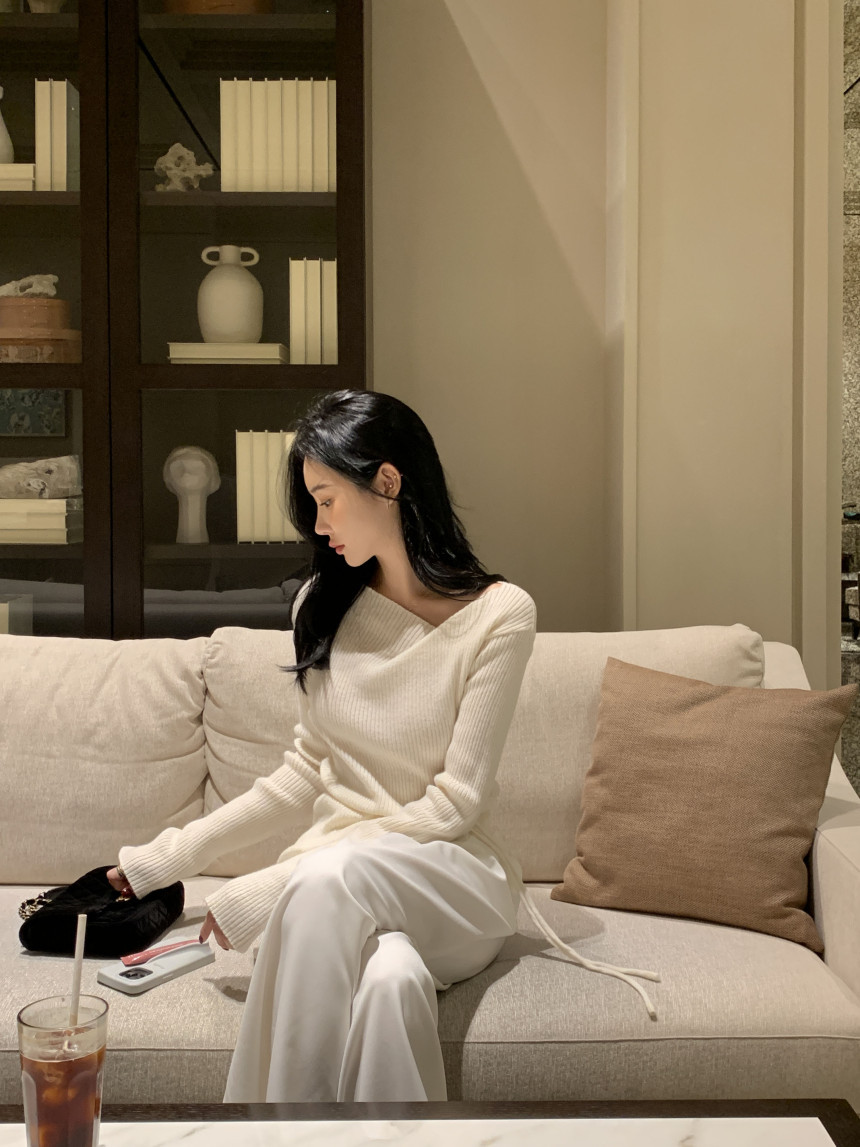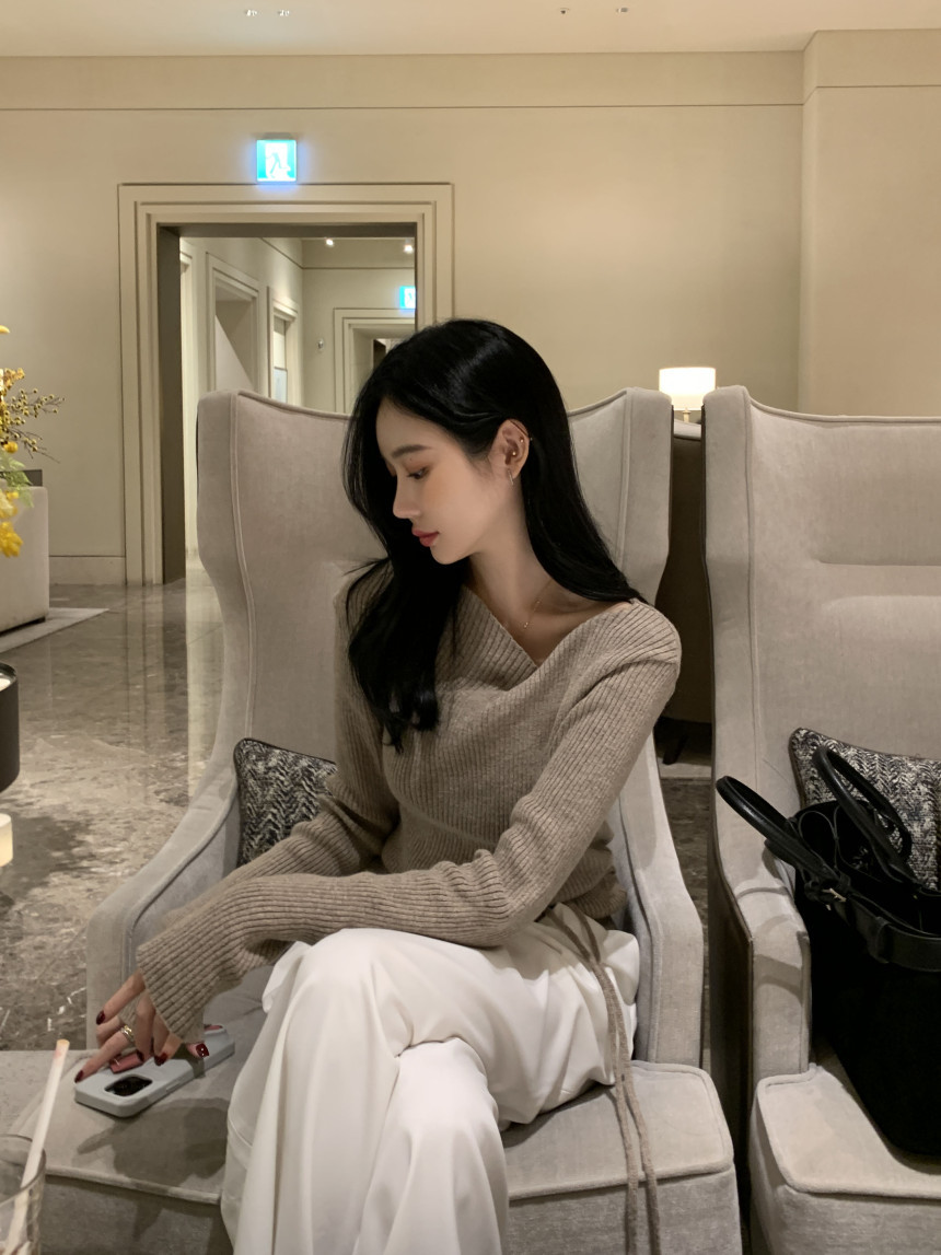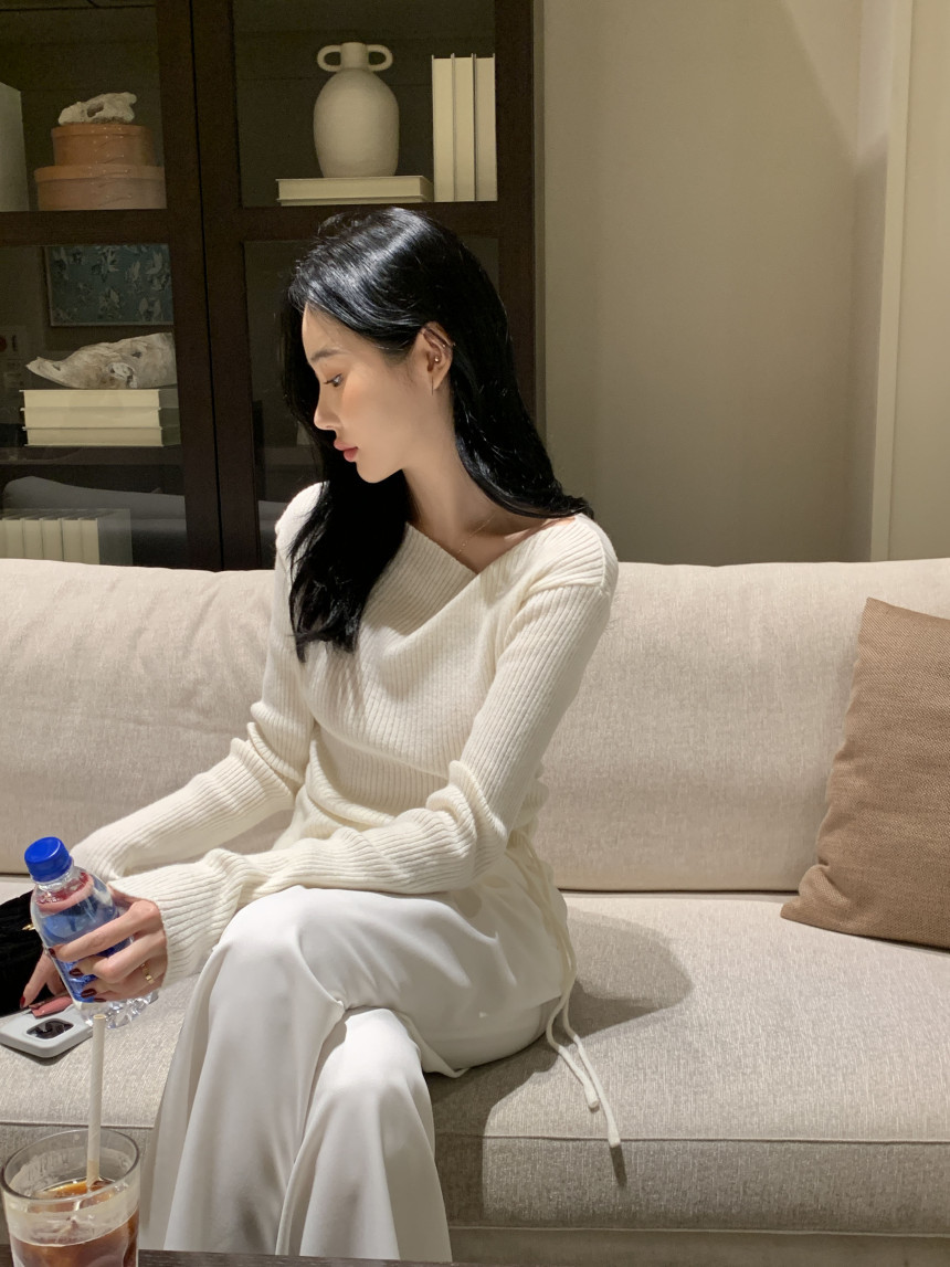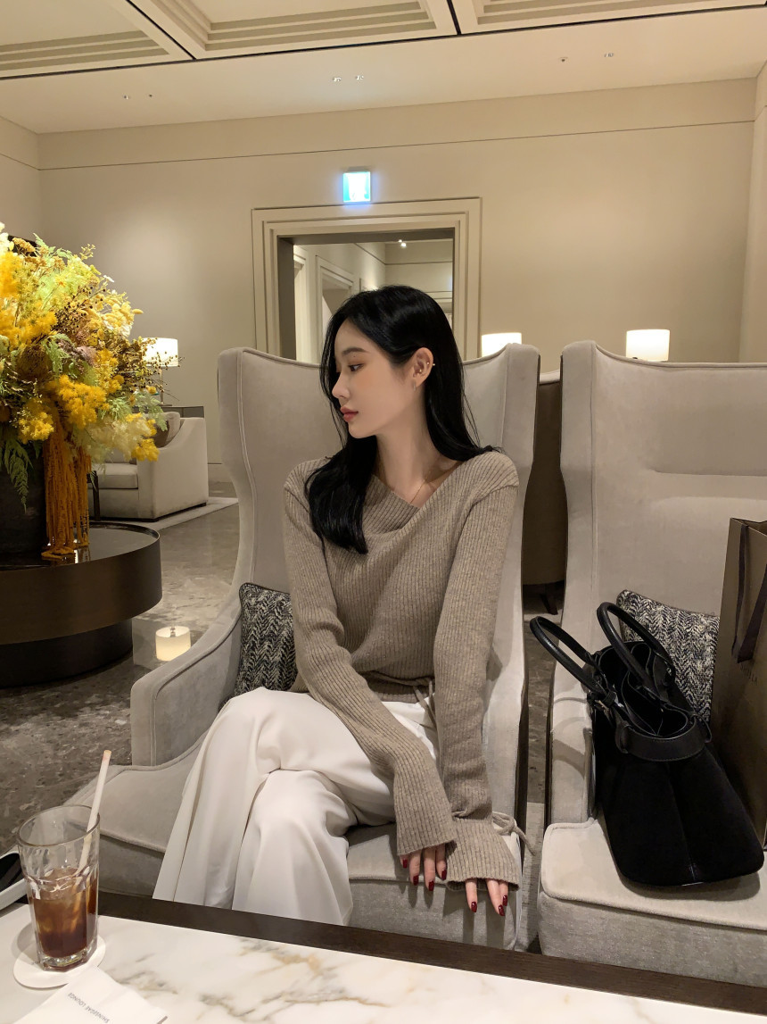 韓国の古典的な新しいデザインの三角形カットオフショルダープリーツストラップ長袖セータートップ女性用