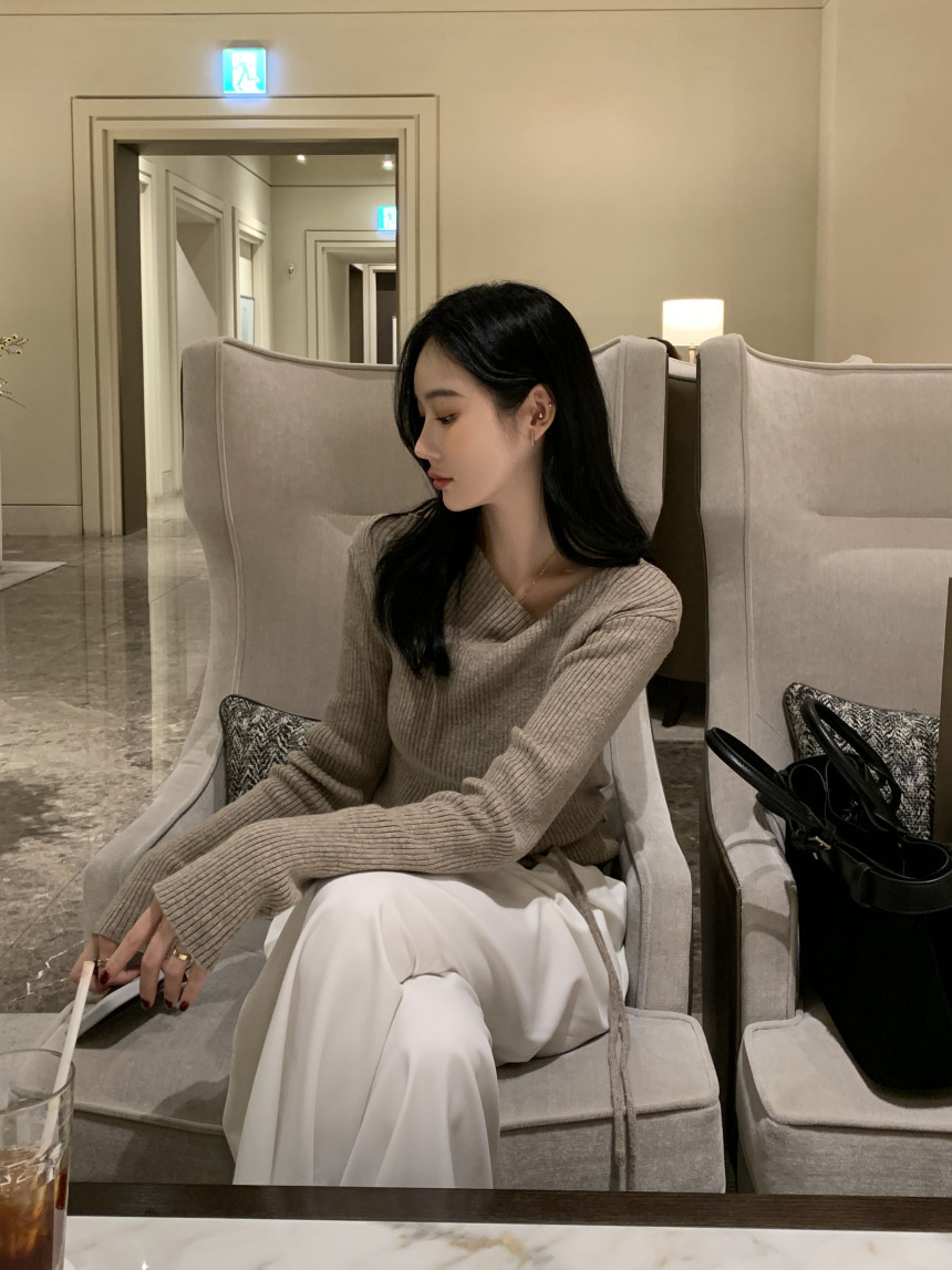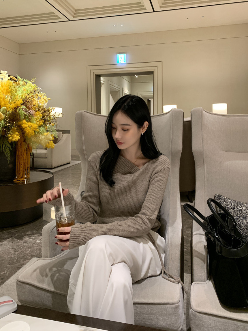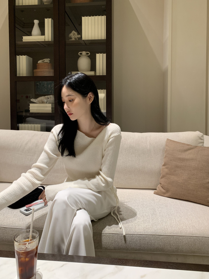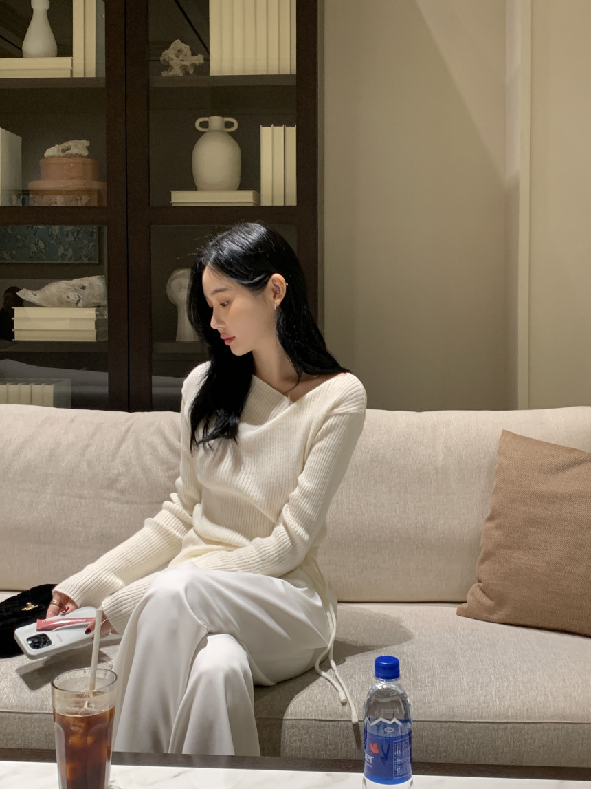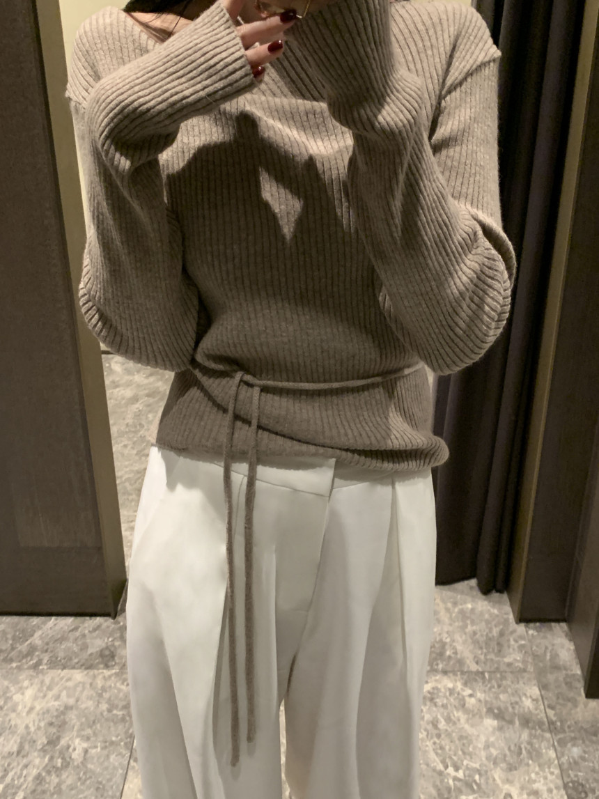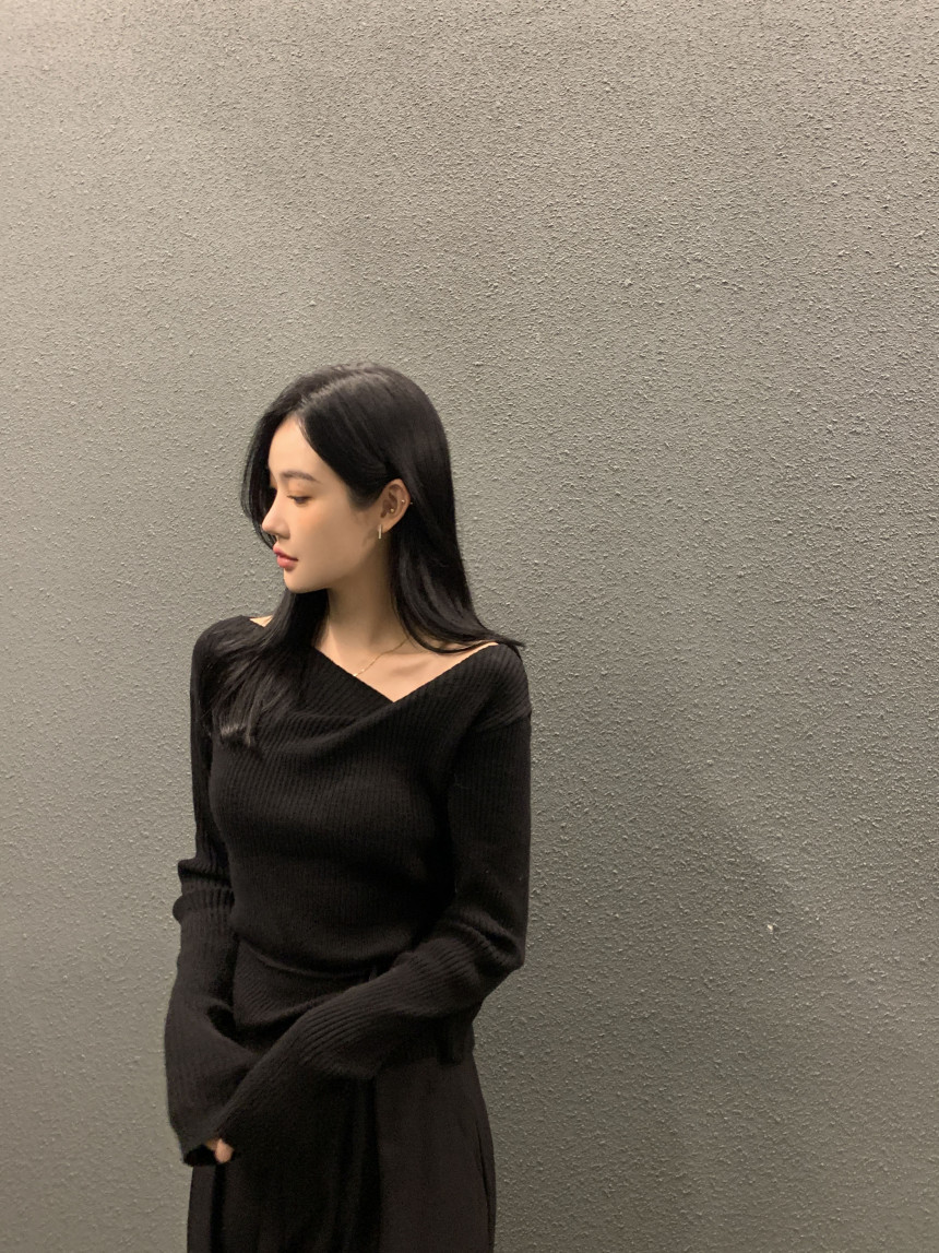 韓国の古典的な新しいデザインの三角形カットオフショルダープリーツストラップ長袖セータートップ女性用