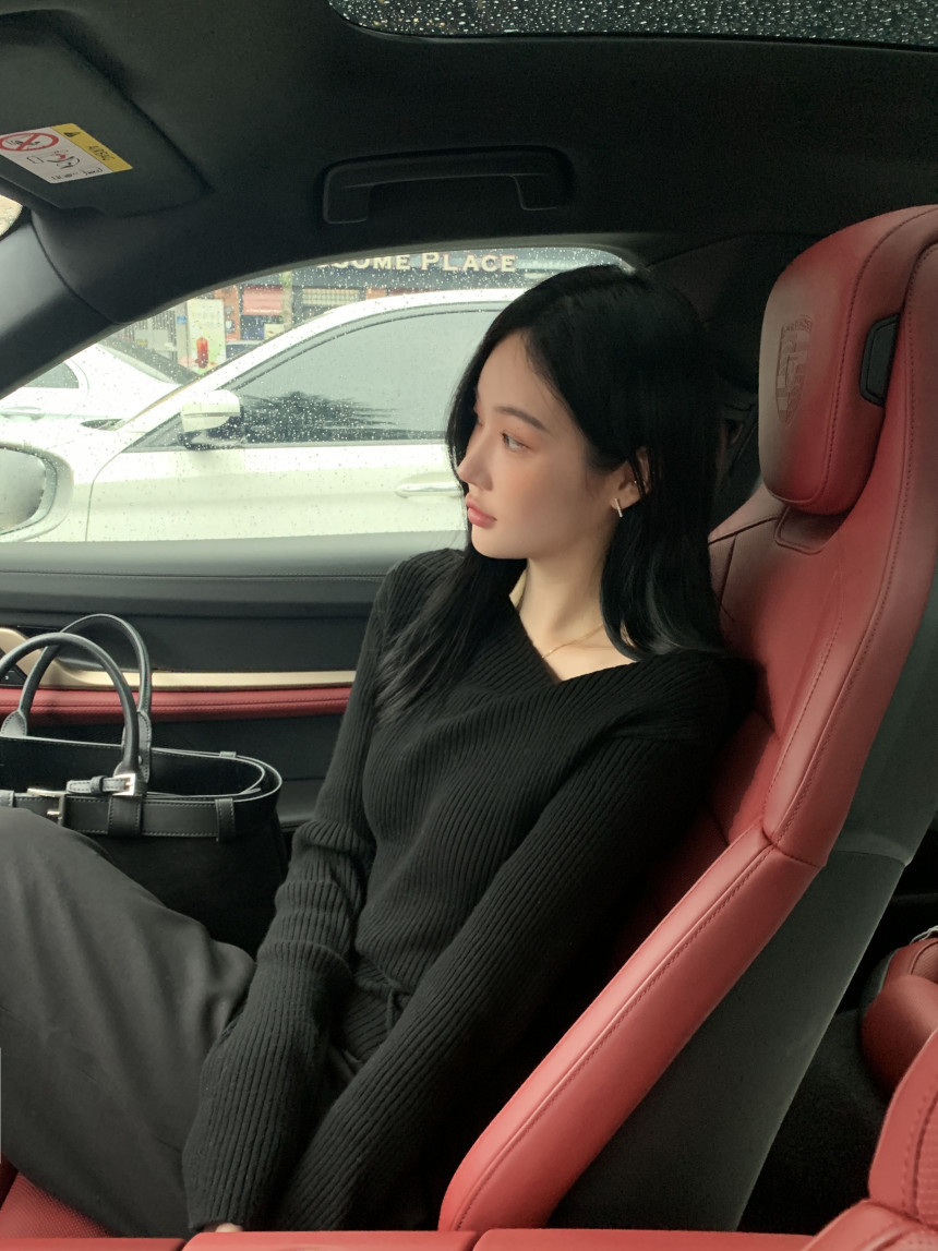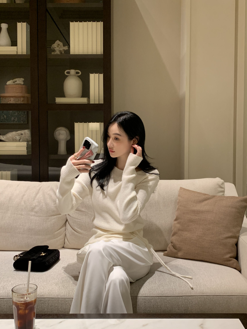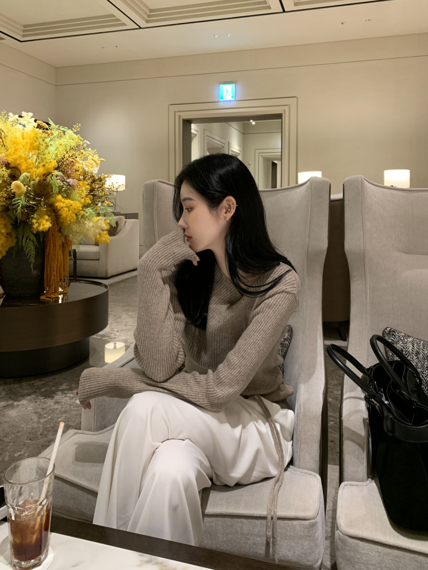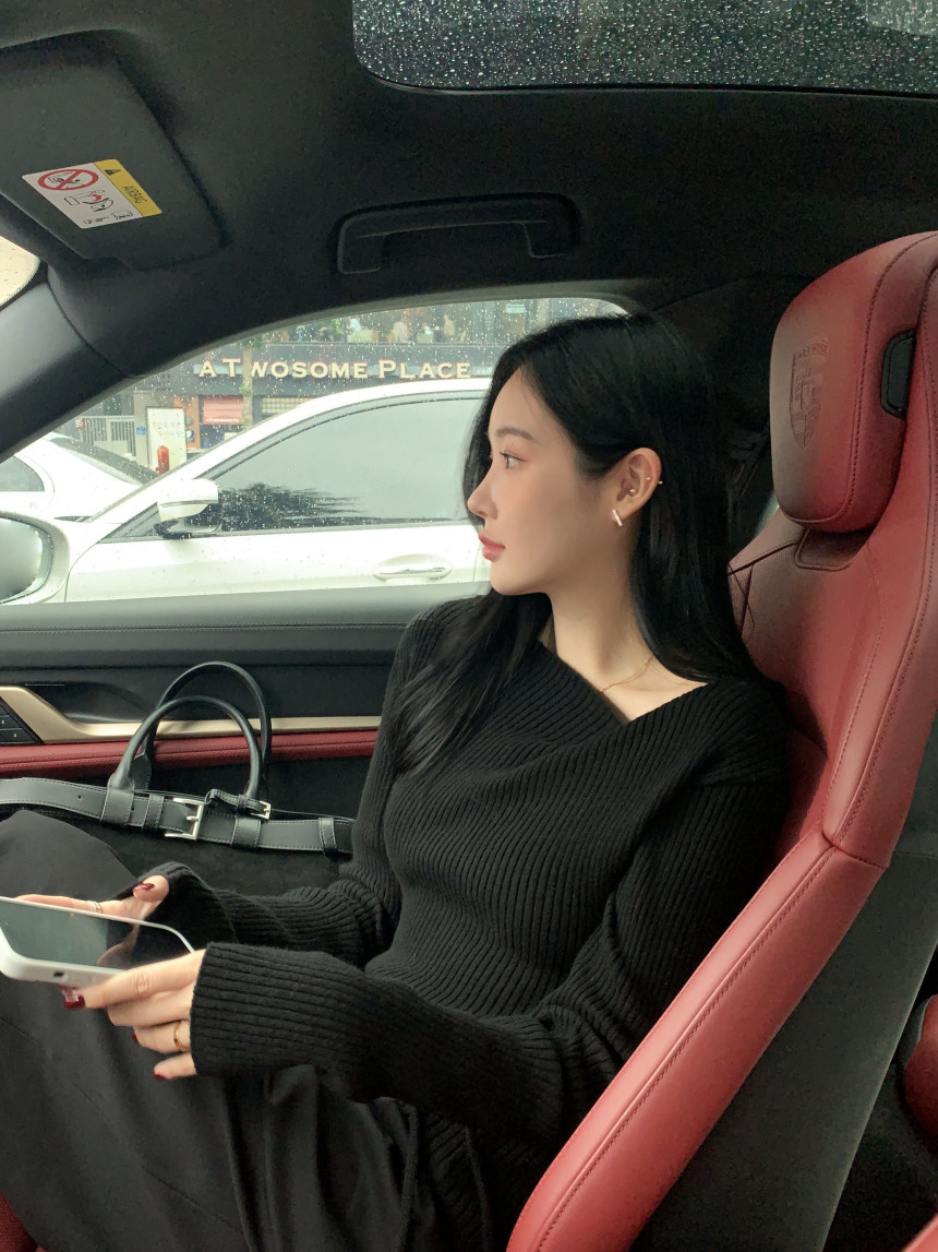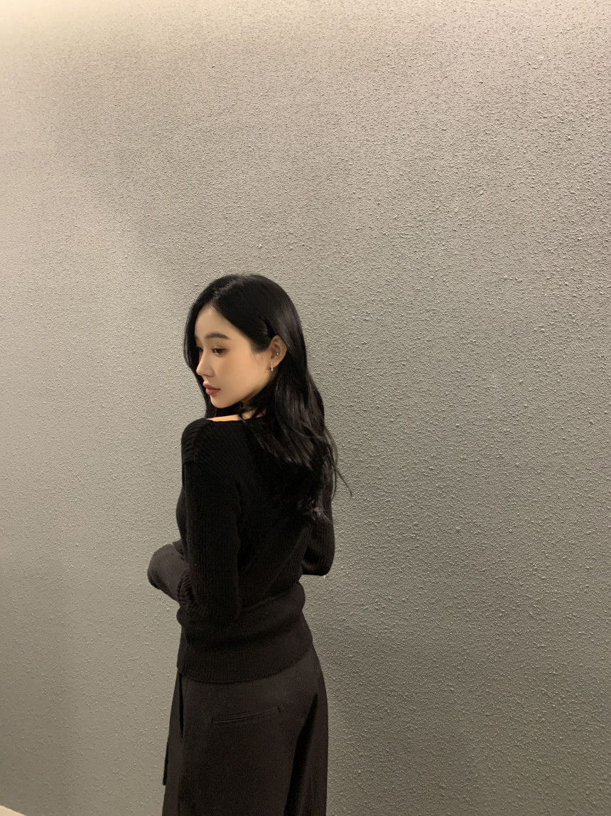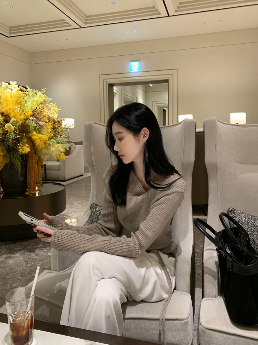 韓国の古典的な新しいデザインの三角形カットオフショルダープリーツストラップ長袖セータートップ女性用