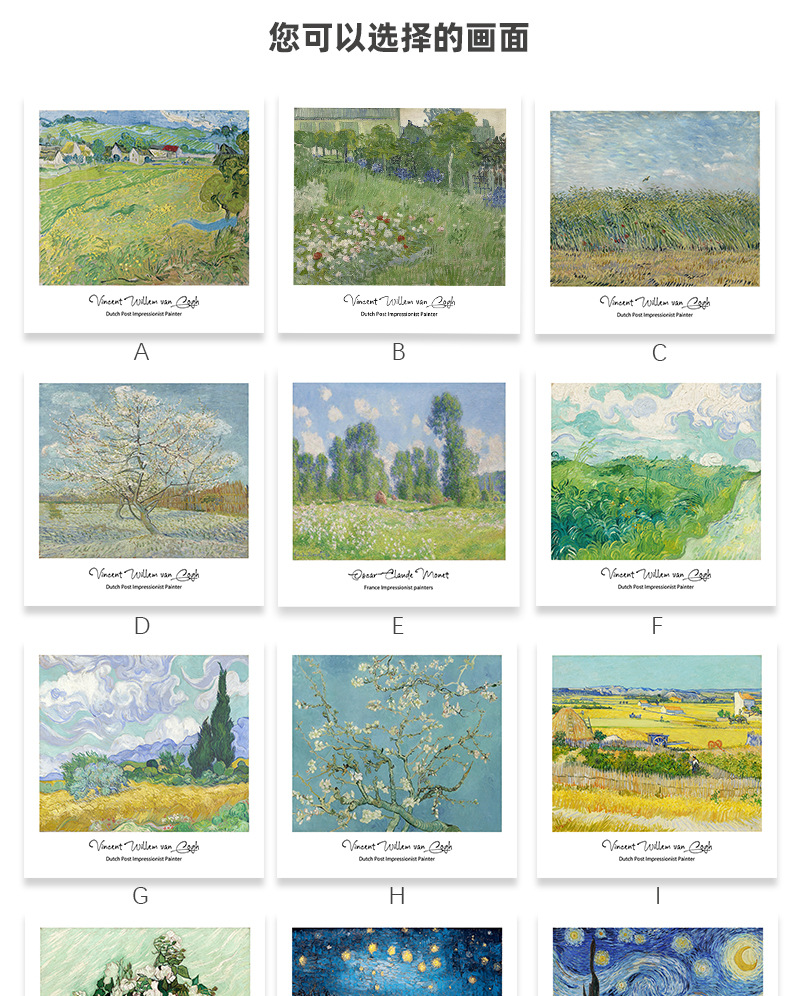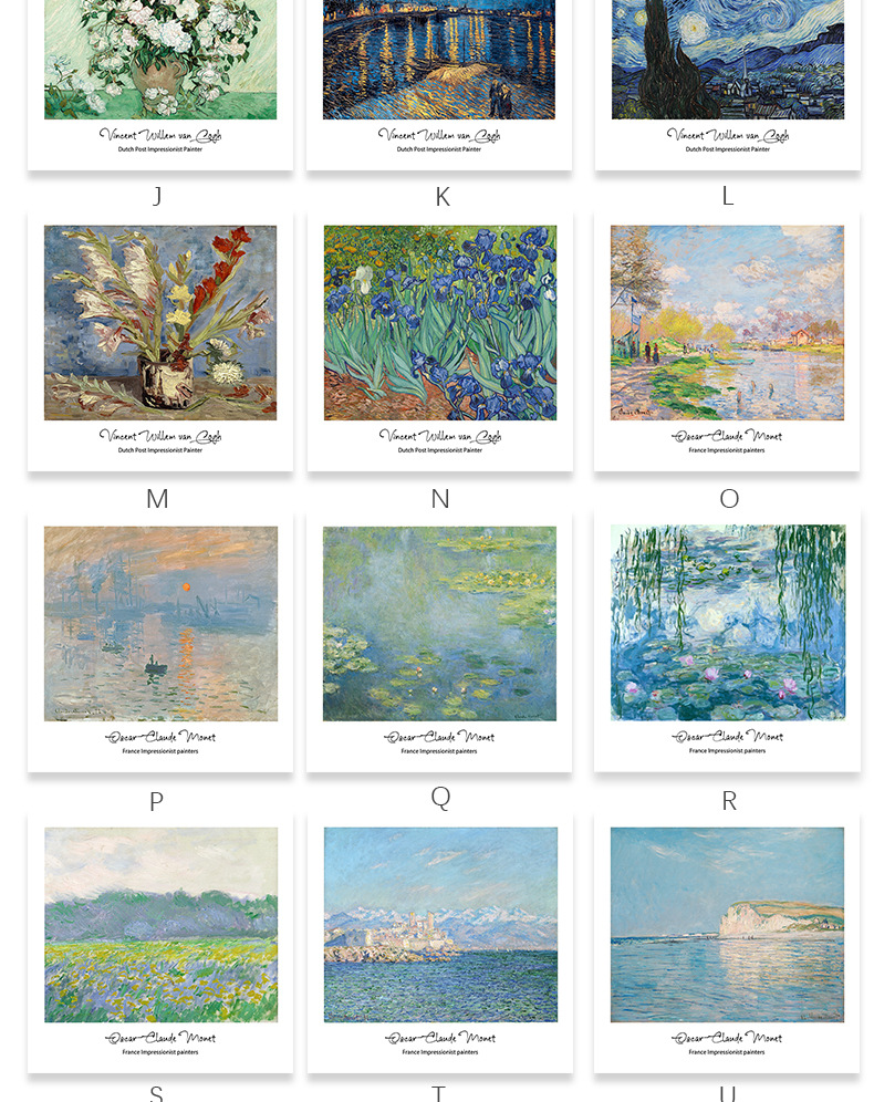 モデルA ゴッホ「オヴィの風景」,モデルB ゴッホ「ドビーの庭」,モデルC ゴッホ「雲雀小麦畑」,モデルD ゴッホ「咲く桃の花」,モデルE モネ「ジヴェニーの春」,F型ゴッホ「グリーンウィートフィールド」,Gモデル ゴッホ「麦畑・ヒノキ」,H型ゴッホ「咲く杏の花」,タイプ I ゴッホ「収穫」,J型ゴッホ「白いバラ」,K型ゴッホ「セーヌ川沿いの星空の夜」,L型ゴッホ「星空」,N型ゴッホ「アイリス」,0 モネ「セーヌ川沿いの春」,Pスタイル モネ「サンライズインプレッション」,Qスタイル モネ「スイレン」,R型モネ「スイレンプール」,Sスタイル モネ「ジヴェニーの黄色いアイリス」,T型モネ「午後の街」,U型モネ「午後効果」