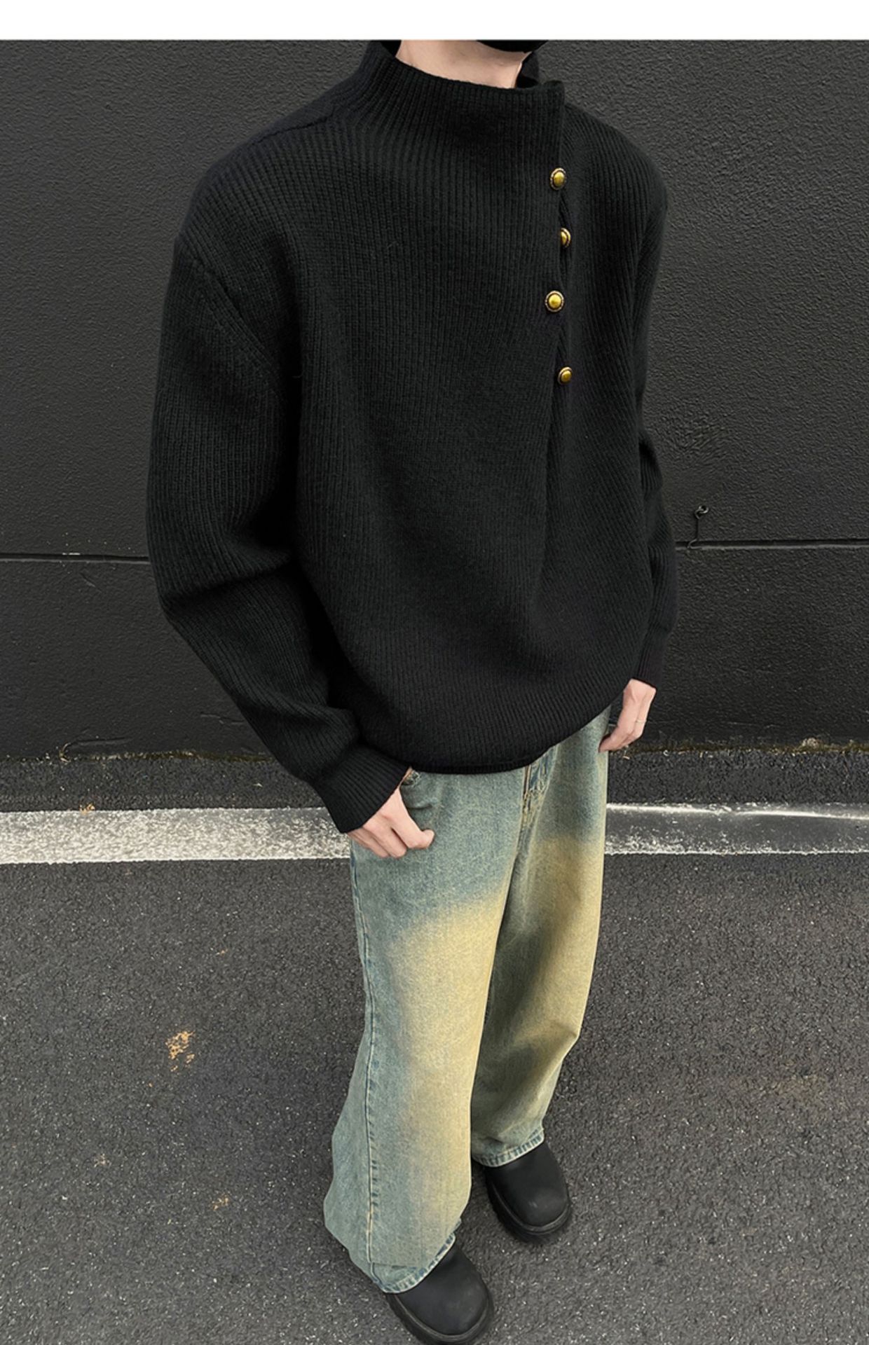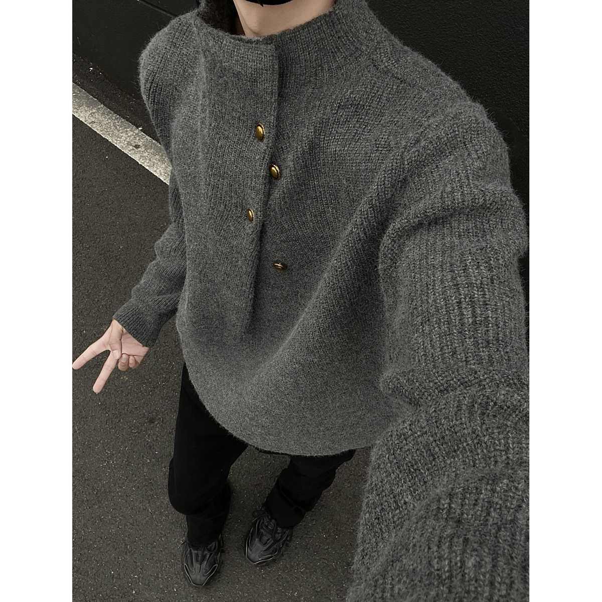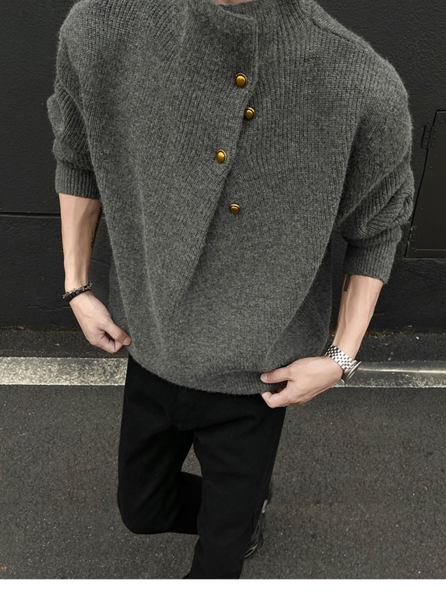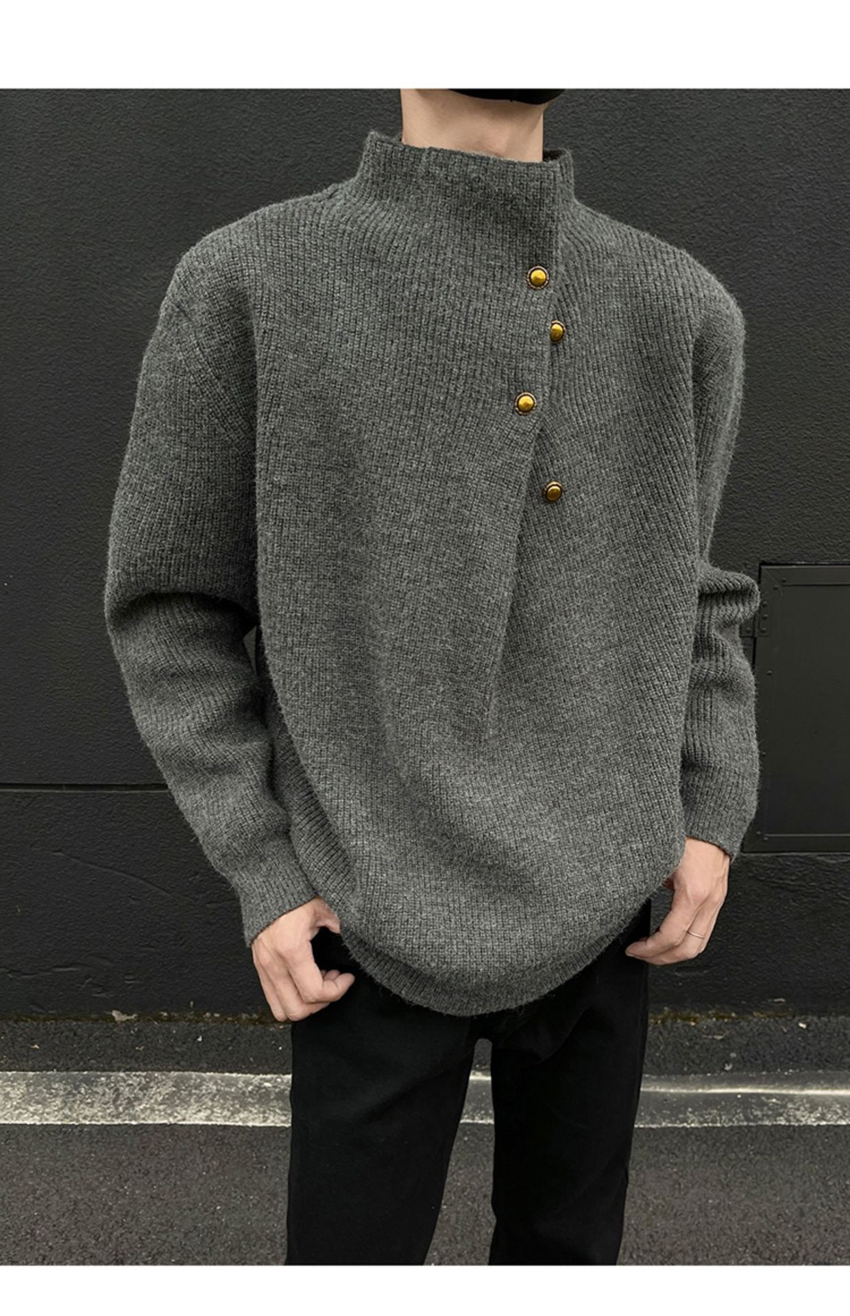 不規則なボタンのデザイン感の高い襟のセーターの男性の韓国系のファッションのブランドのごろつきのハンサムで怠惰なoversizeニットの上着