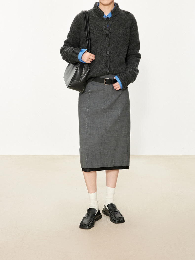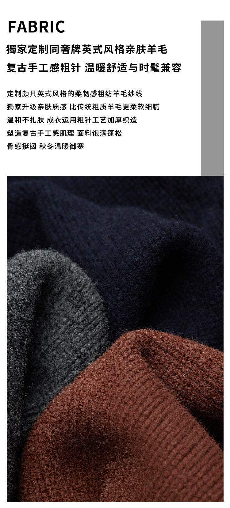 随性简约 日常休闲风范面料手感舒服, 柔软细腻、亲肤不扎不易变形、保暖性能好垂顺不失骨感, 肌理细腻有型, 穿着有型~~-复古手工感粗针定制颇具英式风格的柔韧感粗纺羊毛纱线,獨家升级亲肤质感,比传统粗质羊毛更柔软细腻,温和不扎肤。成衣运用粗针工艺加厚织造,塑造复古手工感肌理,面料饱满蓬松,骨感挺阔,秋冬温暖御寒~~