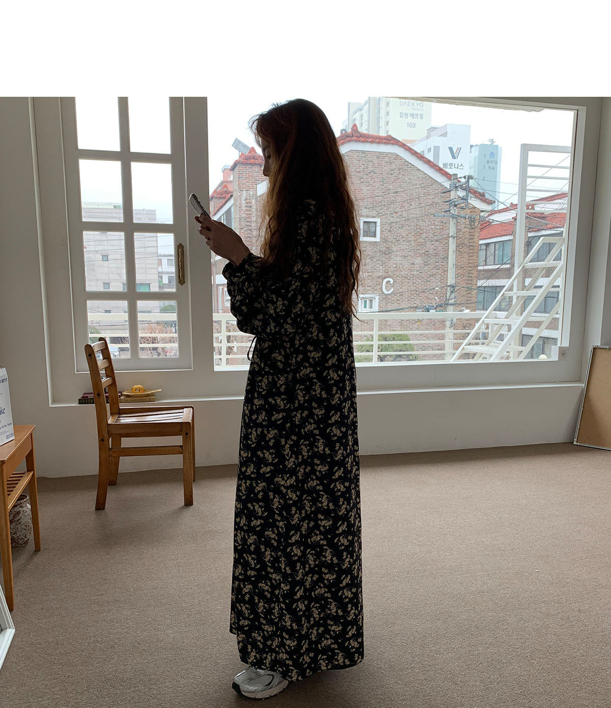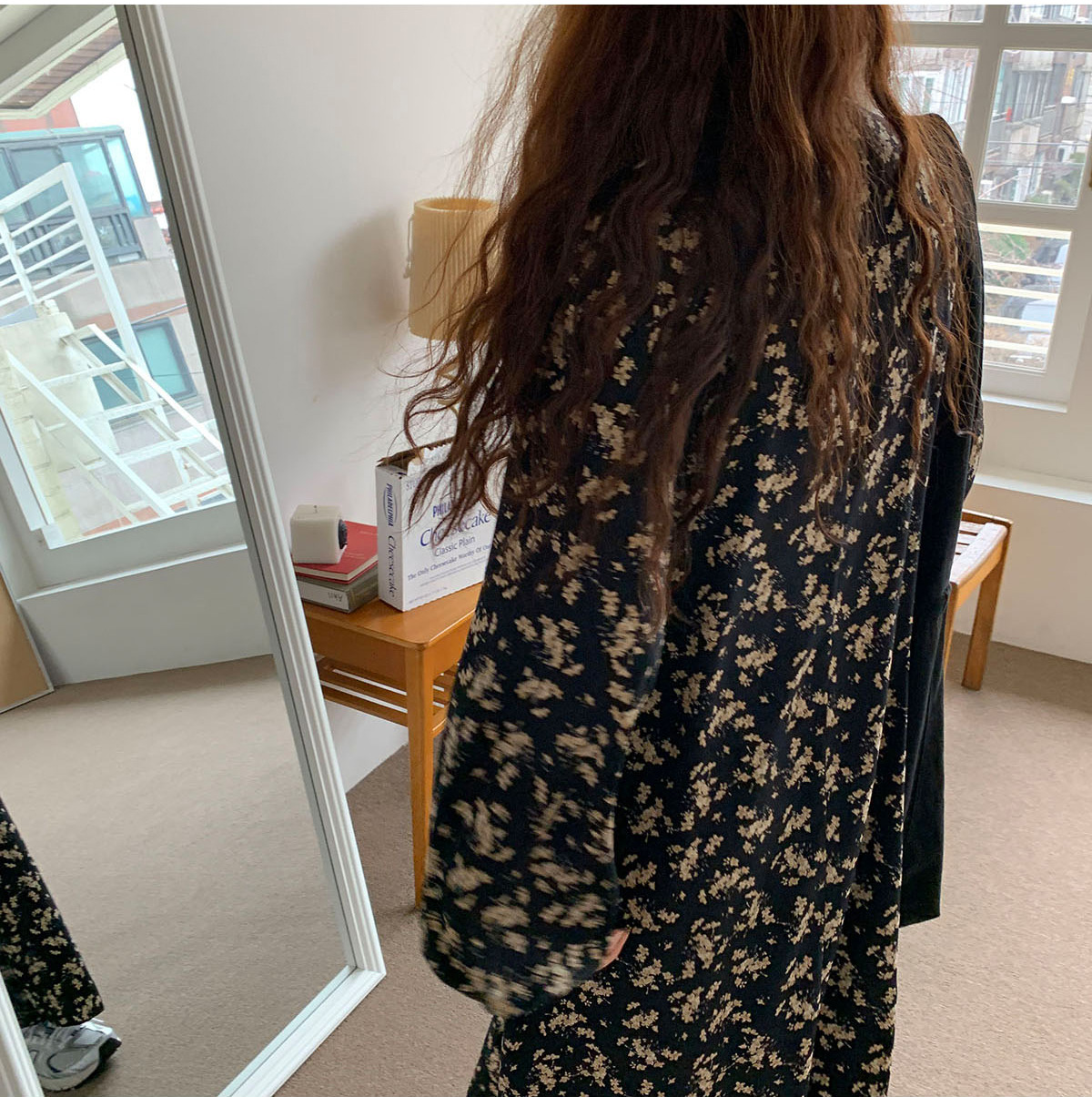 韓国チ春レトロエレガントな V ネックフルスクリーン花柄ルーズオールマッチビッグポケット長袖ドレスロングスカート女性