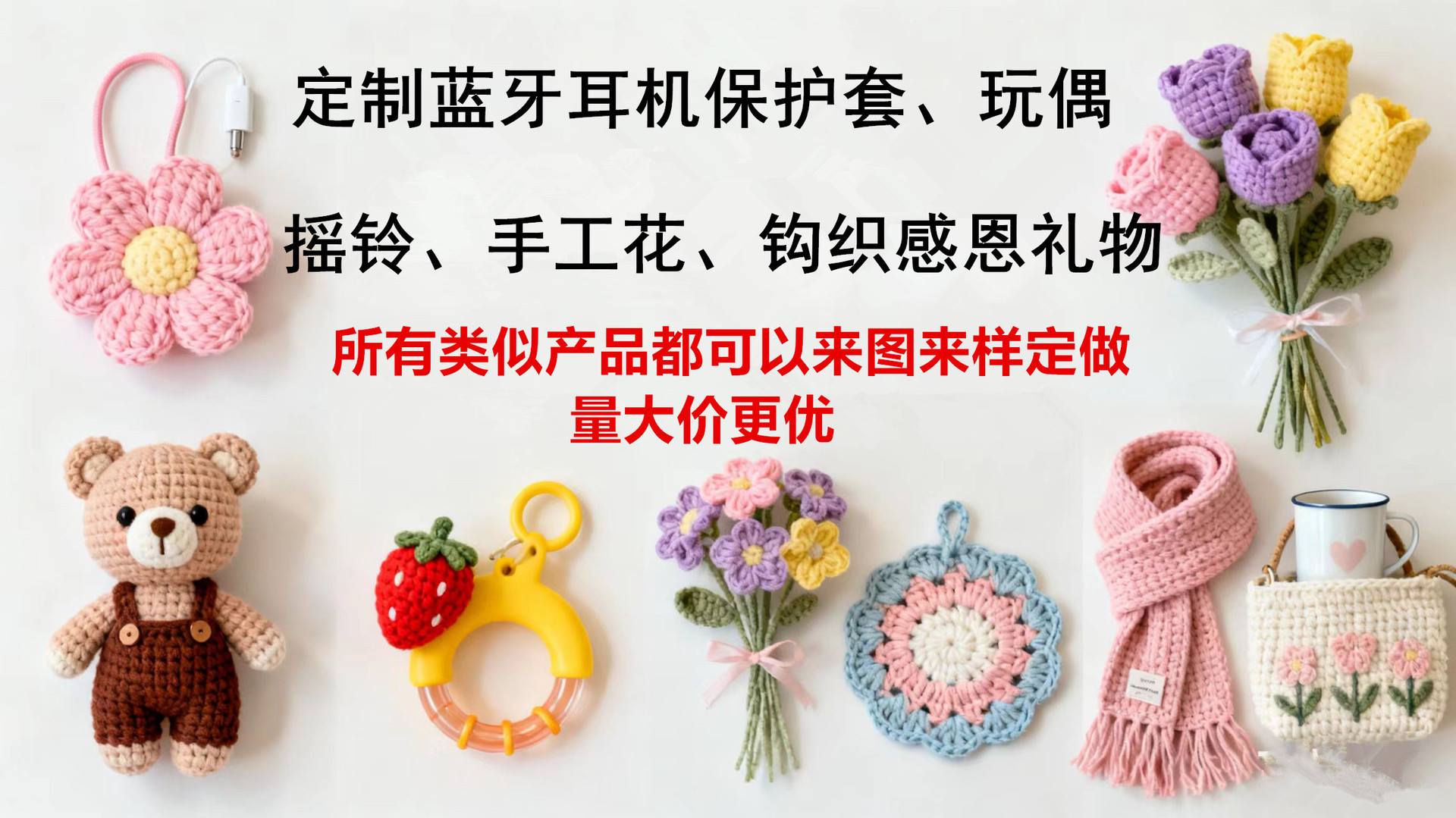 - 手工摇铃玩偶产品特点:款式新颖可爱,毛线材质安全柔软,没有味道,不掉色,手工缝合过拉力测试,练习宝宝抓握能力。摇铃内部有铃铛,抓摇有声音,响声吸引宝宝注意力,是婴幼儿首选的互动玩具。