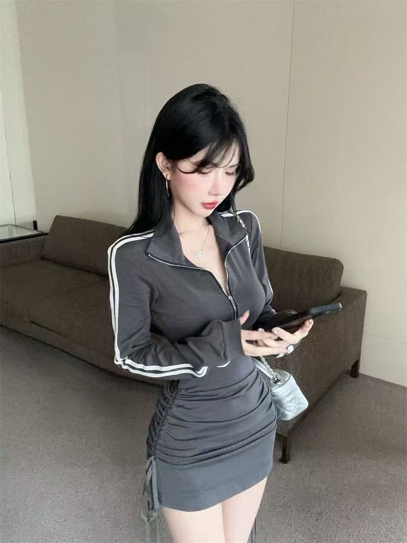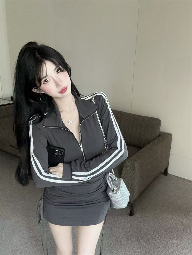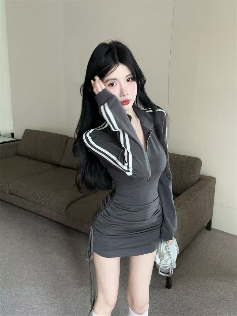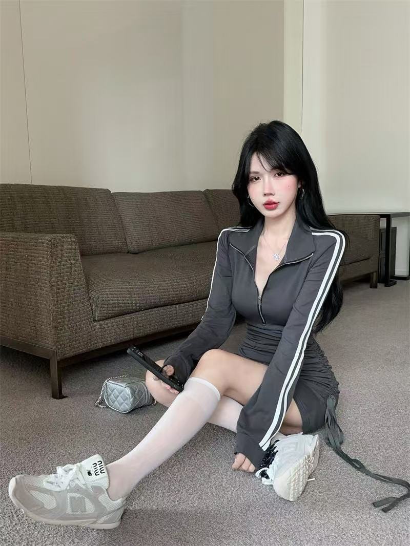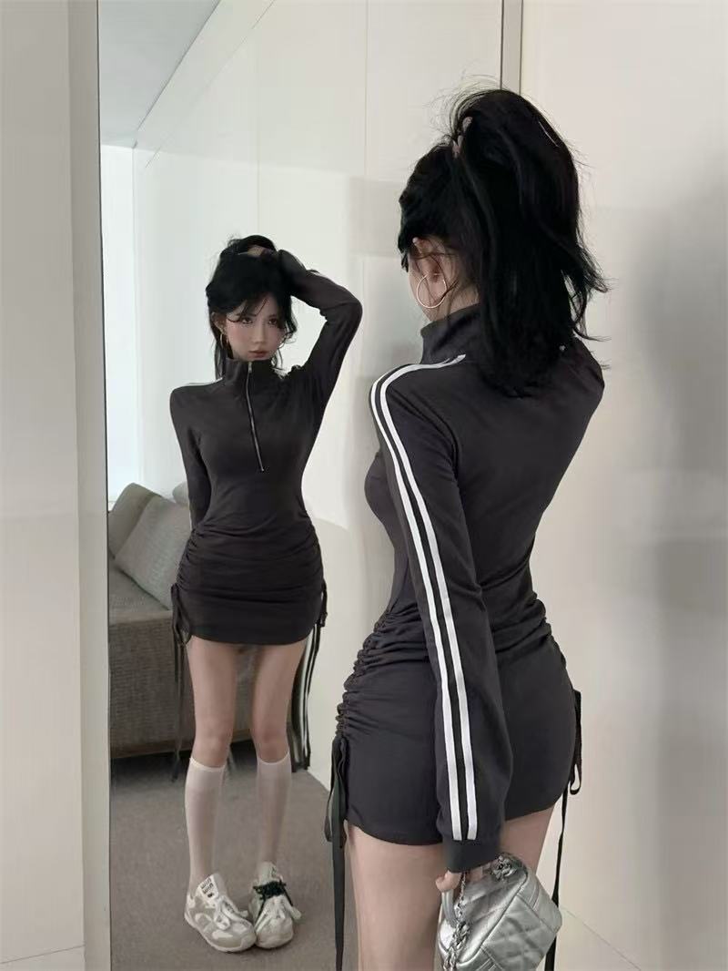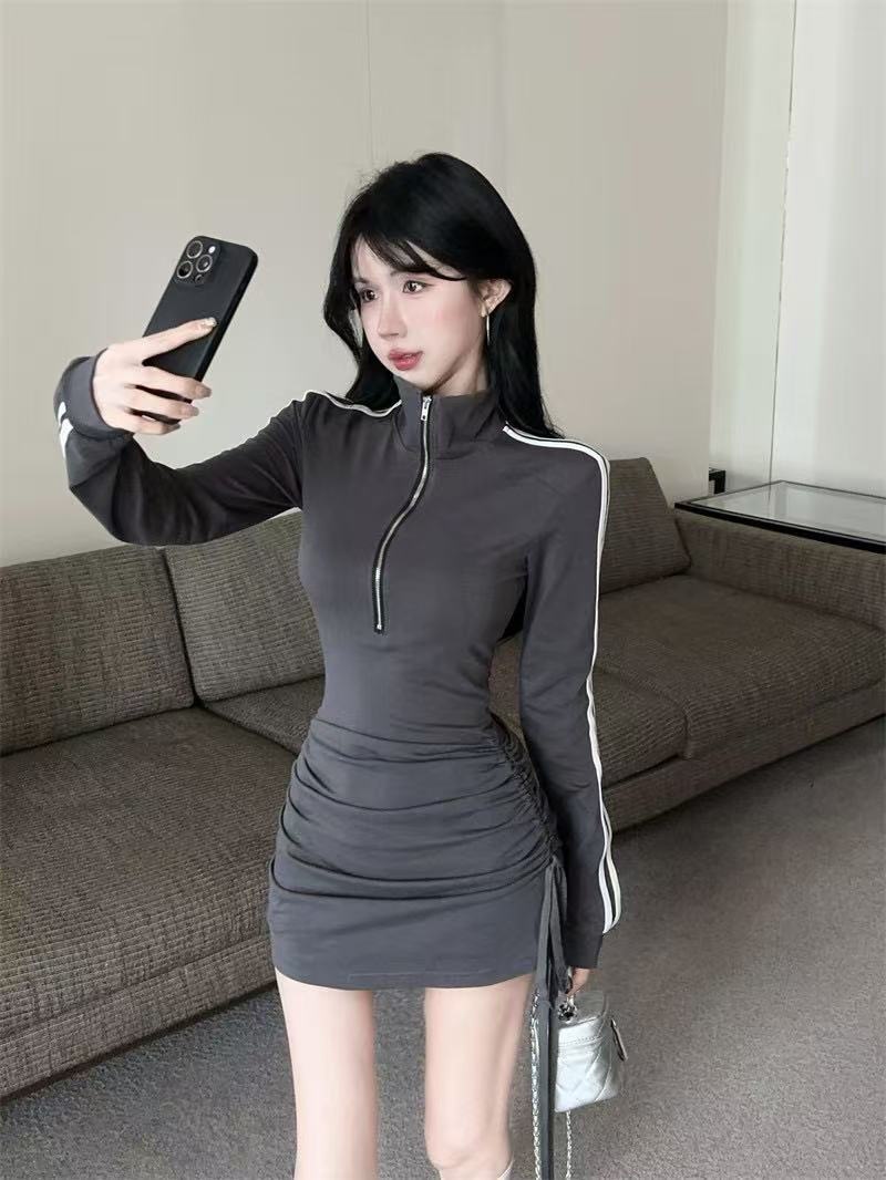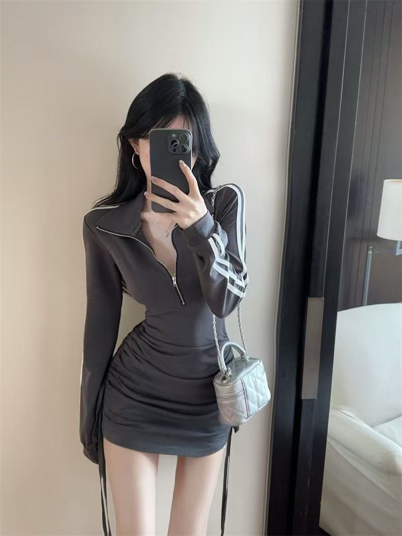 新型の香港風の小さい衆のpolo襟のファスナーの長袖のワンピースの女性のスポーツの風のギャルのしわの修身はヒップのスカートを包みます
