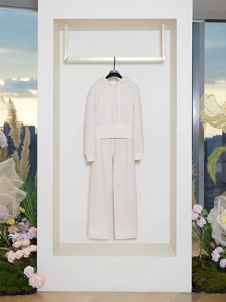 オフホワイトのスウェットシャツ,オフホワイトのスウェットパンツ,グレーのスウェットシャツ,グレーのスウェットパンツ