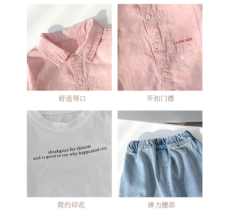 ピンクのシャツ,ホワイトイングリッシュT,ジーンズ