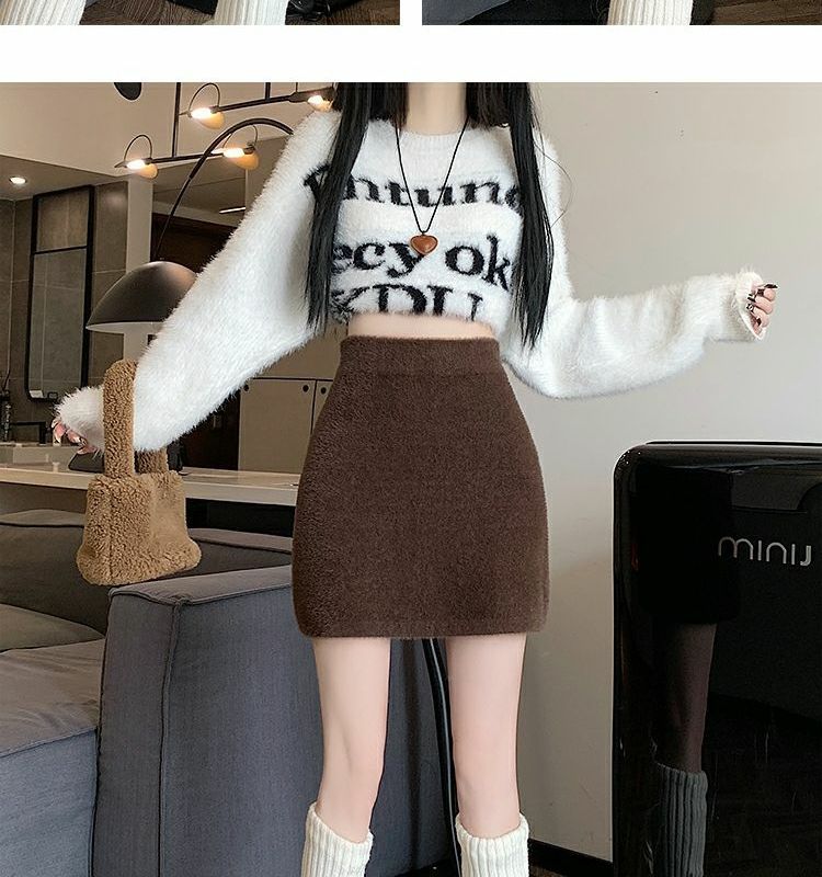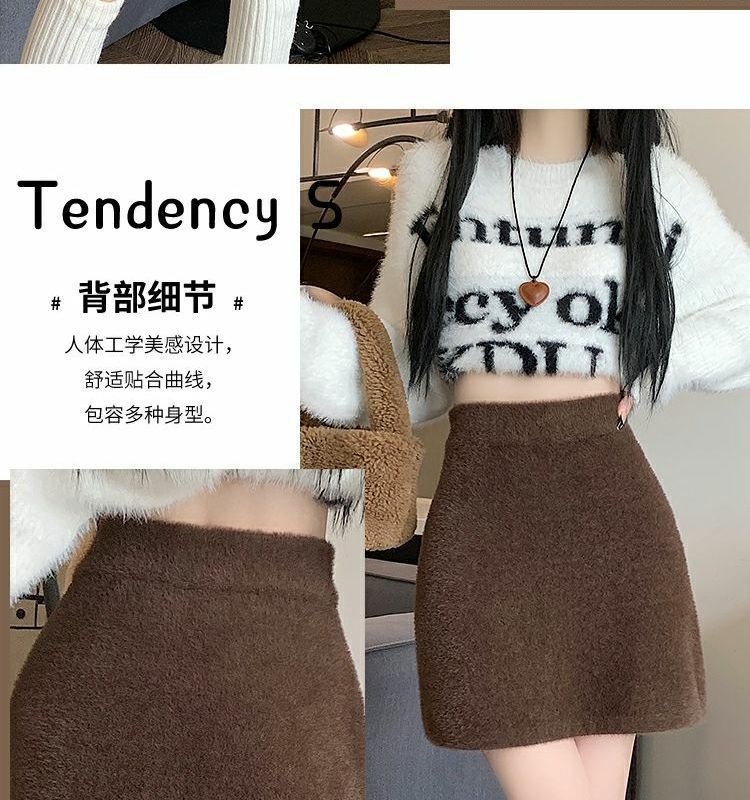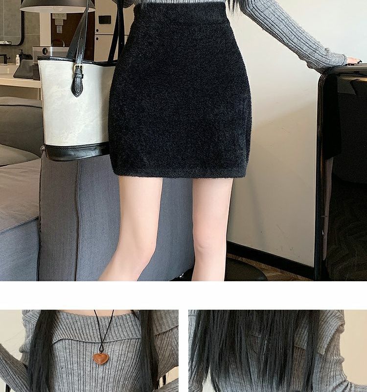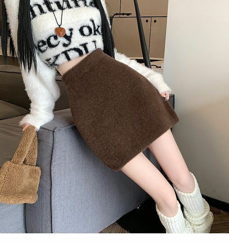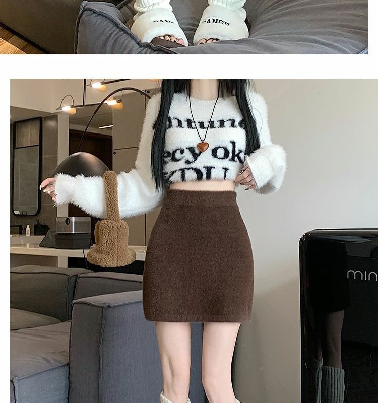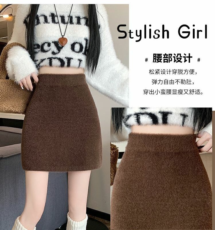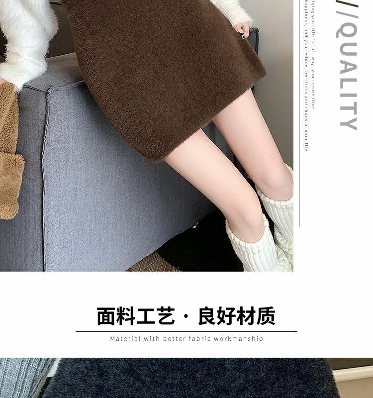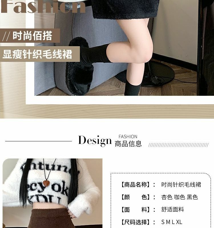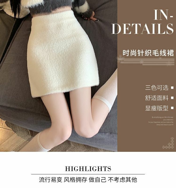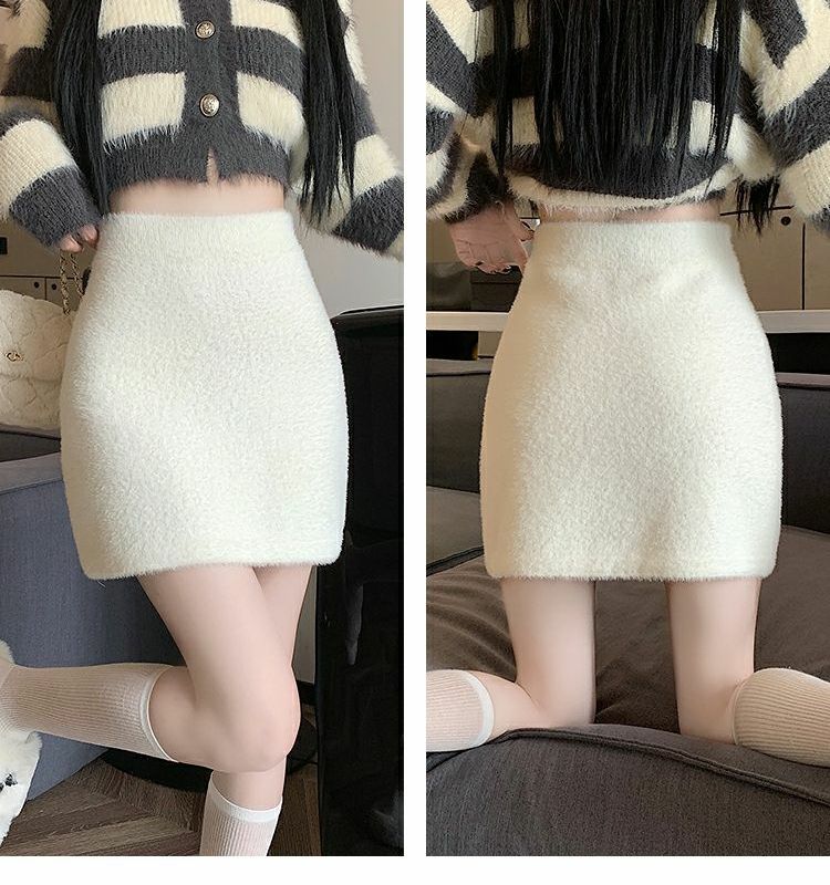 冬の白いスカートの半身のスカートの女性の秋冬の2024の新型の高い腰の包みの尻のニットのスカートの小さい背のぬいぐるみのスカート