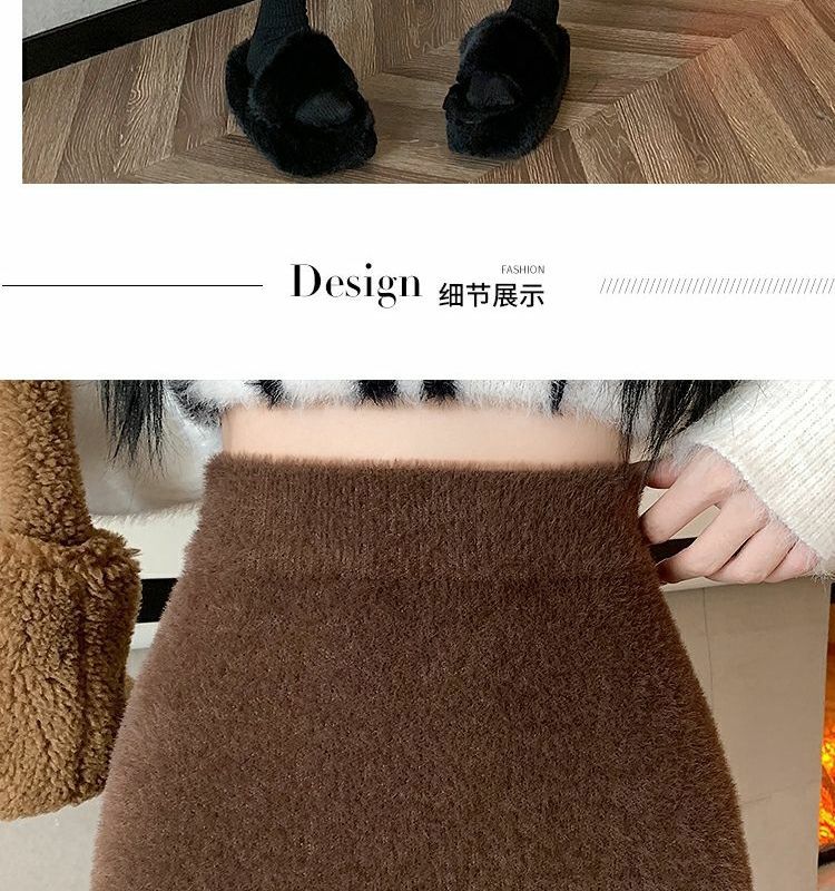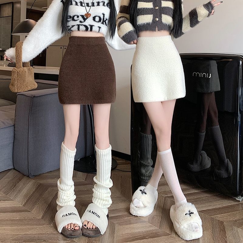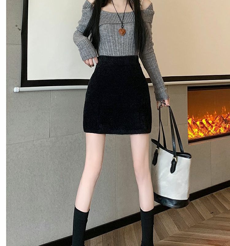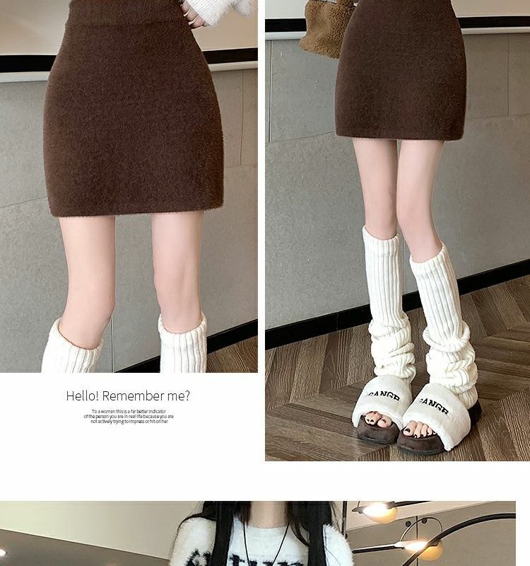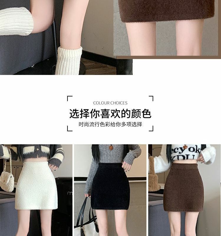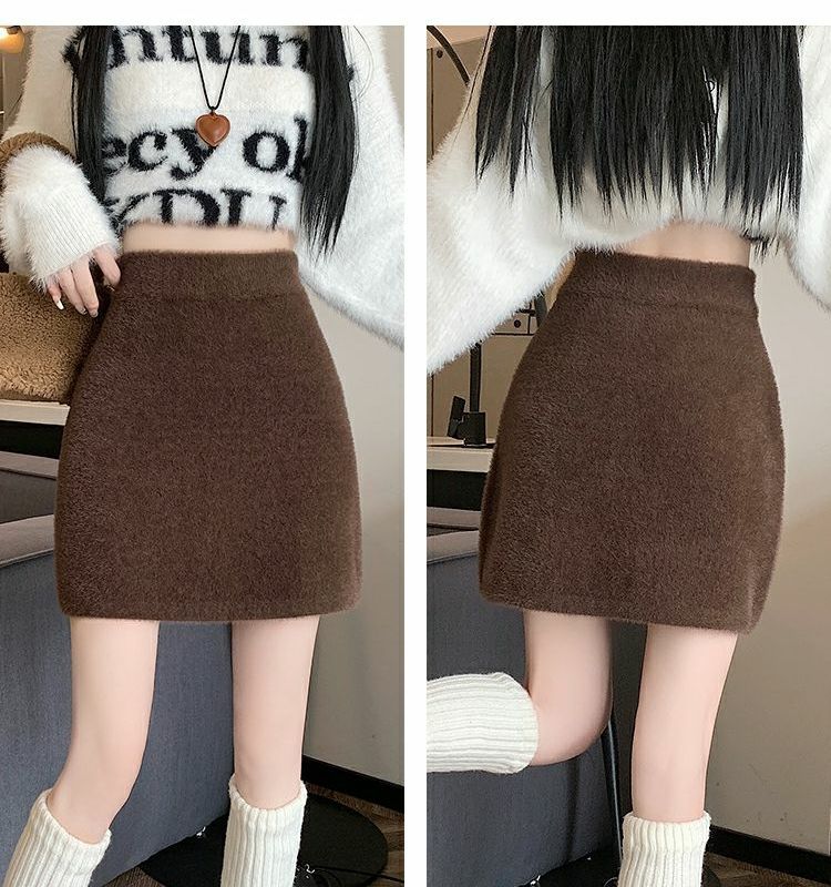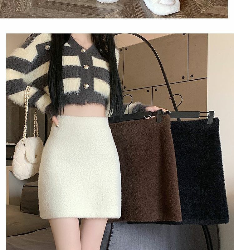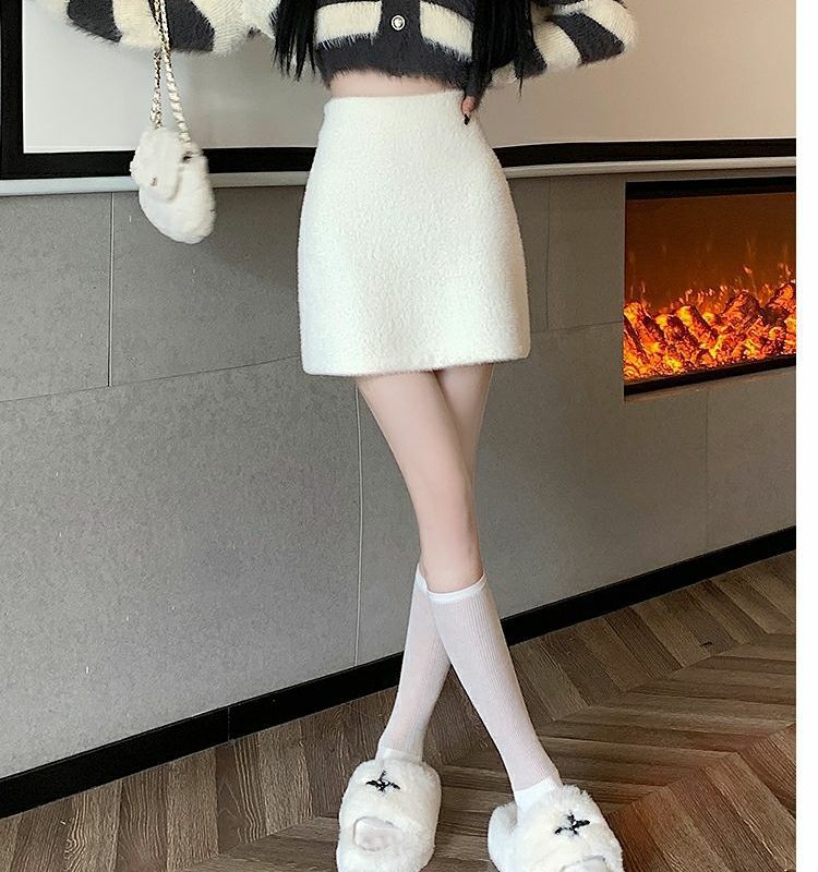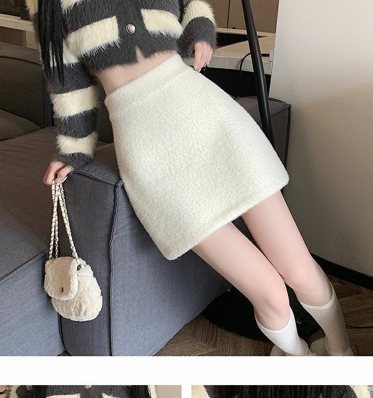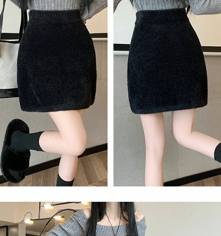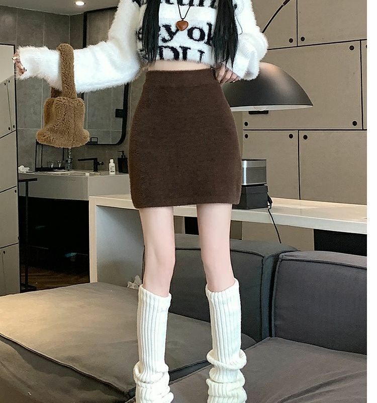 冬の白いスカートの半身のスカートの女性の秋冬の2024の新型の高い腰の包みの尻のニットのスカートの小さい背のぬいぐるみのスカート
