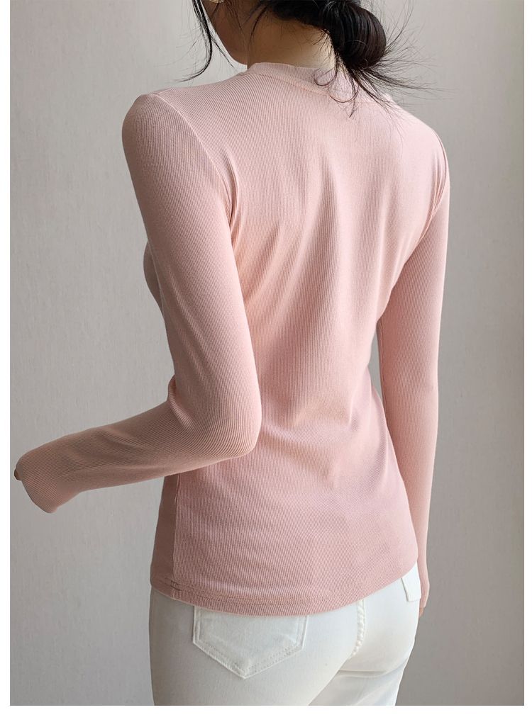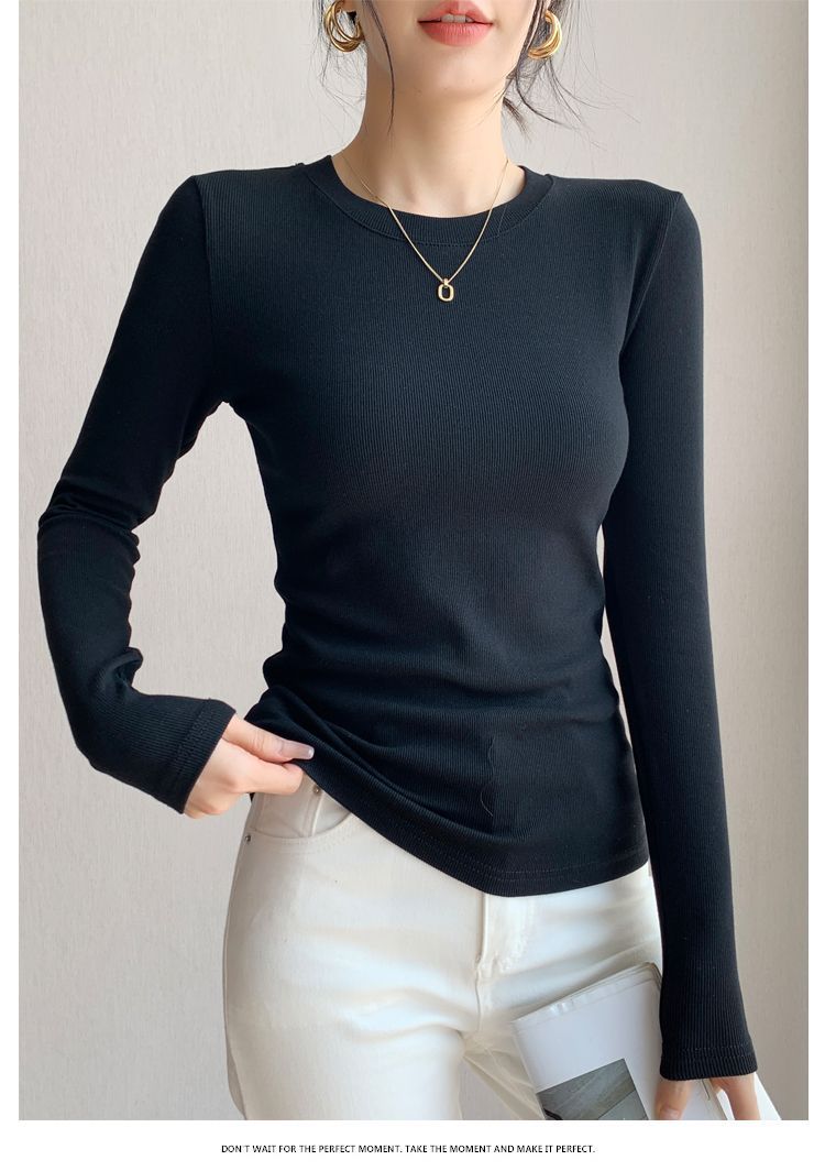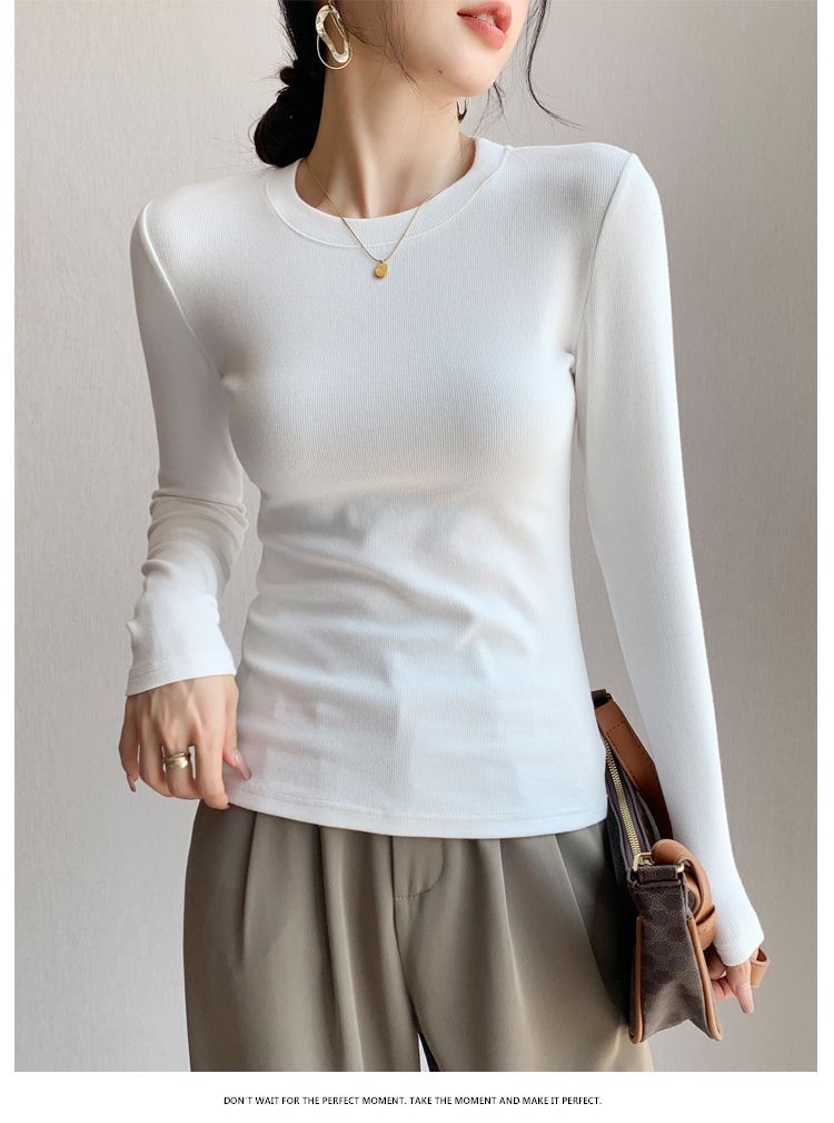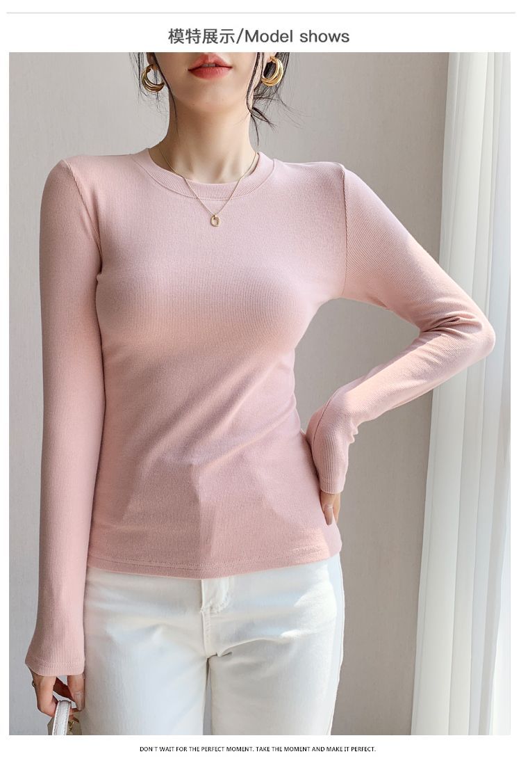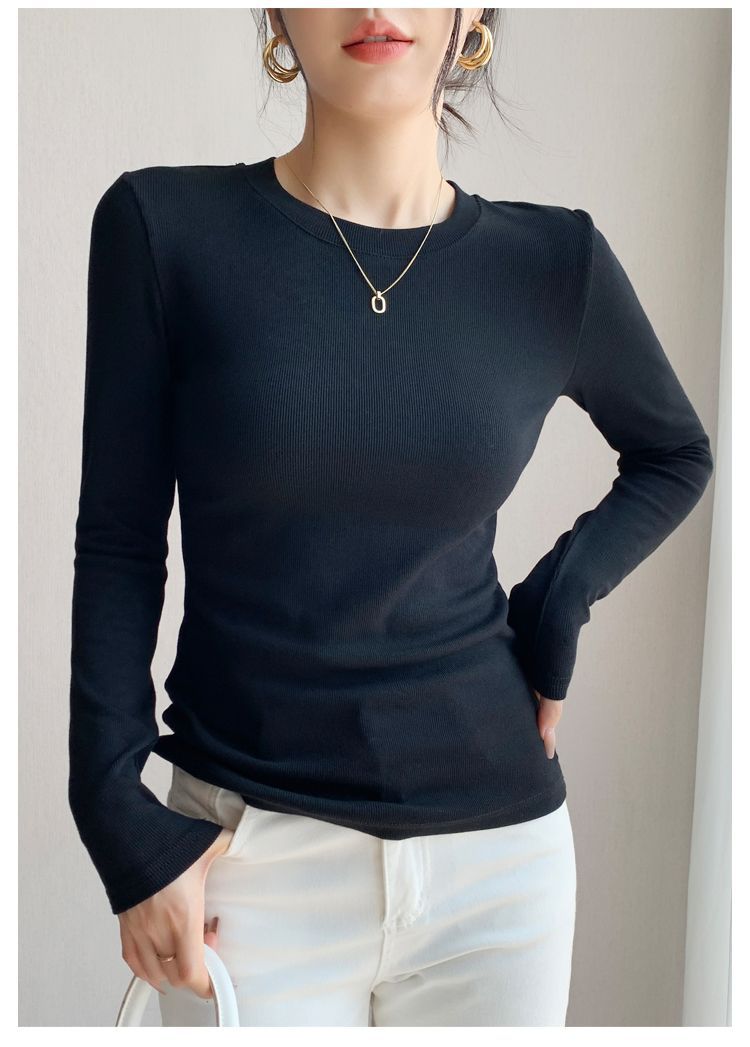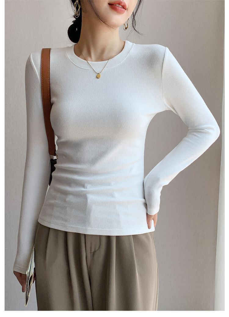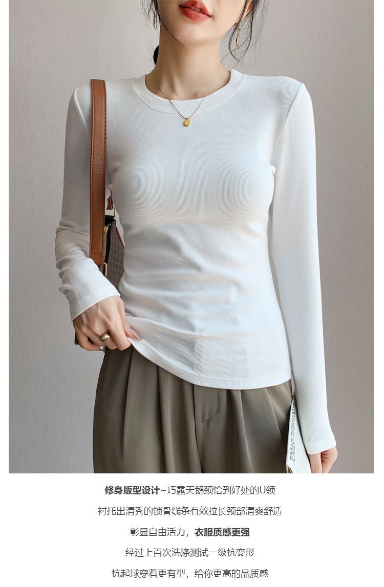 白の底のシャツの女性の2025新型の丸首の綿の長袖のtシャツは身を修める中に上着の春秋の金の洋風を掛けます。