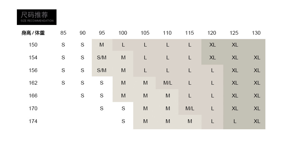 S 推奨 49kg 以内,M は 49-53.5kg をお勧めします,L 推奨 54-58.5kg,XL 推奨 59-63.5kg,2XL 推奨 64-68.5kg,3XL 推奨 69-75kg