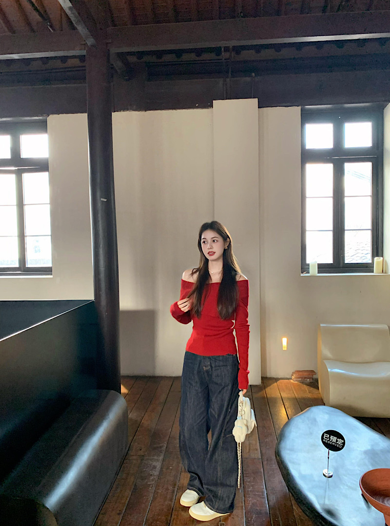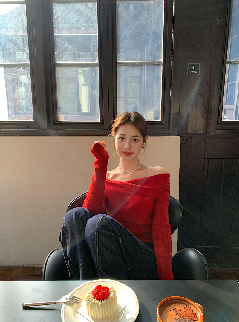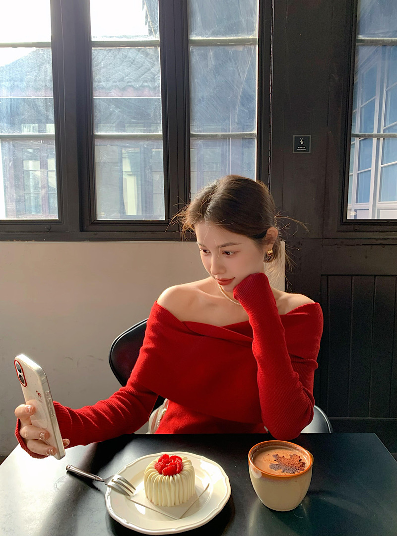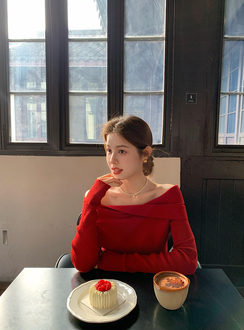 優しい雰囲気のワンショルダーニットセーター、レディース春物長袖、高級感のある柔らかく上品なデザイン、赤色のオフショルダーセーター