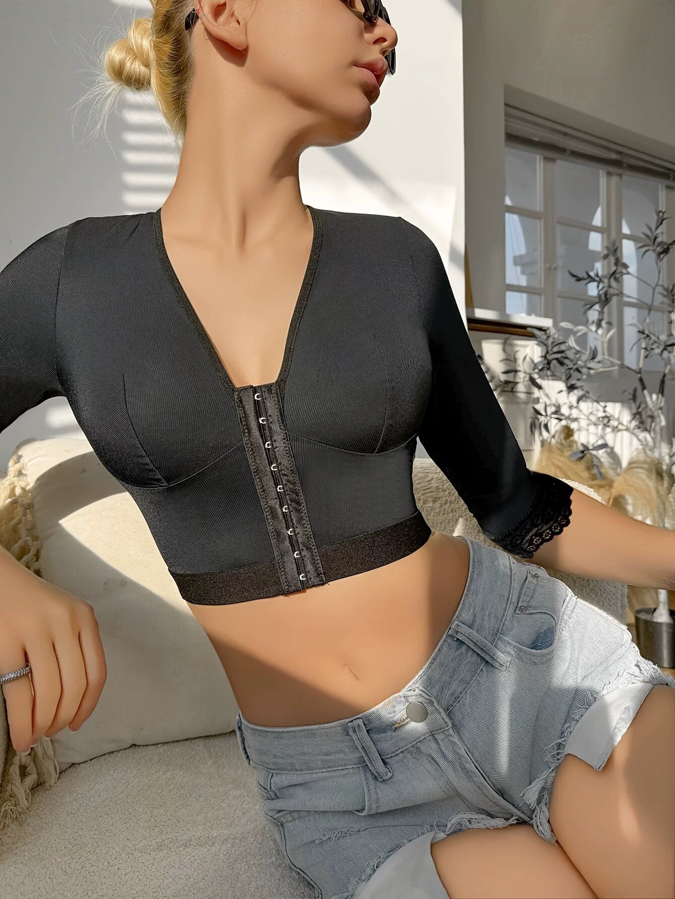 国境を越えた欧米のヨガの前ボタンの調整型の運動の外は美体を着て身の上着のレースの7分の袖の服を作ります。