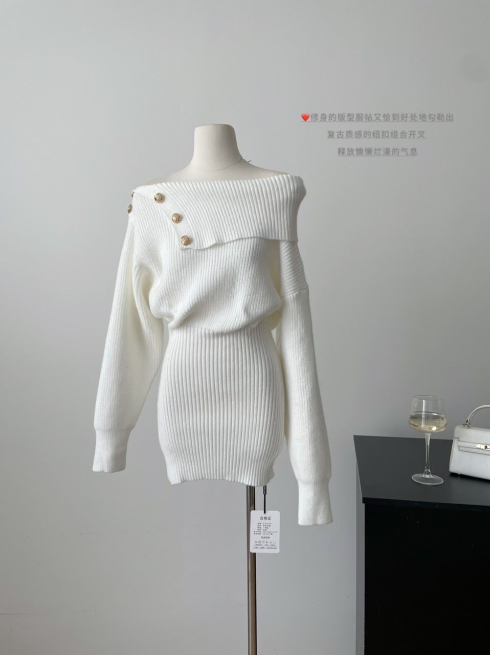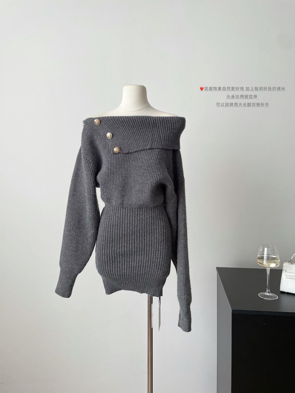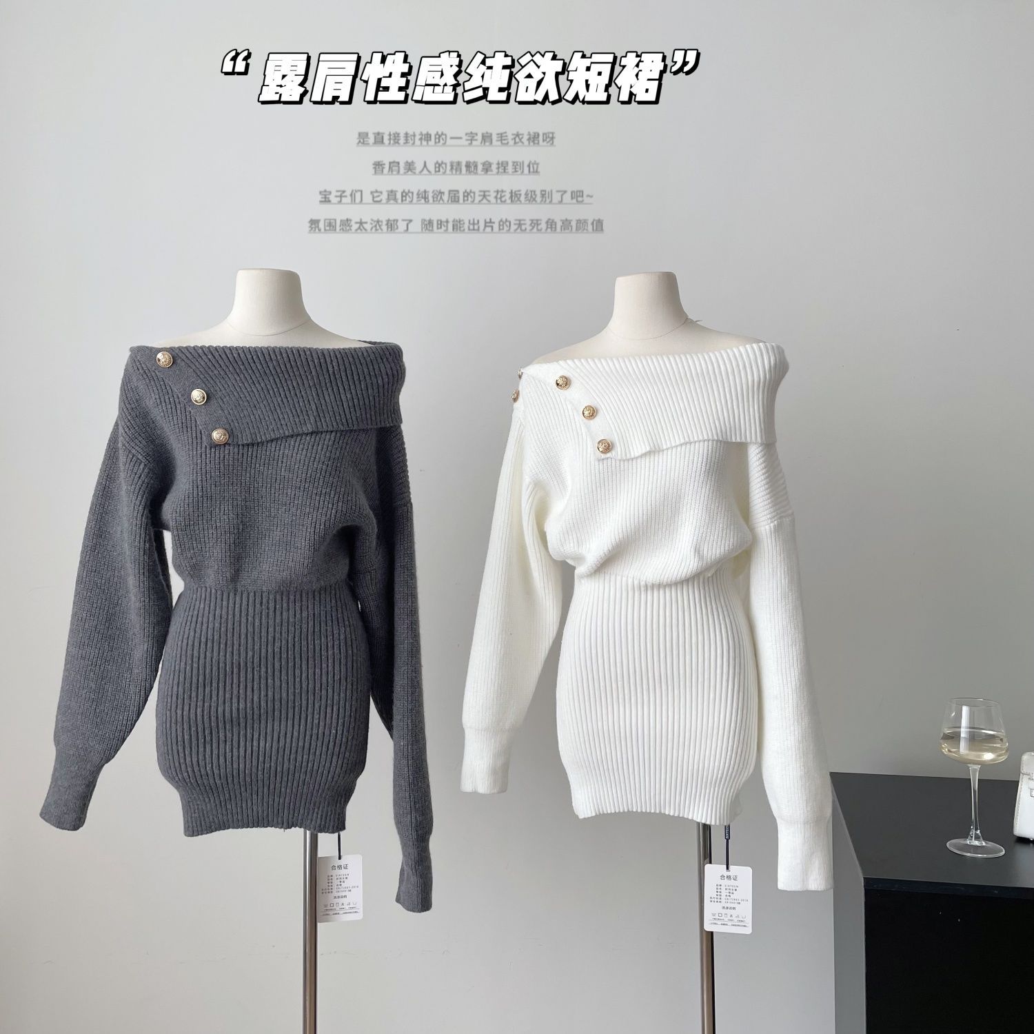 純欲風斜め肩長袖ニットワンピース女性春のスリムグレーのスカート