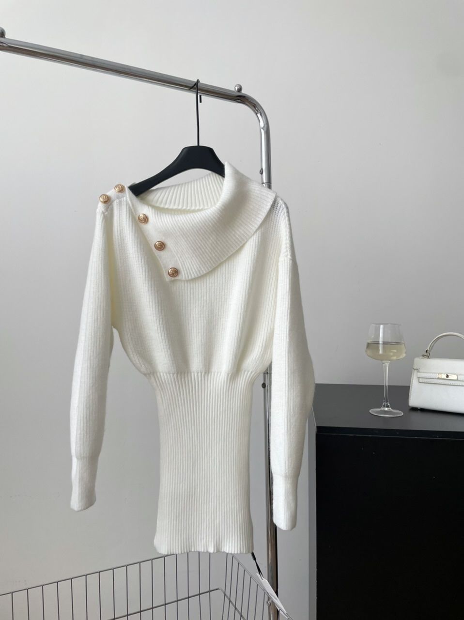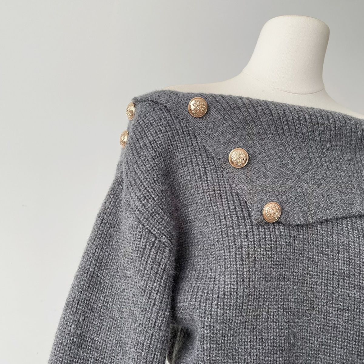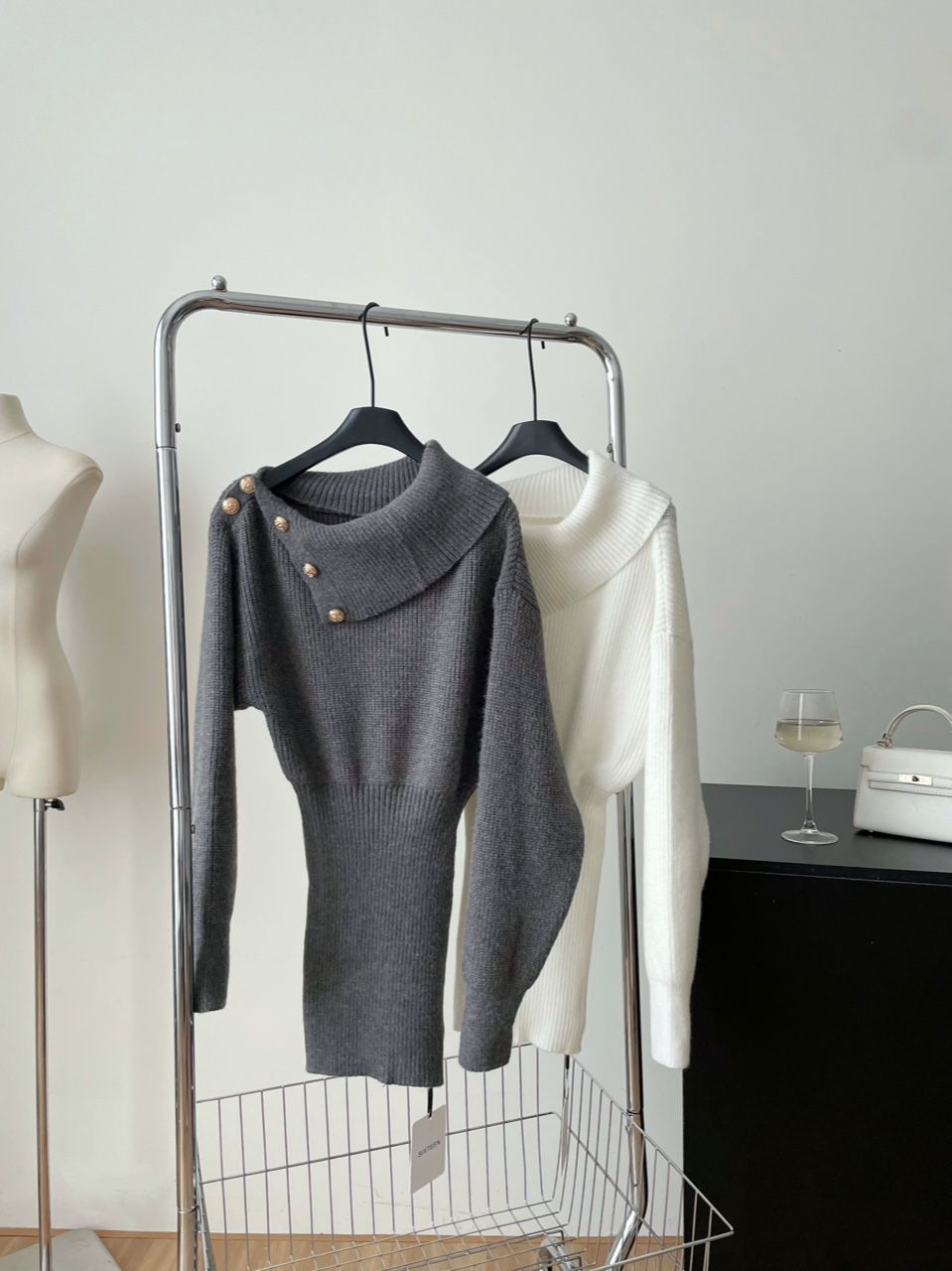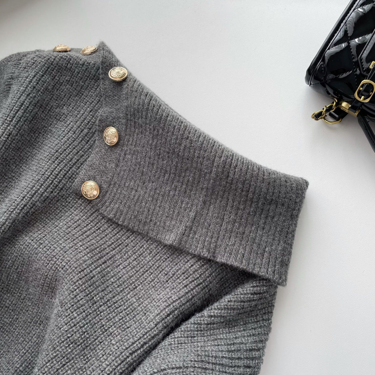 純欲風斜め肩長袖ニットワンピース女性春のスリムグレーのスカート