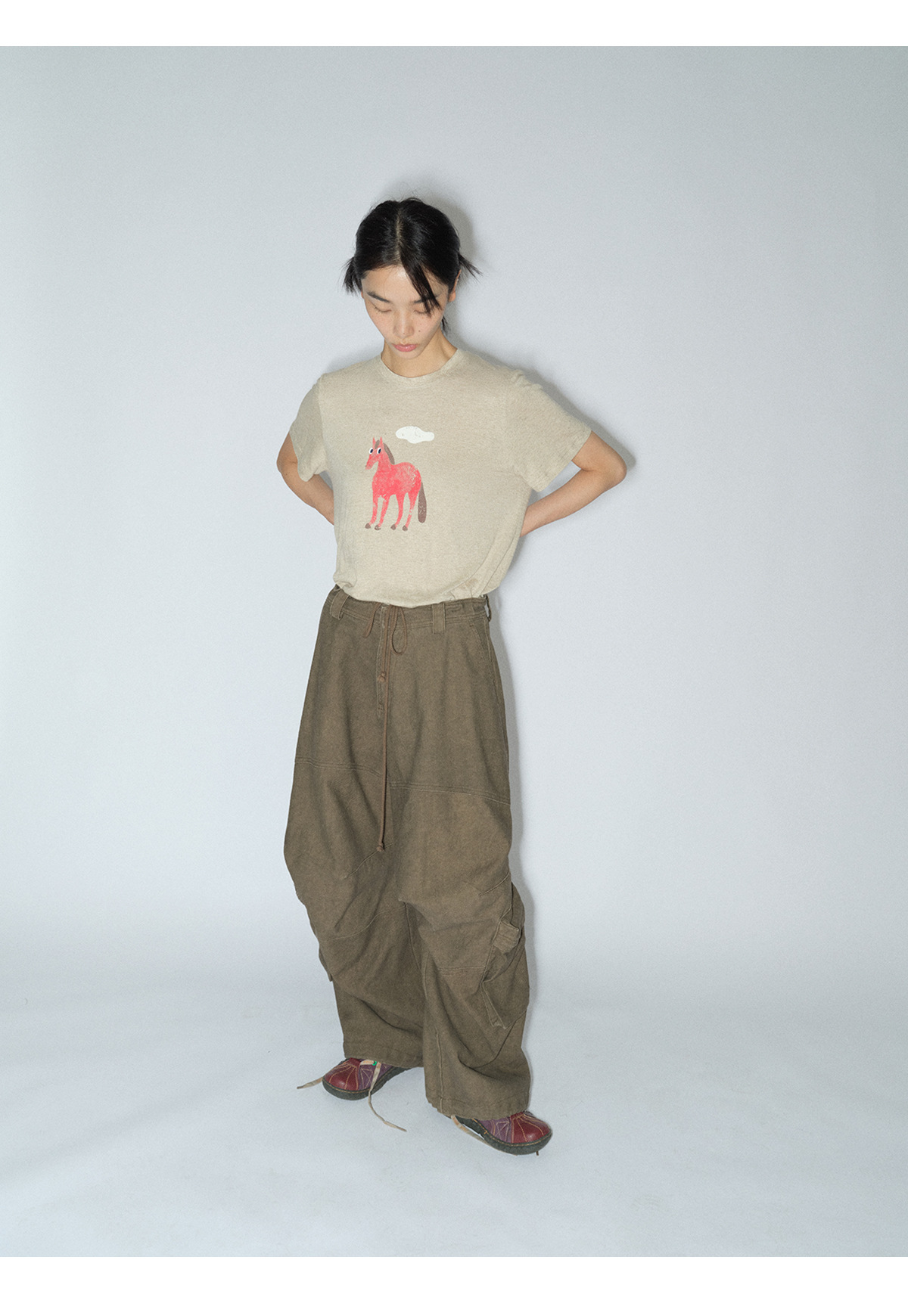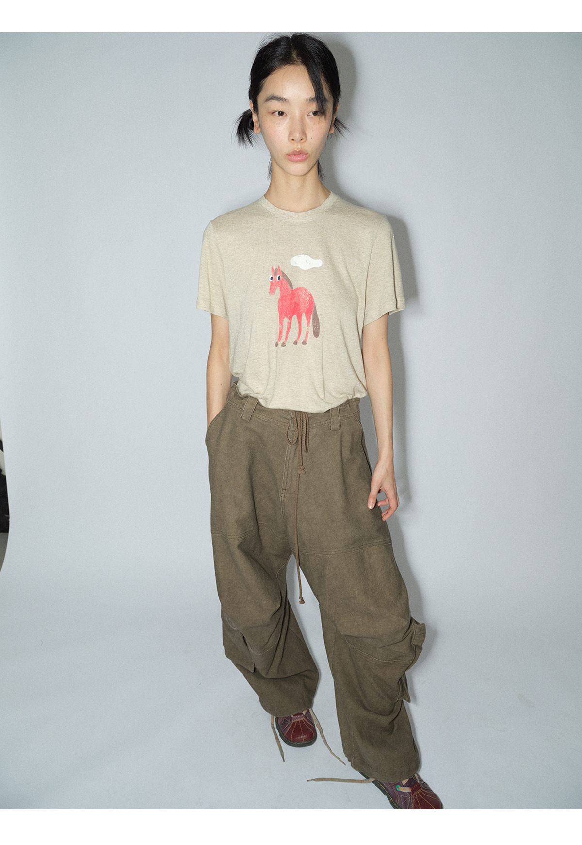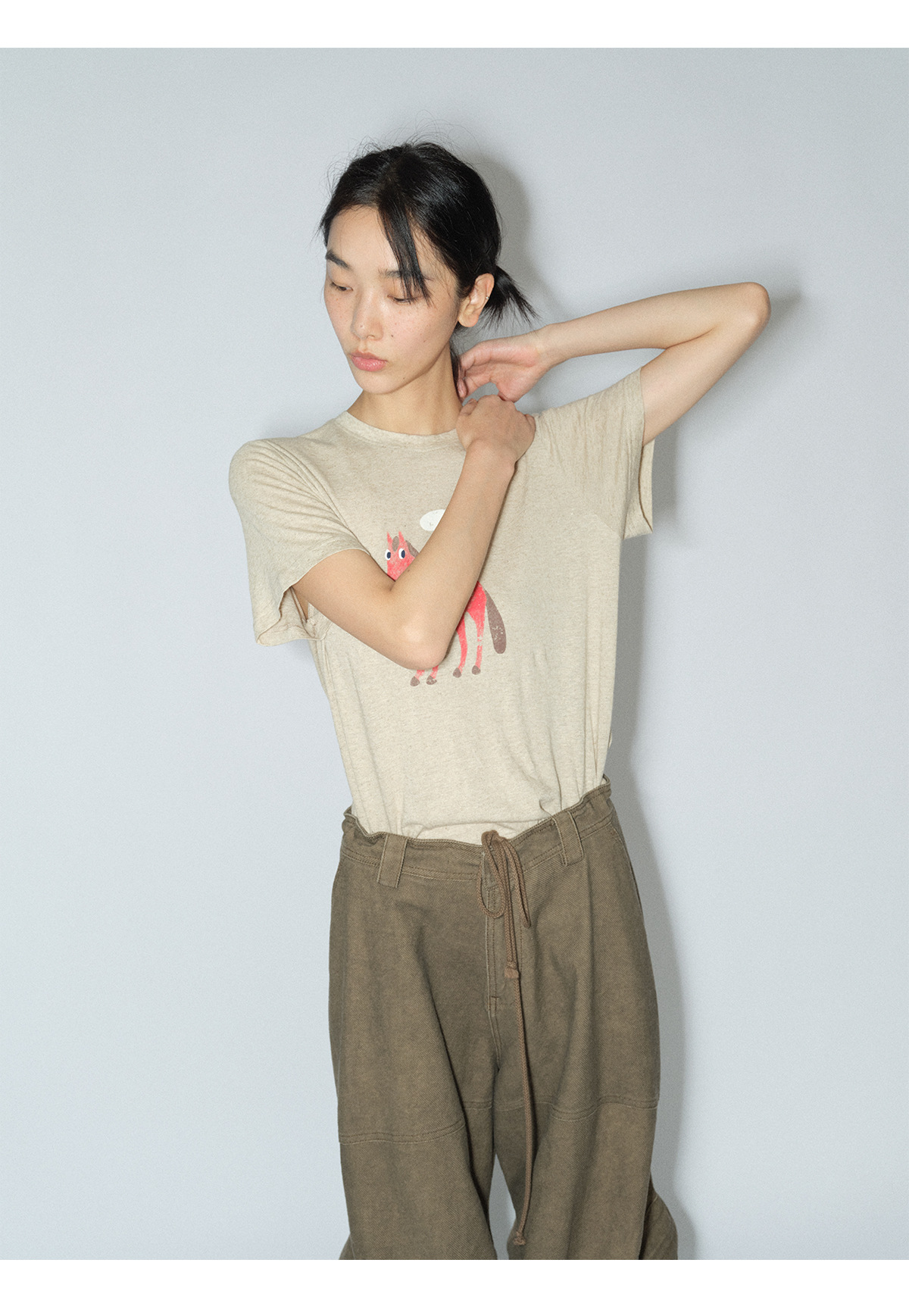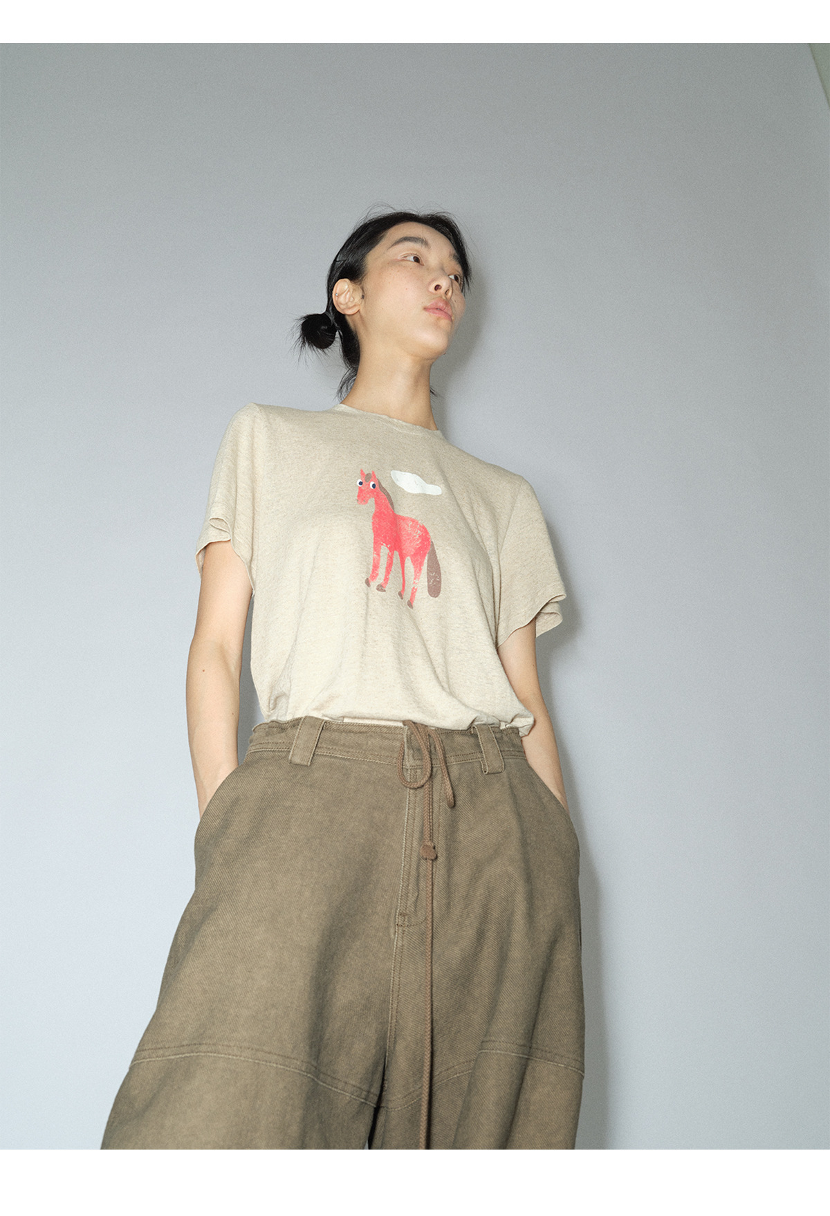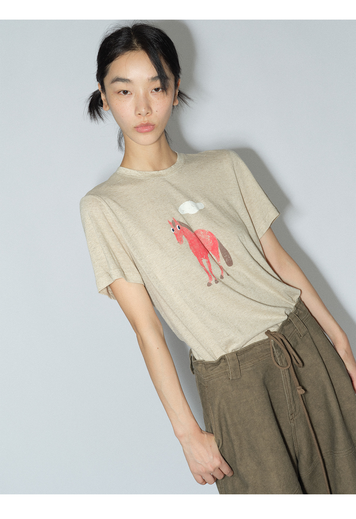 [知識時] 新商品の亜麻通気性ポニープリント丸襟半袖ゆったりカジュアルtシャツの上着の女性v 8208